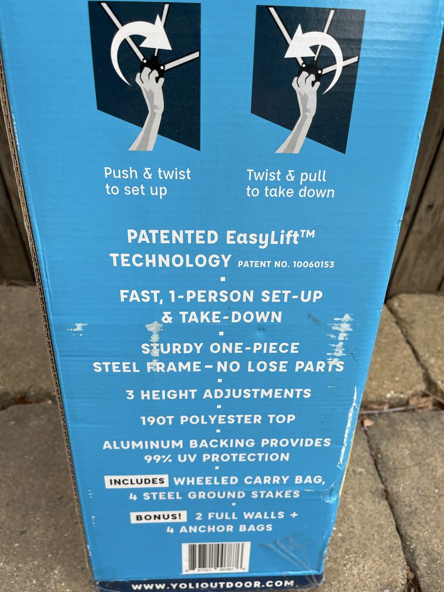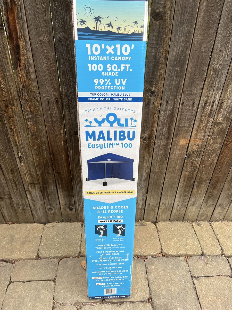 Venmo10’ by 10’ shade canopy Easy assemble Can add ‘shade walls’ Only used once Originally purchased from Big5 Sports