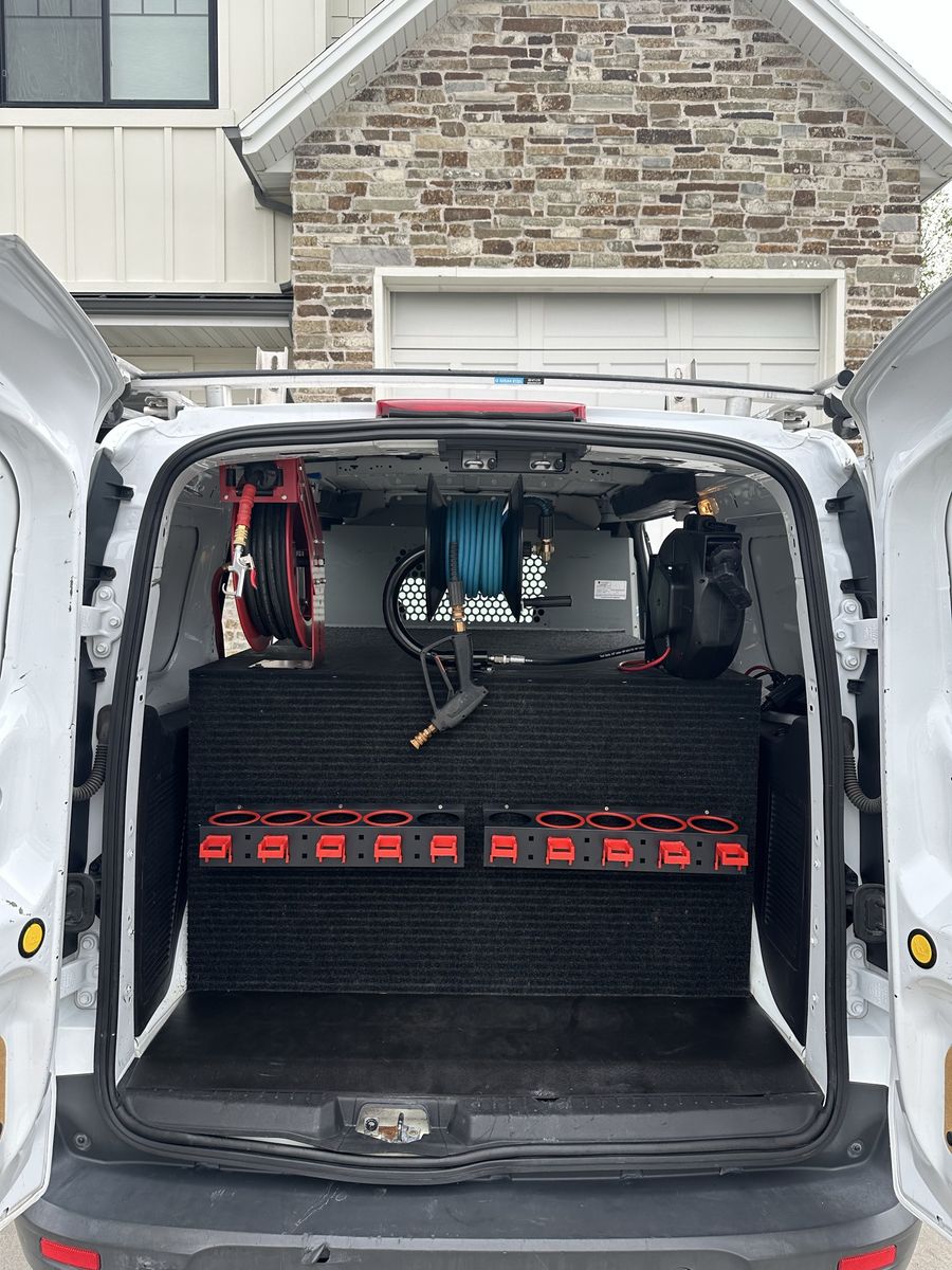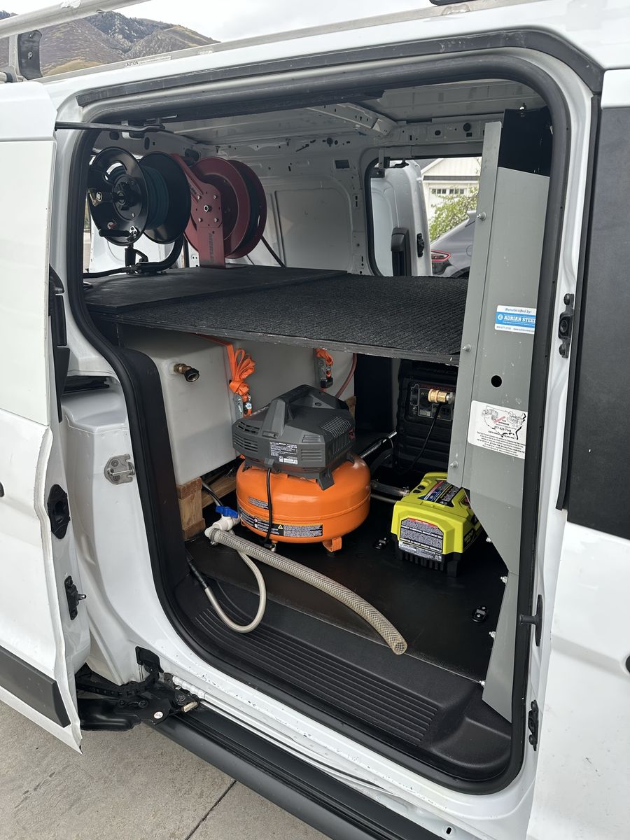 Built out detail van for mobile detailing (or window cleaning) business. This van comes with a built in water tank, generator, pressure washer, air compressor, outlets, and all of the reels for each of those. As well as spray bottle organization holders.