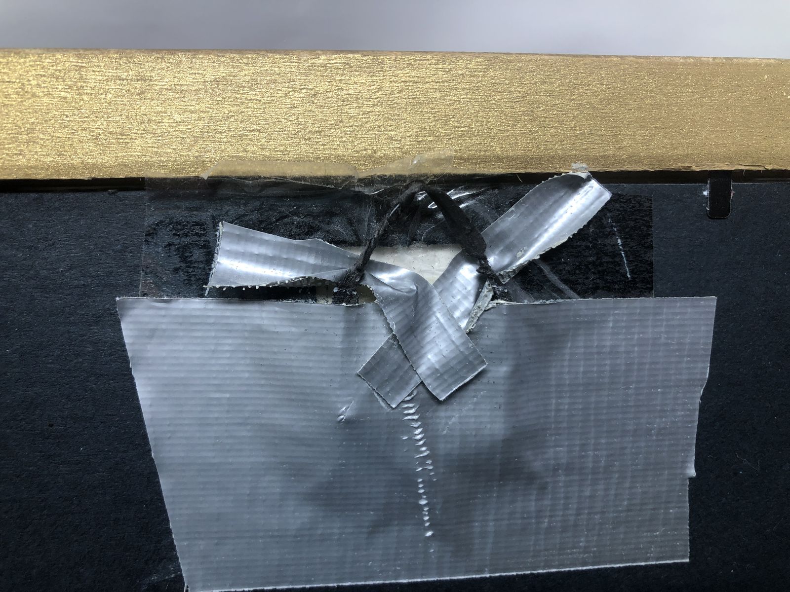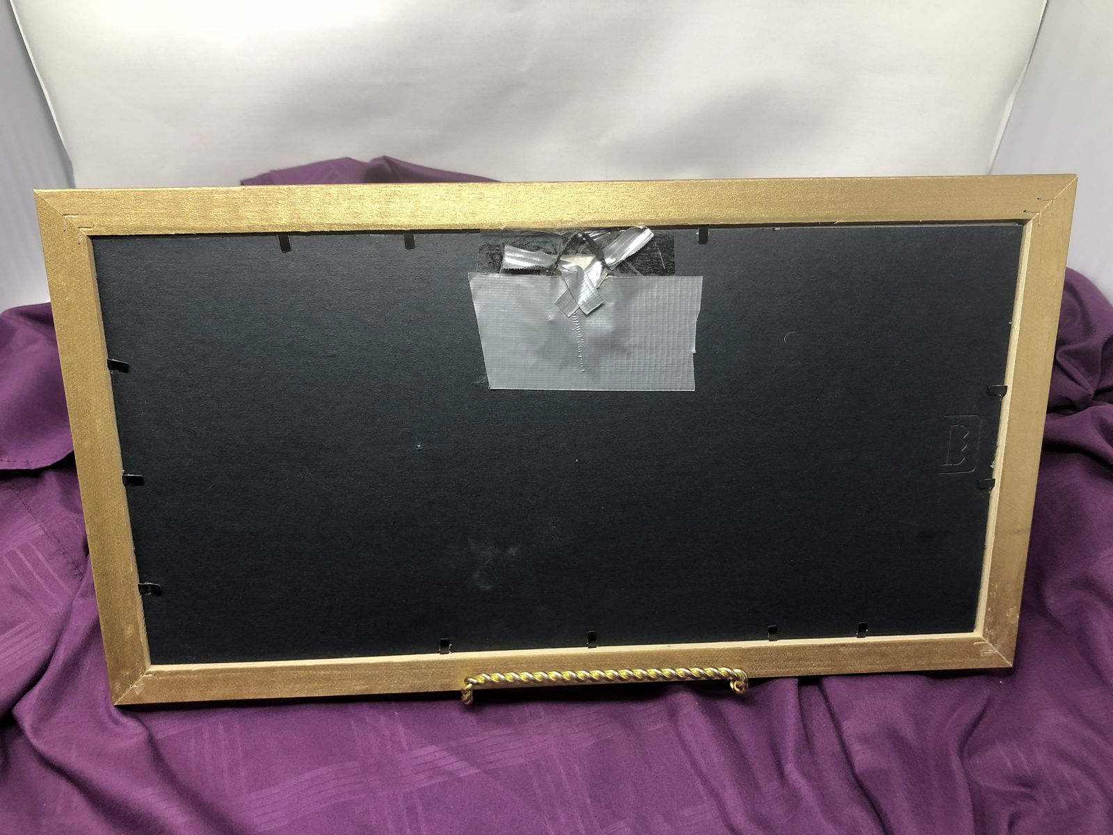 Condition: The front of the piece and the frame are in excellent condition. The back features a DIY hanging wire secured with duct tape, which is fully functional but mentioned for transparency.