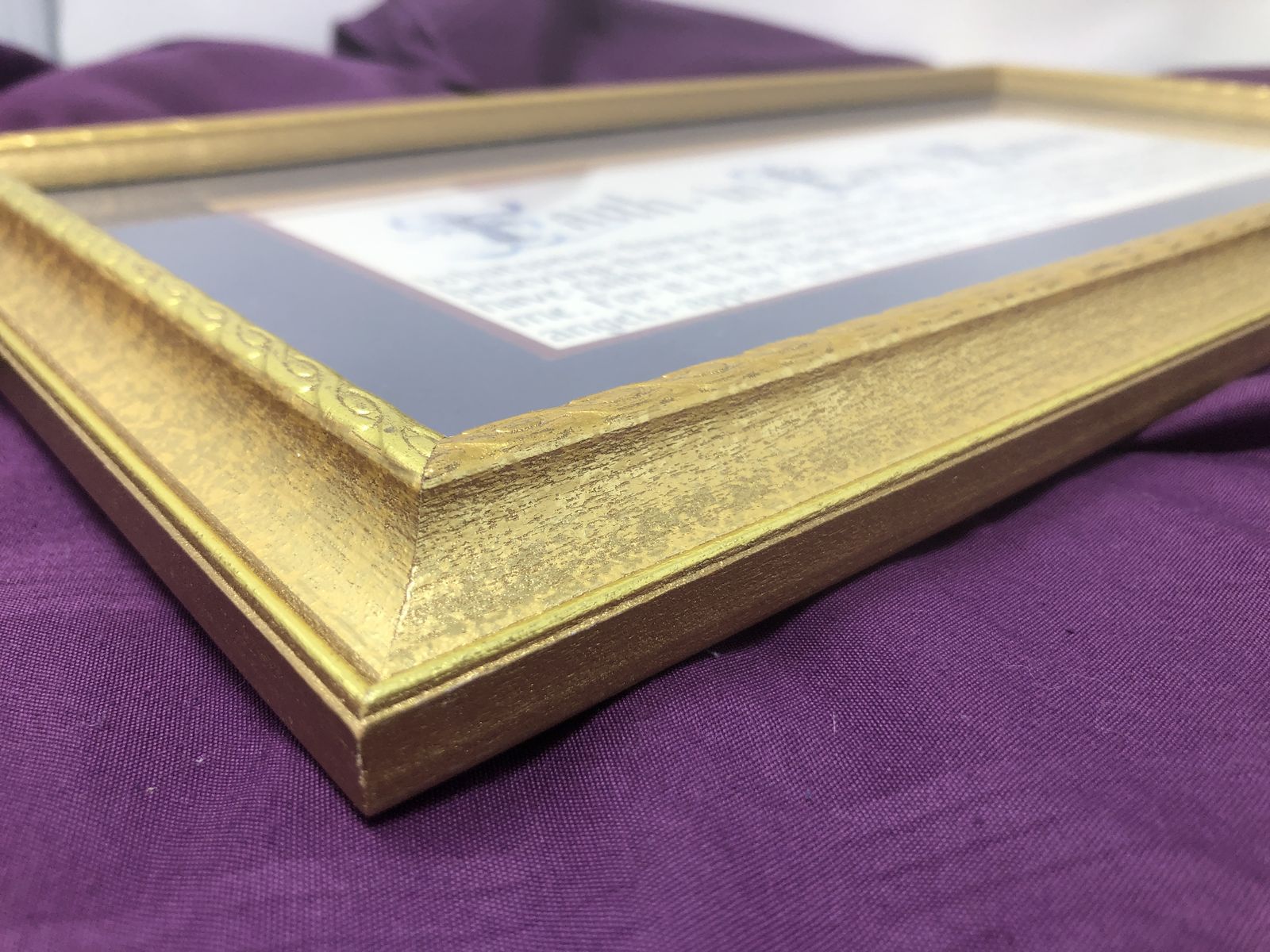 Framing: Professional triple-matted design (navy blue, burgundy, and cream) housed in a gold-finished wooden frame with ornate detailing.