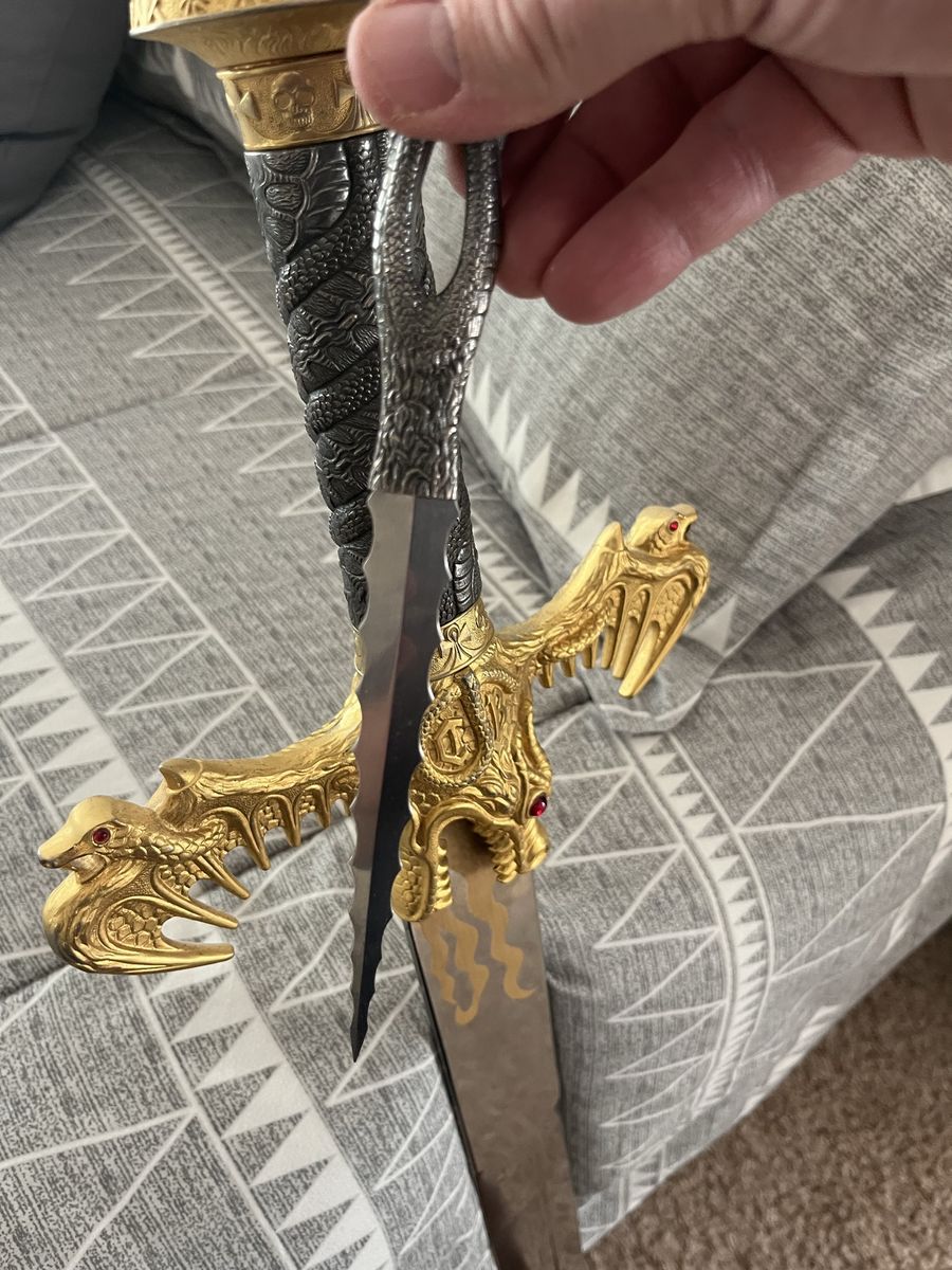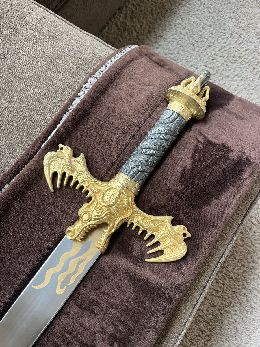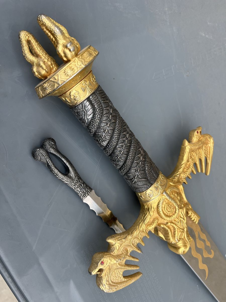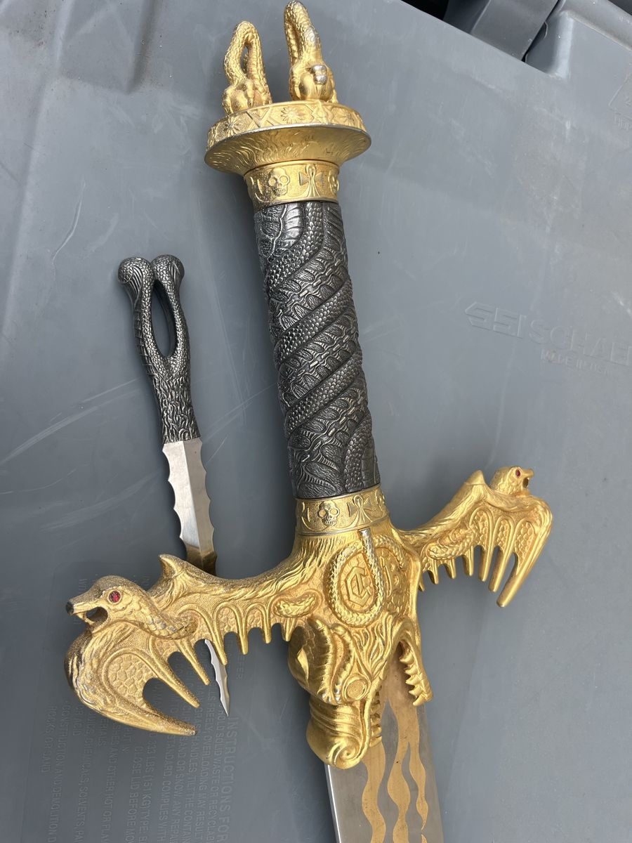 Dragon Flame sword with the dagger from Spain. With a detachable dagger, see pictures for more details 48 inches long, 2 inches and a quarter wide at its widest point, the dagger is 8 inches long