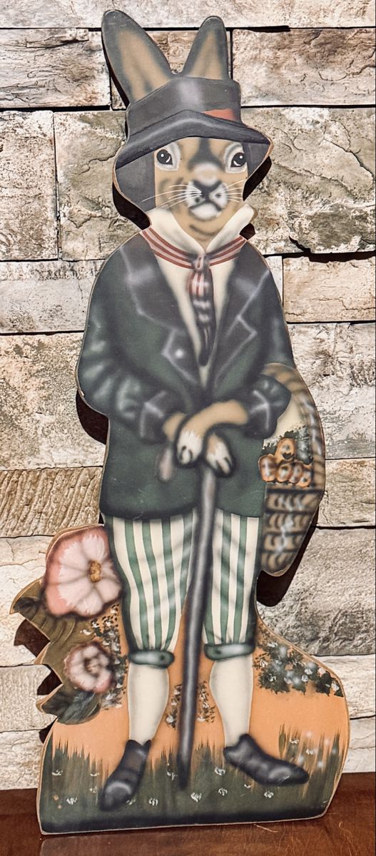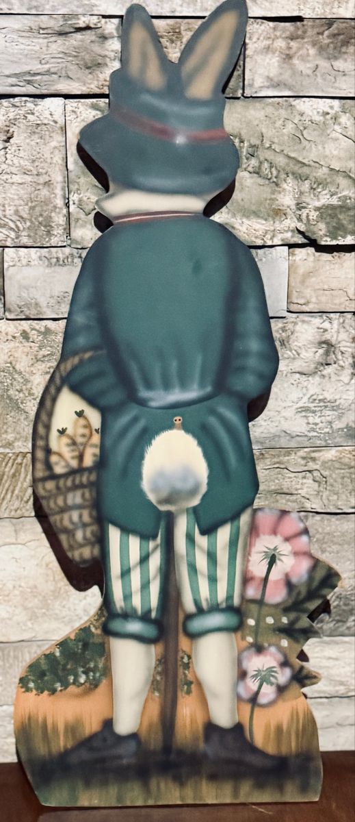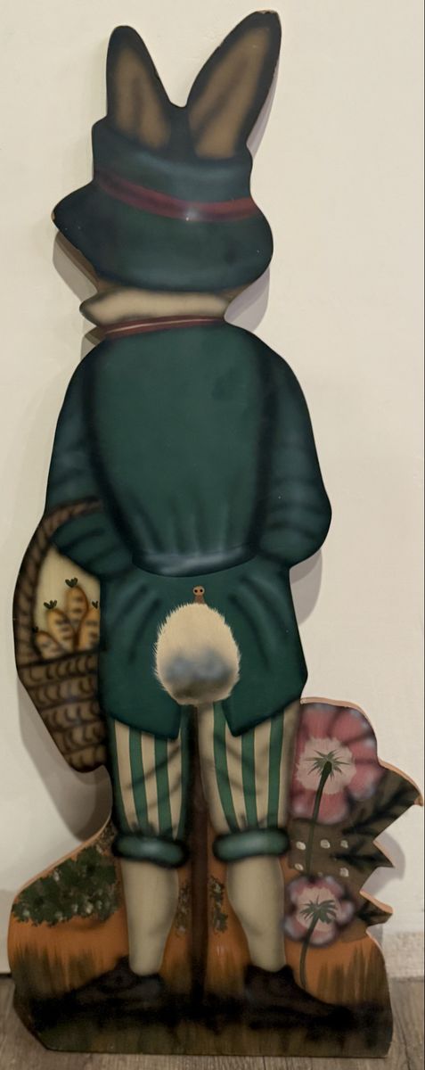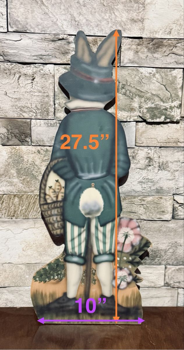 VenmoSuper cute vintage-style Easter bunny wood cutout. Stands approximately 27.5” tall and about 10” wide. Double-sided design with nice detail and color on both front and back. Great for Easter decor, entryway display, porch decoration, or seasonal setup. Lightweight and easy to place anywhere. In good overall condition with normal light wear from use.