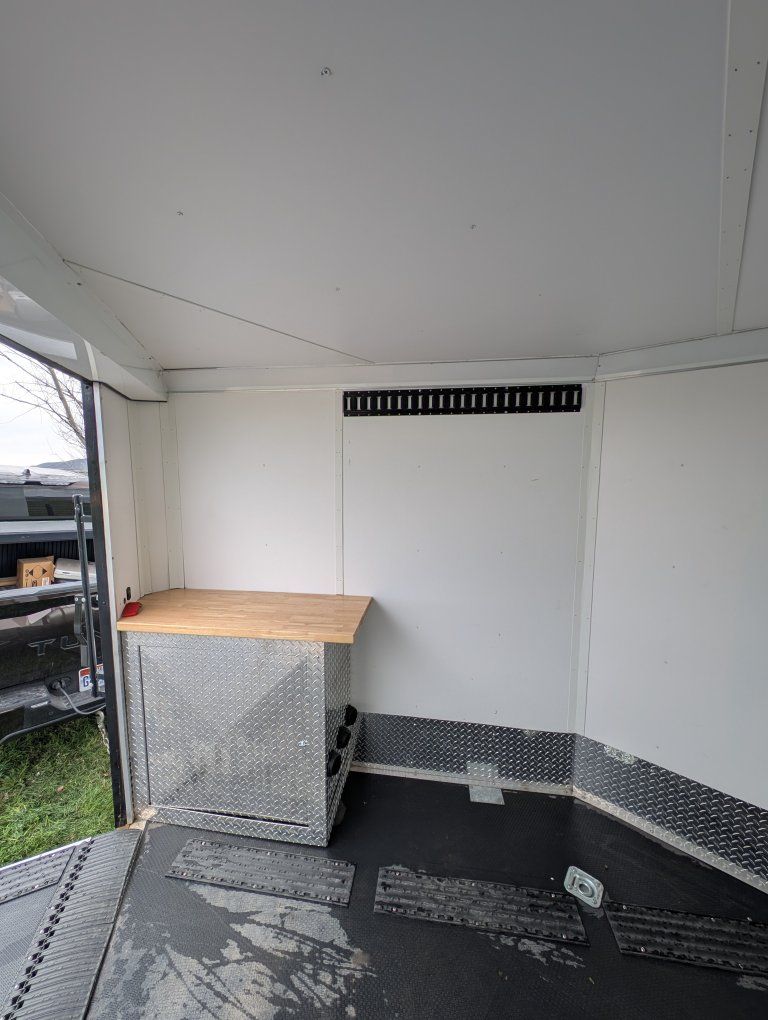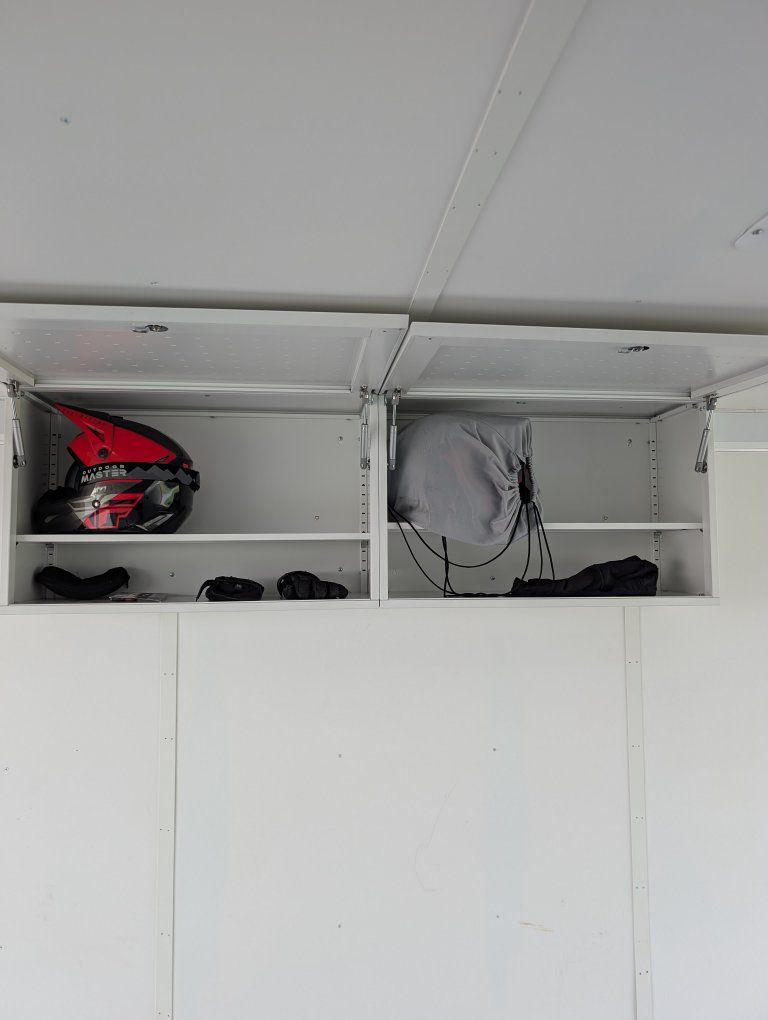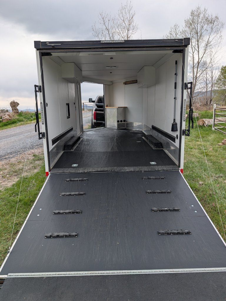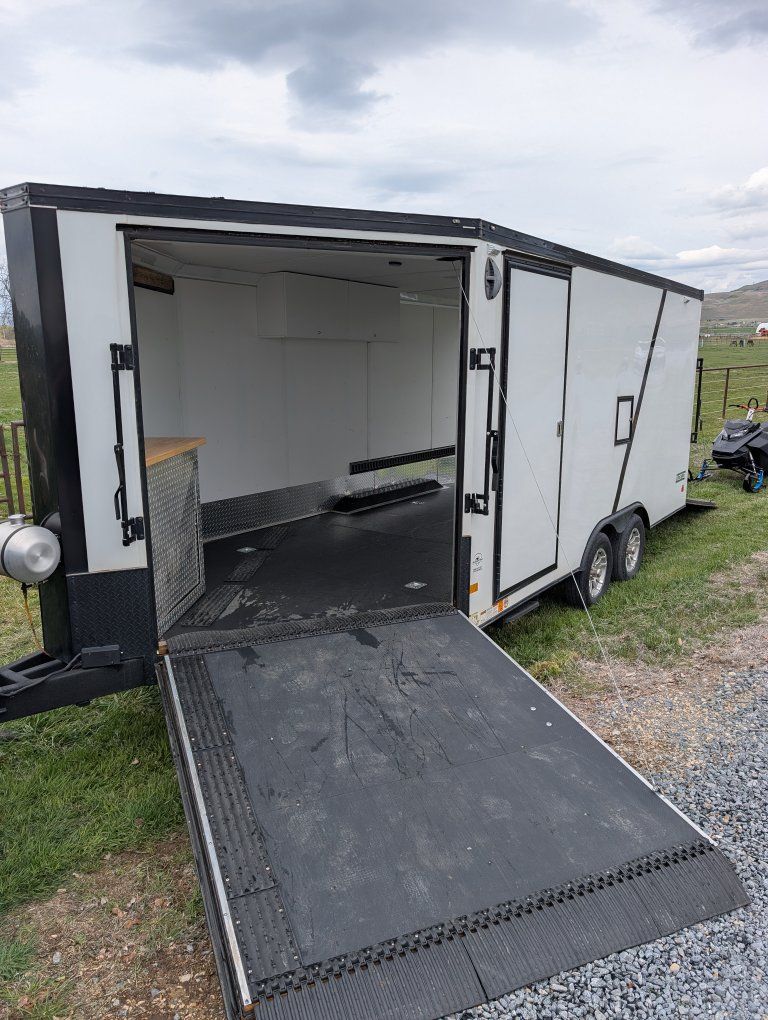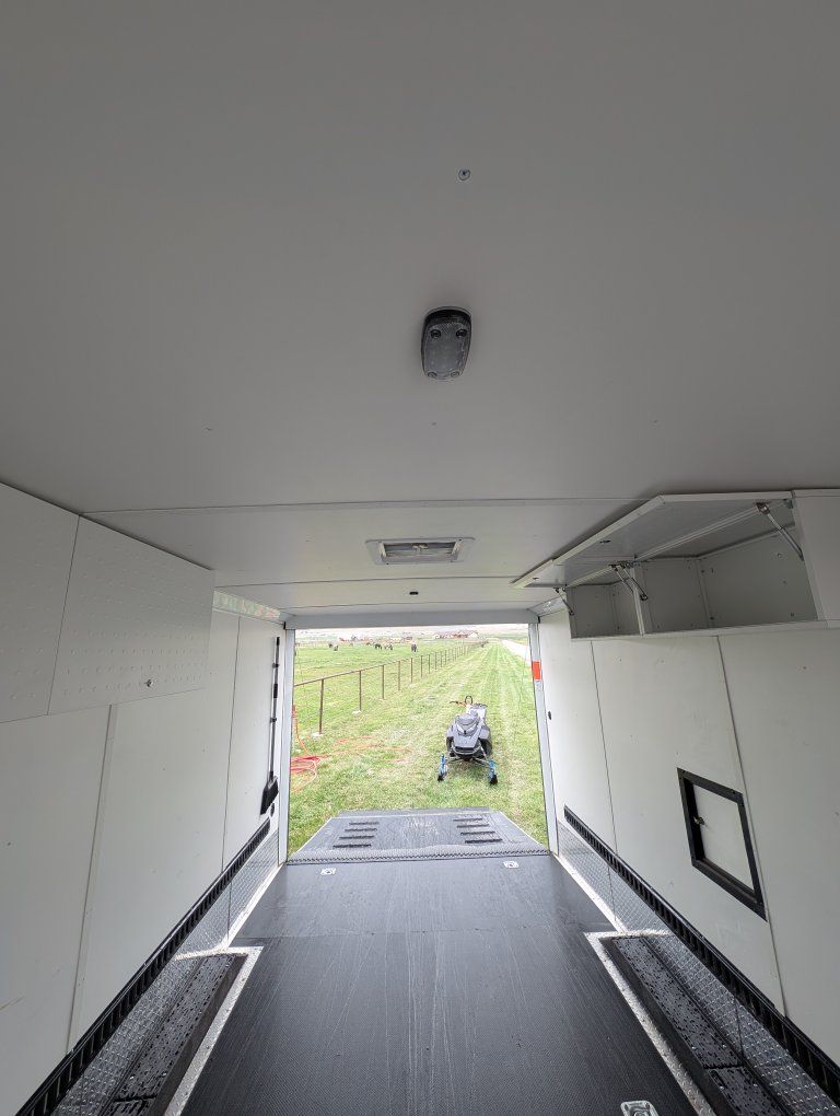 Here is my slightly used enclosed snowmobile trailer. I've got 4 mountain sleds in but it's tight, but has the capacity for 3 comfortably. Factory polyboard Four cupboards for helmets and gloves. Front cabinet houses a diesel heater and is plubed to the diesel tank outside. I have more caliber cleets and ski guides that can go with it.