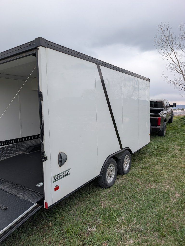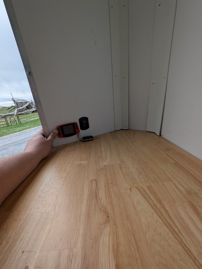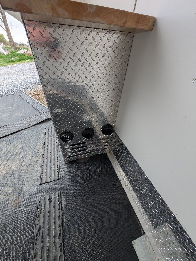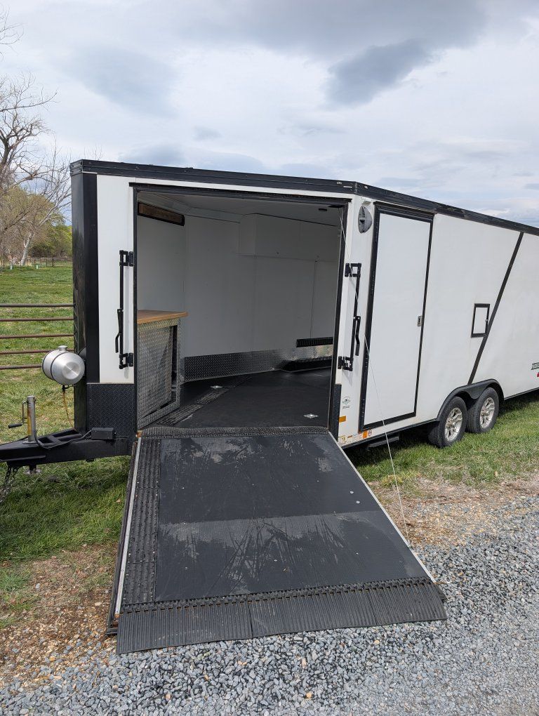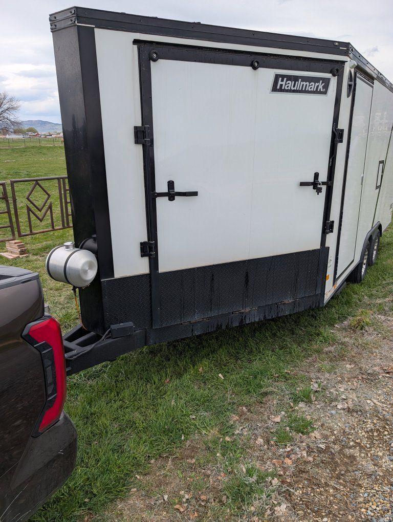 Here is my slightly used enclosed snowmobile trailer. I've got 4 mountain sleds in but it's tight, but has the capacity for 3 comfortably. Factory polyboard Four cupboards for helmets and gloves. Front cabinet houses a diesel heater and is plubed to the diesel tank outside. I have more caliber cleets and ski guides that can go with it.