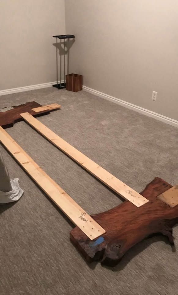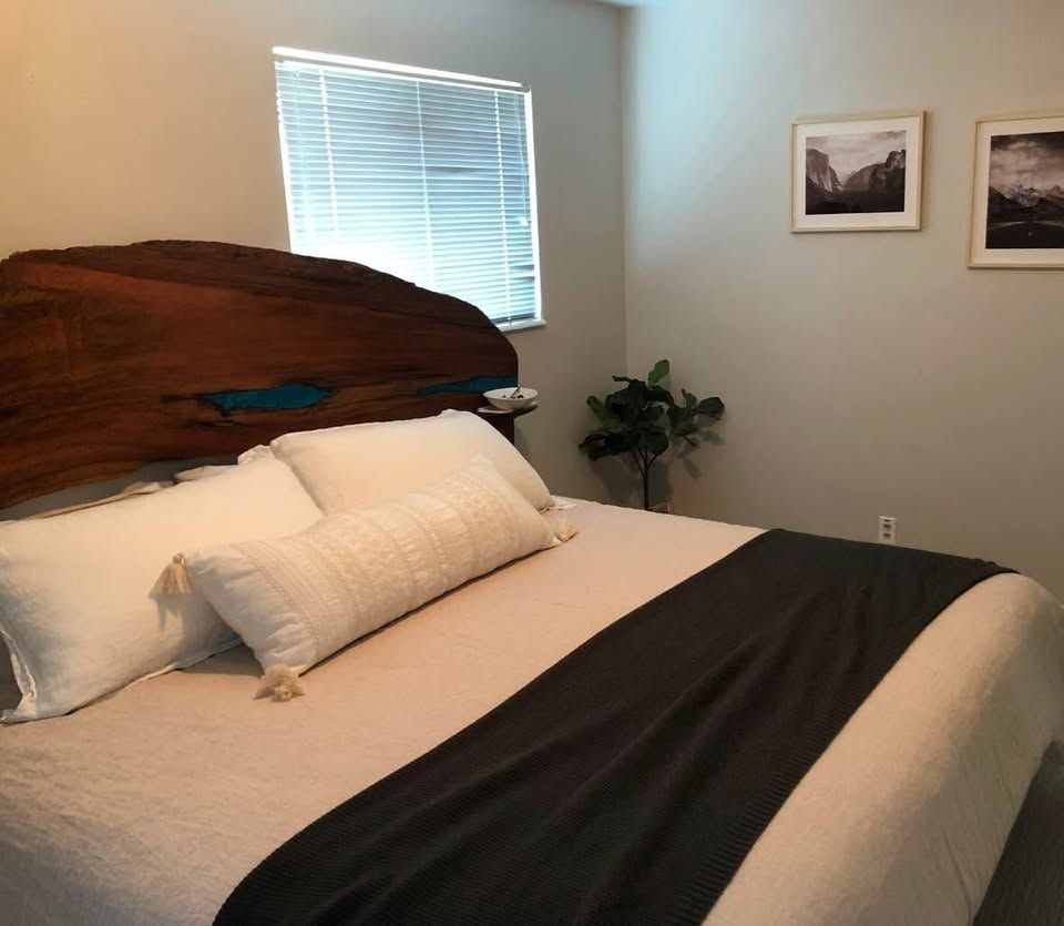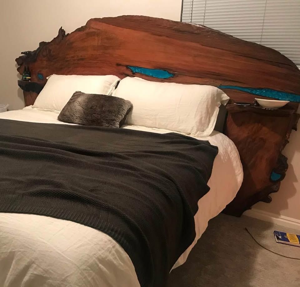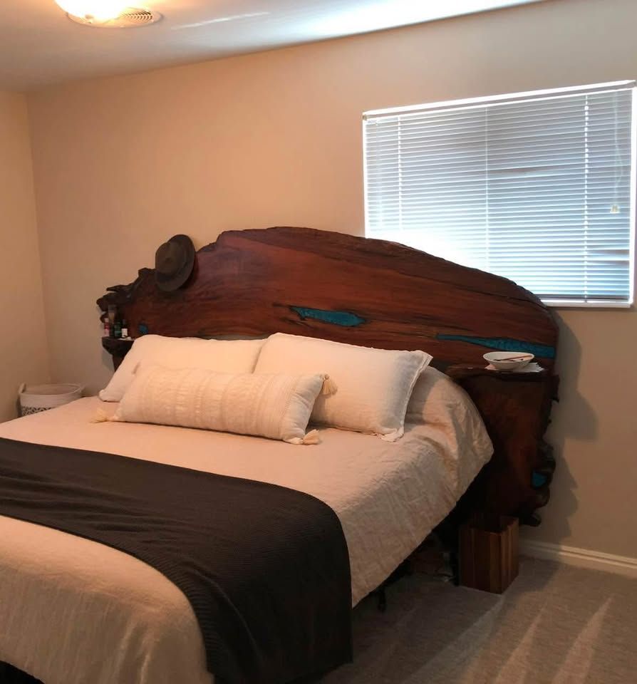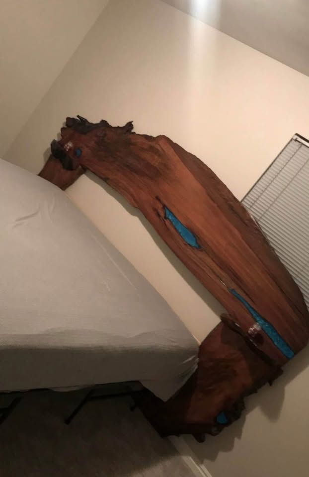 VenmoHome crafted redwood headboard with blue epoxy accents and removable small side shelves. Great condition and love it! Downsizing and unable to keep it. It's currently disassembled but easy to assemble again, happy to show you if you're seriously interested.