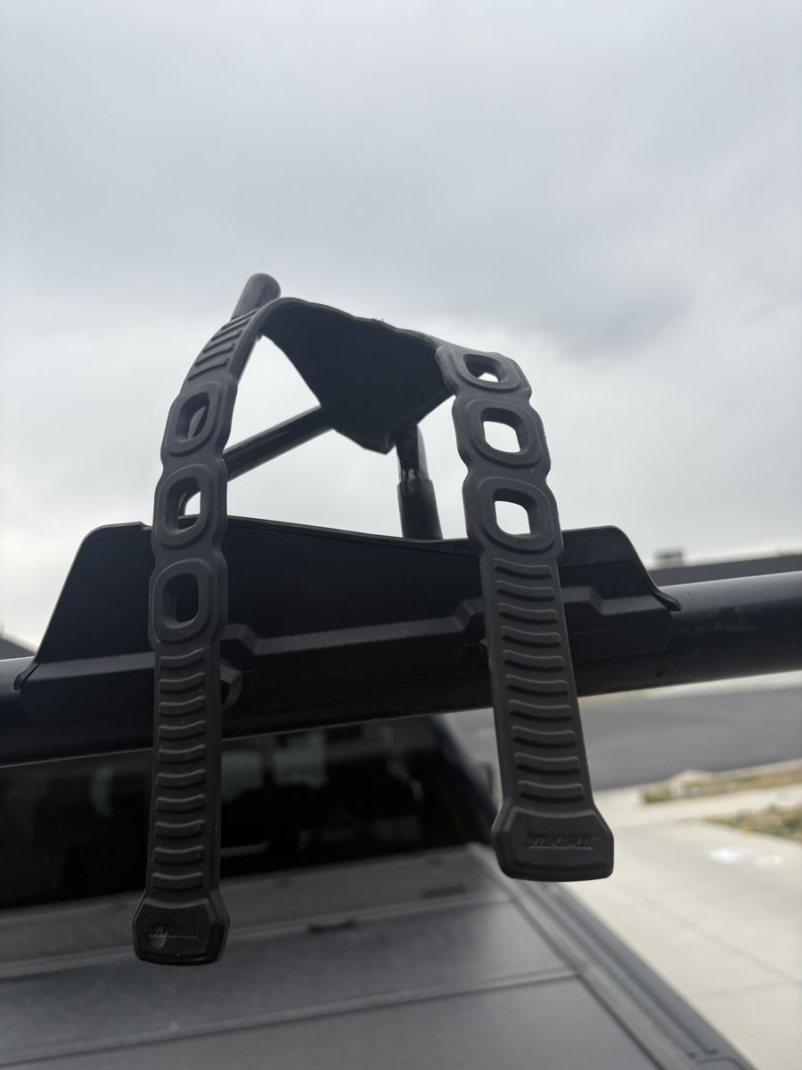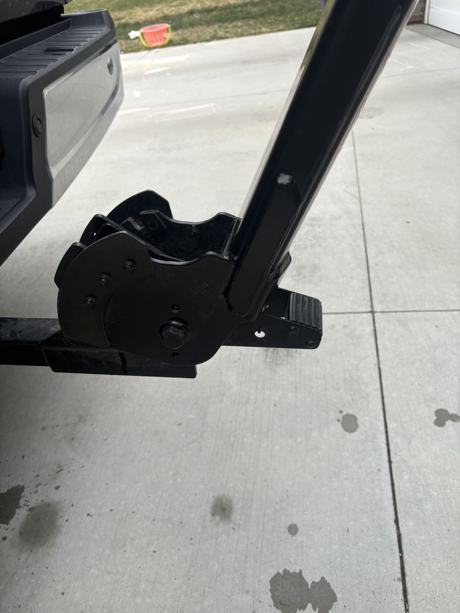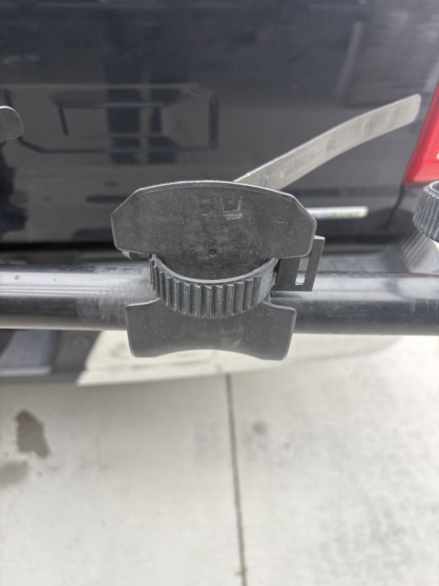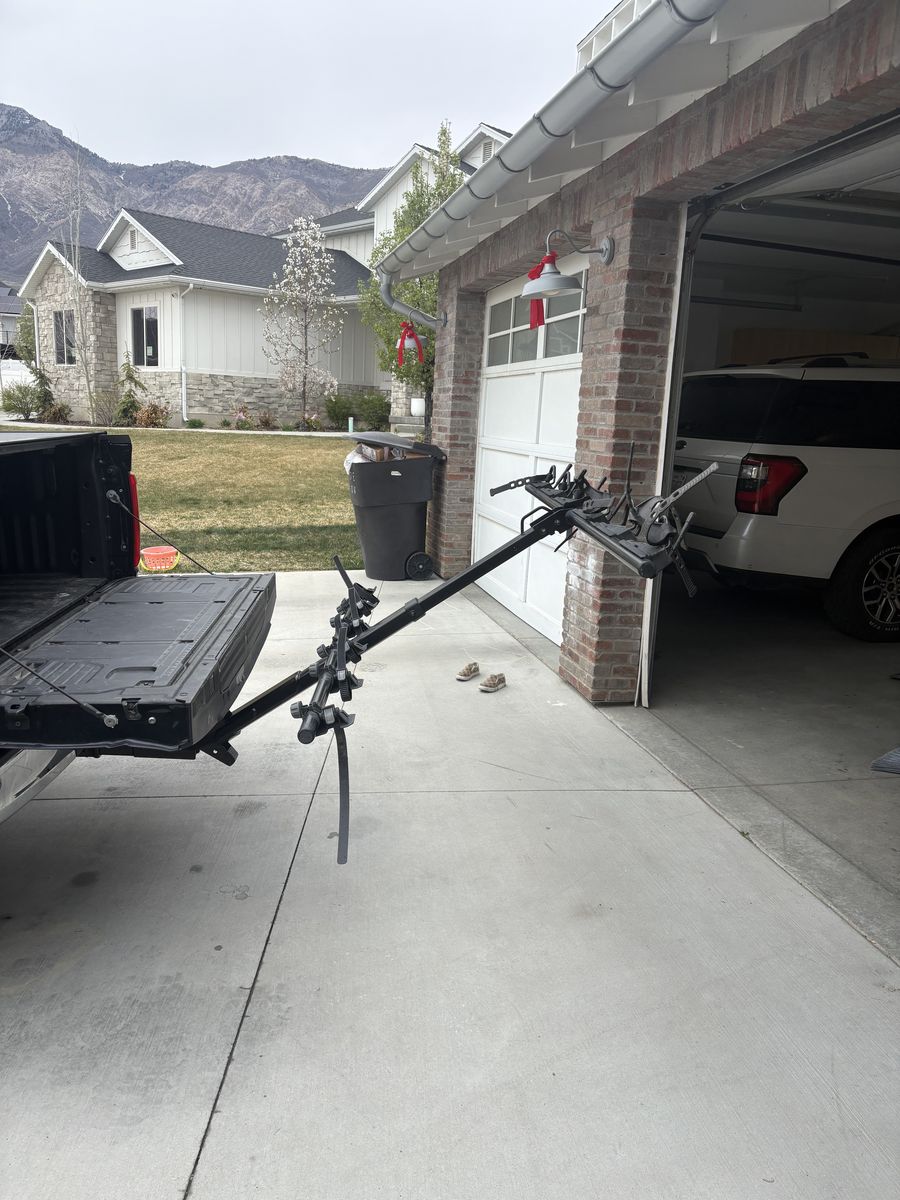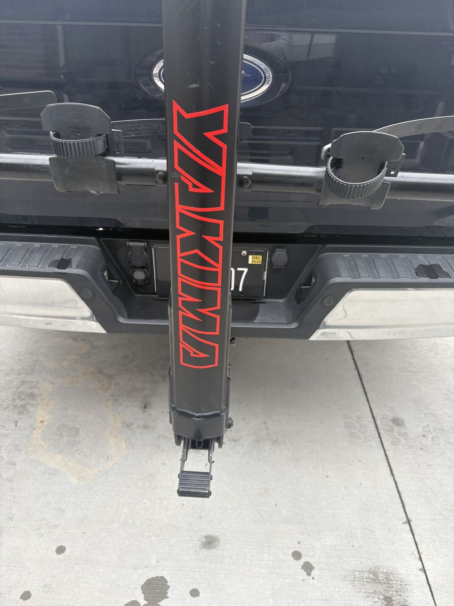 This is great vertical bike carrier/rack. Holds 6 bikes, with suspension forks. I like that it is lightweight, I can install it by myself on the car. It lays down so you open a tail gate of either an suv, or a truck. You can easily remove the horizontal arms for easier storage as well. In good condition, always kept inside, has all of the straps, I had to modify one to fit my kids bike, so instead of two straps it’s just one. You can easily buy a replacement.