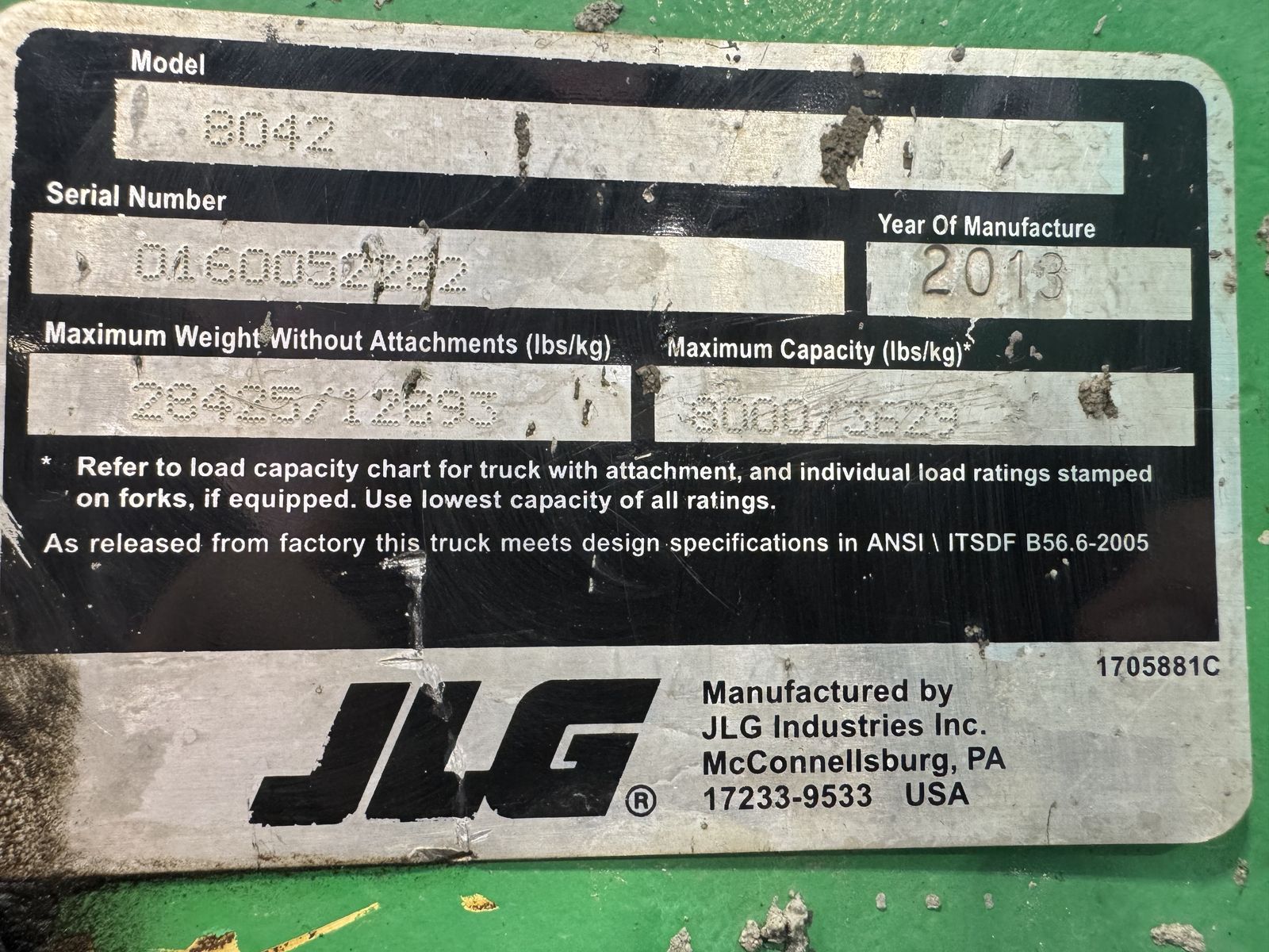 YEAR: 2013 MAKE: SKYTRAK/JLG MODEL: 8042 HOURS: 5175 S/N: 0160052282 TYPE: TELESCOPIC FORK LIFT MAX LIFT: 8000 LBS MAX REACH: 41 FT FORK LENGTH: 6 FT