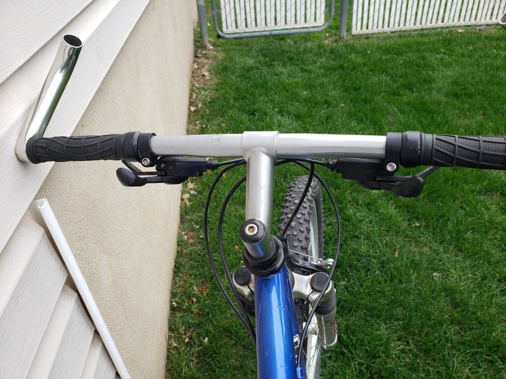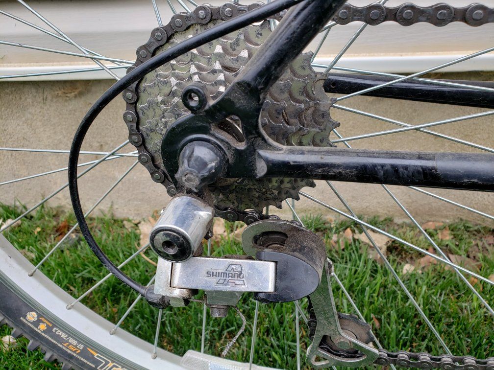 This is a 17" medium steel frame mountain bike. Everything works fine. Tires are good. Our son has just outgrown it. Shimano Altus rear derailleur. 21 speed rapid fire shifters.