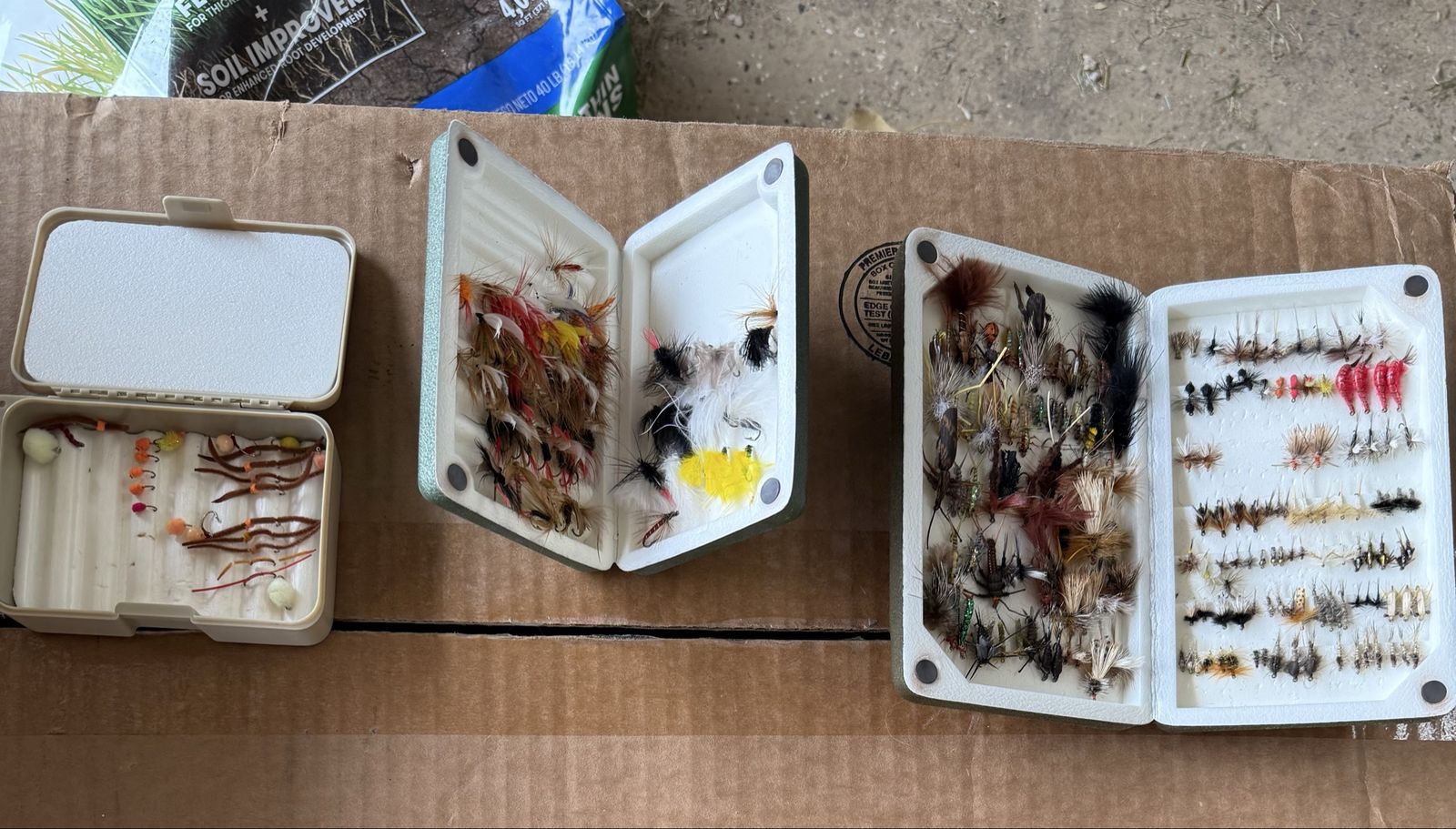Some are hand tied by local fishermen, some are from local shops, some from out of state shops, and the others I got from who knows where along the way. Not selling individual flies. Selling them by the fly box.