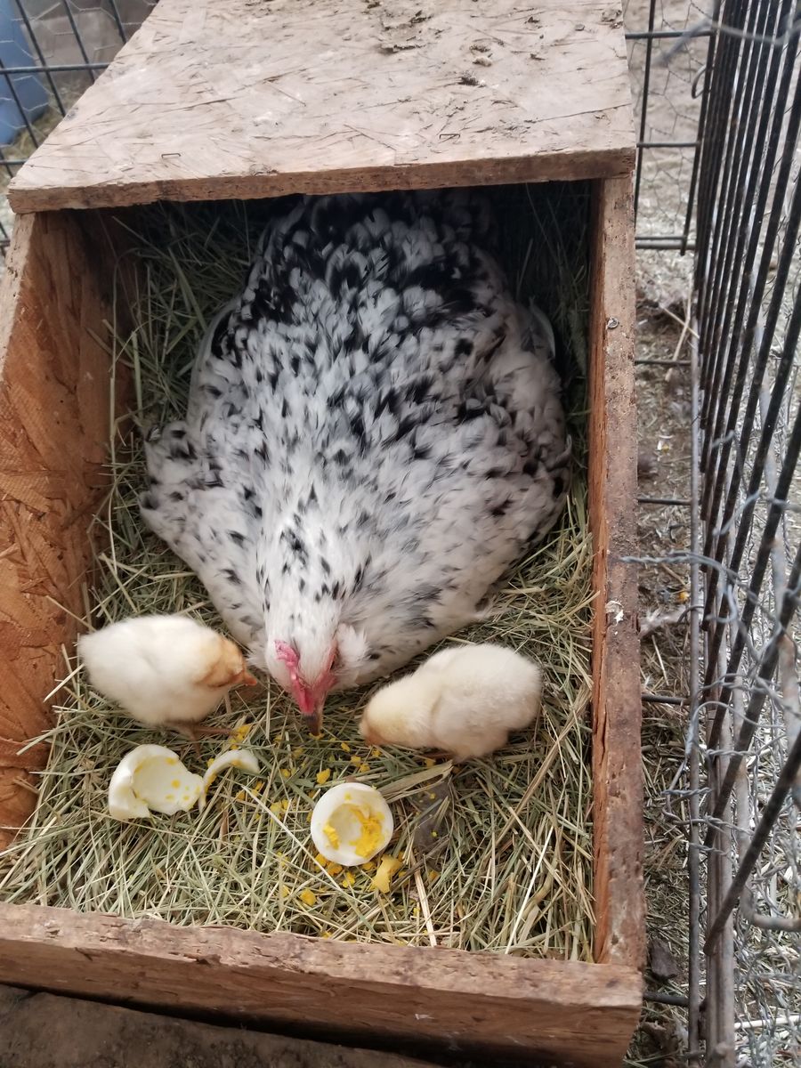 This sweet 1.5 year old hen is the last of my Bantams. She is with 4 chicks. The chicks can be included. The chicks are out of different Bantam hens. Please only respond if you can add her to a flock with Bantams or smaller hens or if you want to start a flock along with the chicks. She is a free ranger. Would make a great hen for a backyard setting. Good layer. Last picture is the rooster, he is an Appenzeller Spitzhauben. Some of the chicks show a little mohawk bump. They all have feathery legs. They are 3 days old.