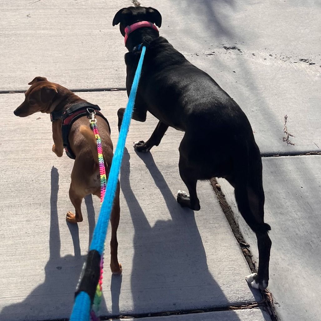 Cherry walks nicely on a leash, knows her sit command, and has been great with early-teen kids. She’s polite when left alone at home—no mischief here!