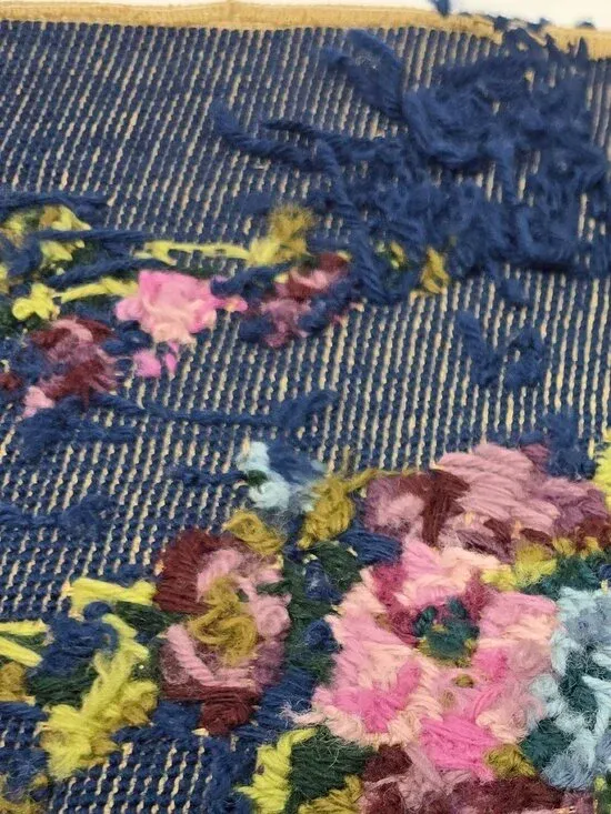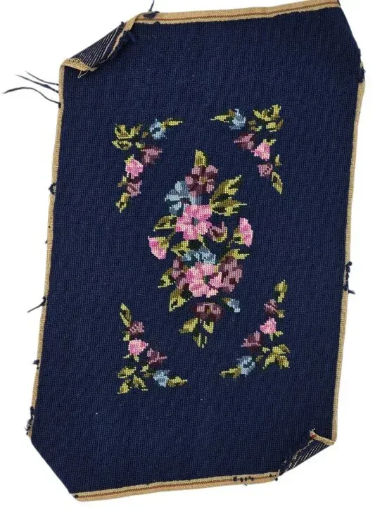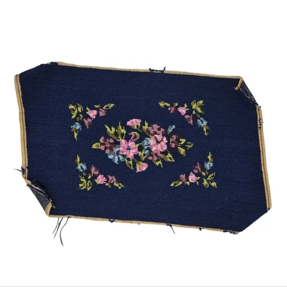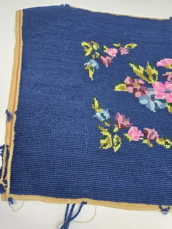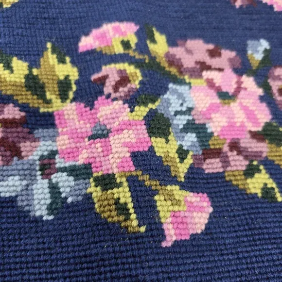 VenmoVintage Needlepoint Floral Panel Unfinished Wool Canvas 23x15 DIY Upholstery Excellent Used Condition - unfinished, slightly needs blocking/straightening from storage Navy Blue, light blue, pink, green