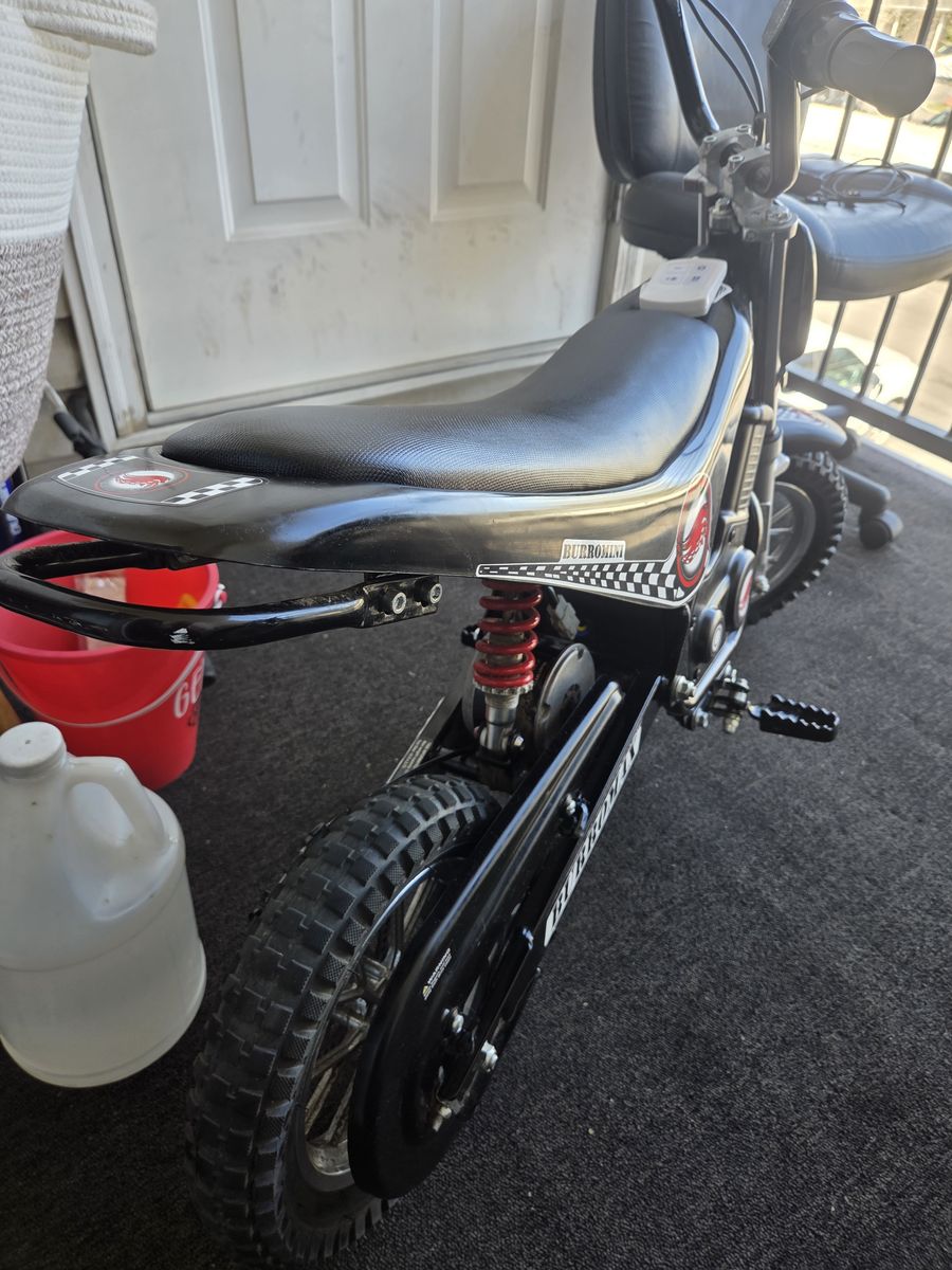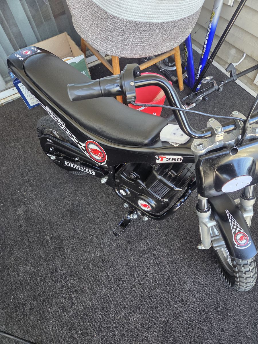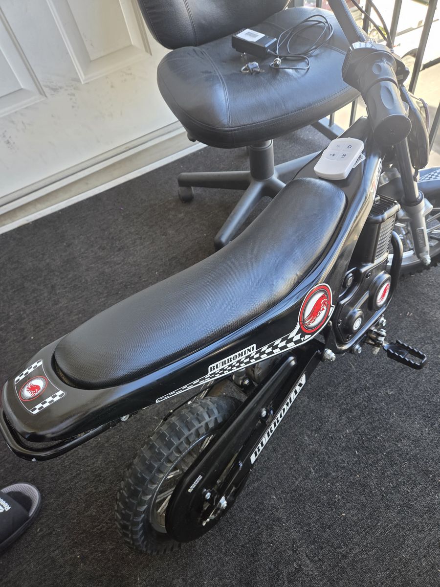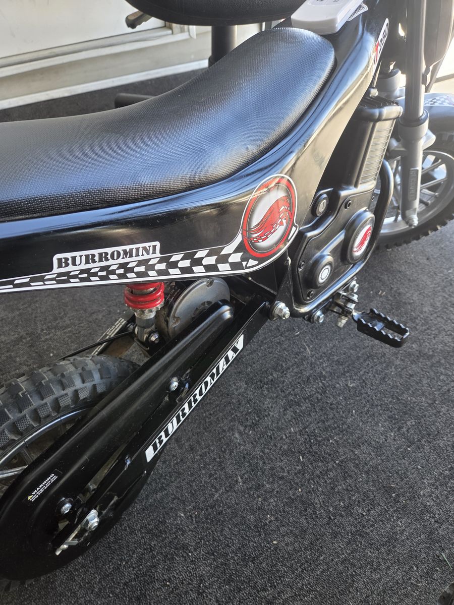 Black Burromax TT250 electric mini bike has a 250W motor and 24V battery system. It comes with a keyed ignition, battery level indicator on the throttle, and a charging port. The bike features a long padded seat, folding footpegs, and off-road tires. It is a compact size for younger riders or pit bike use.Everything works in perfect condition.