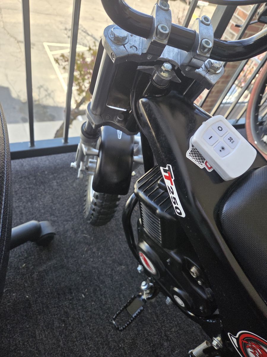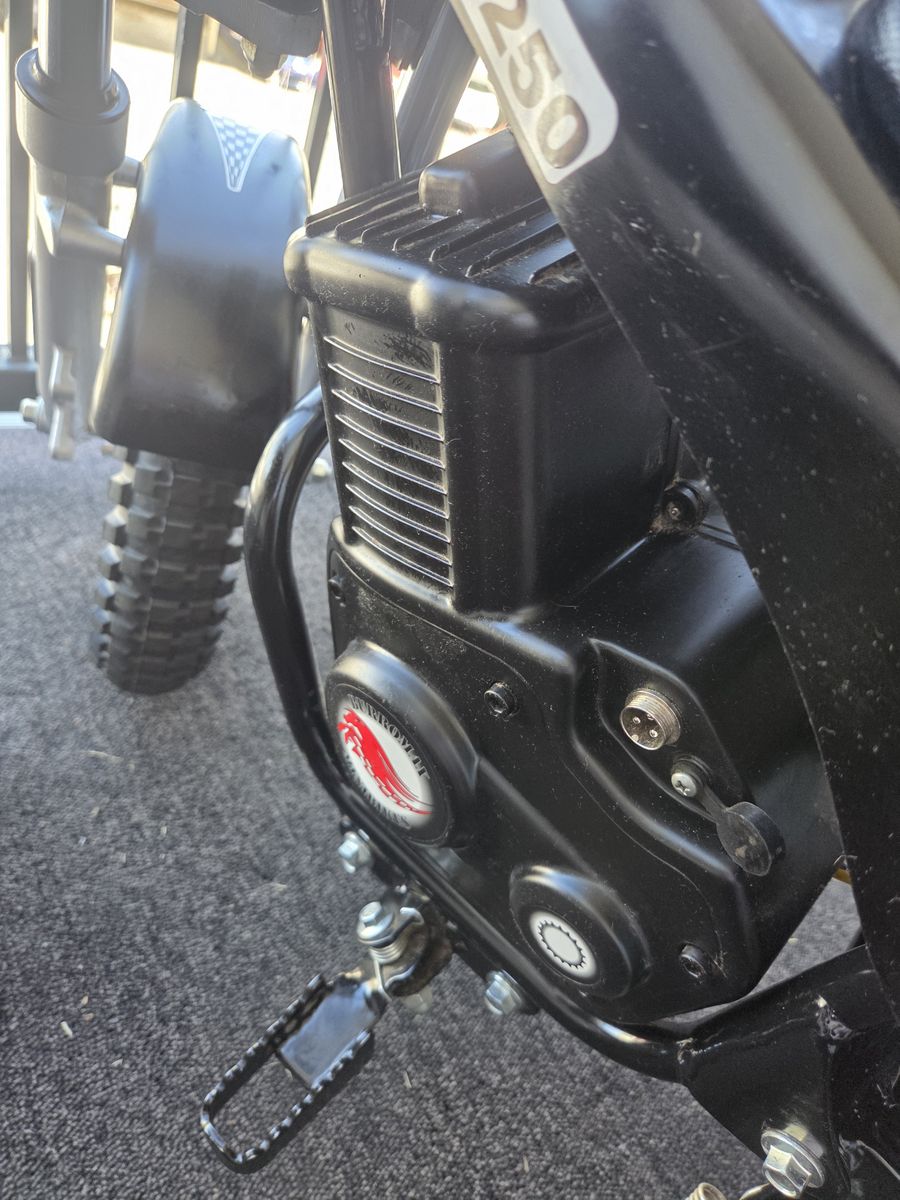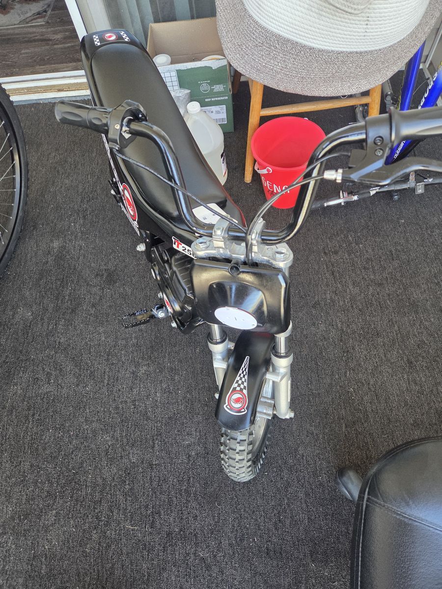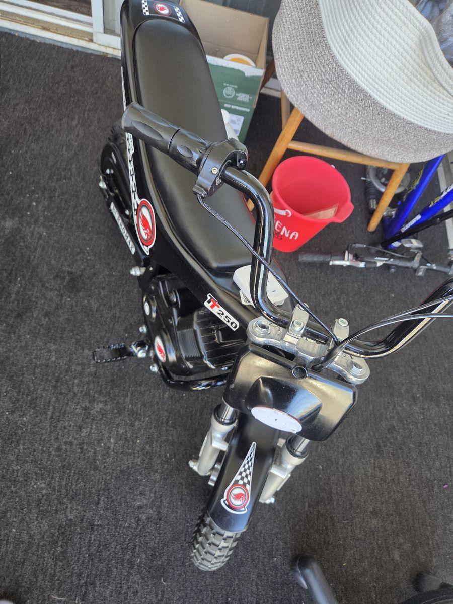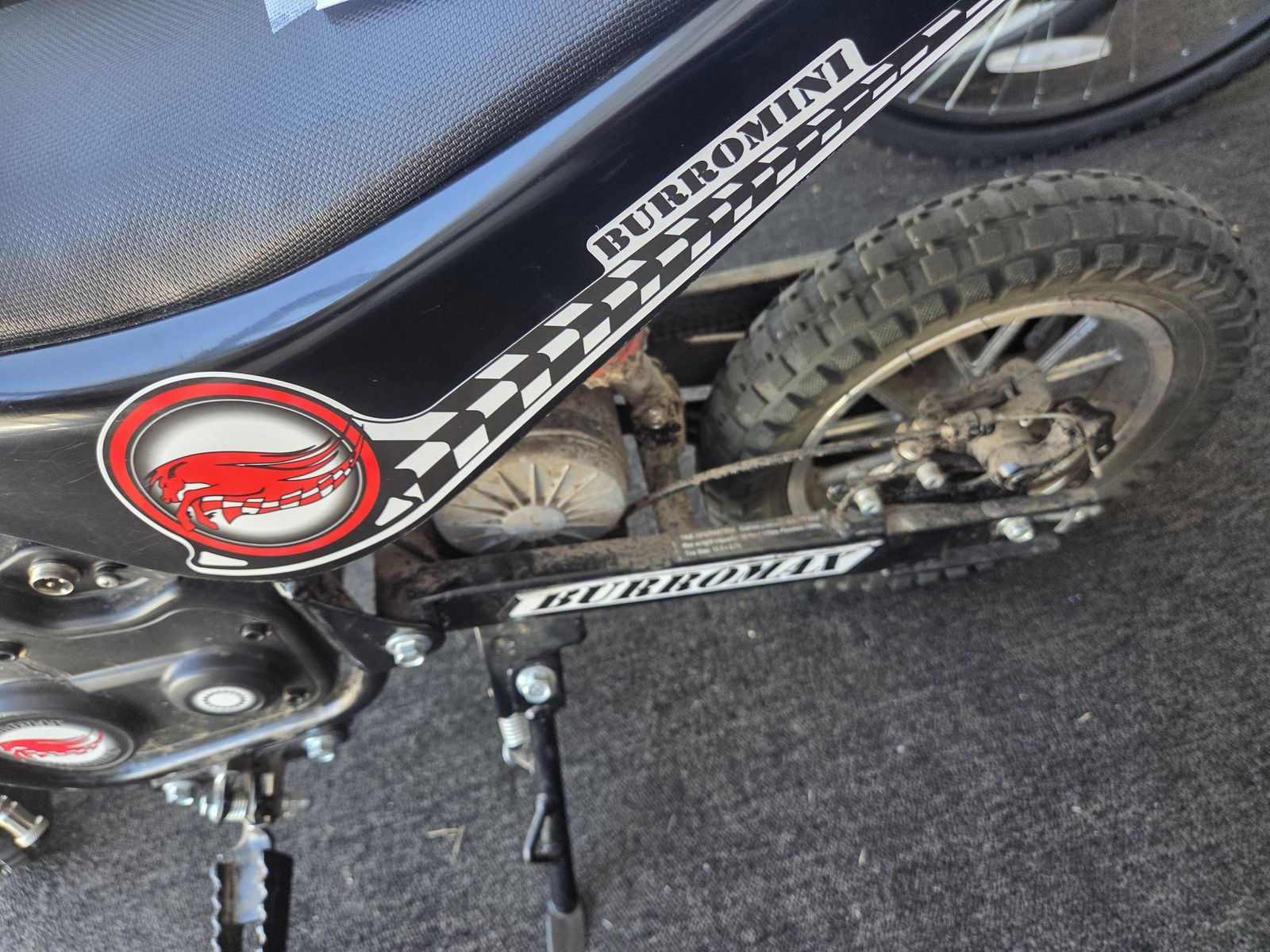 Black Burromax TT250 electric mini bike has a 250W motor and 24V battery system. It comes with a keyed ignition, battery level indicator on the throttle, and a charging port. The bike features a long padded seat, folding footpegs, and off-road tires. It is a compact size for younger riders or pit bike use.Everything works in perfect condition.