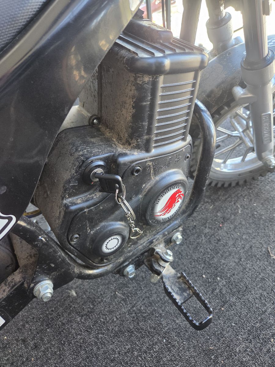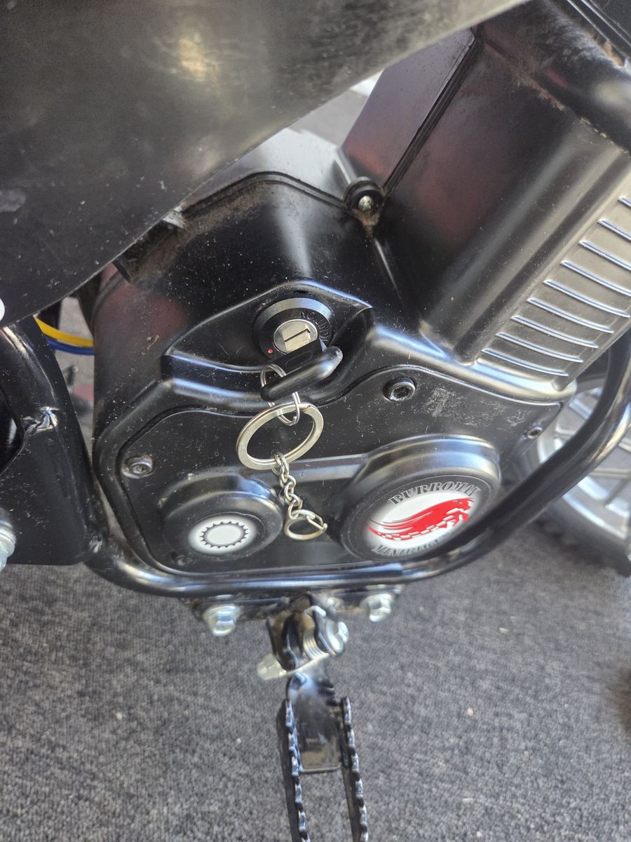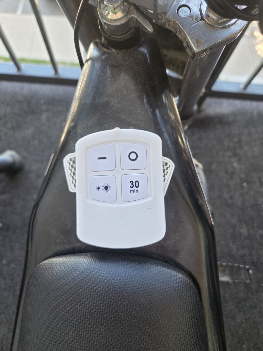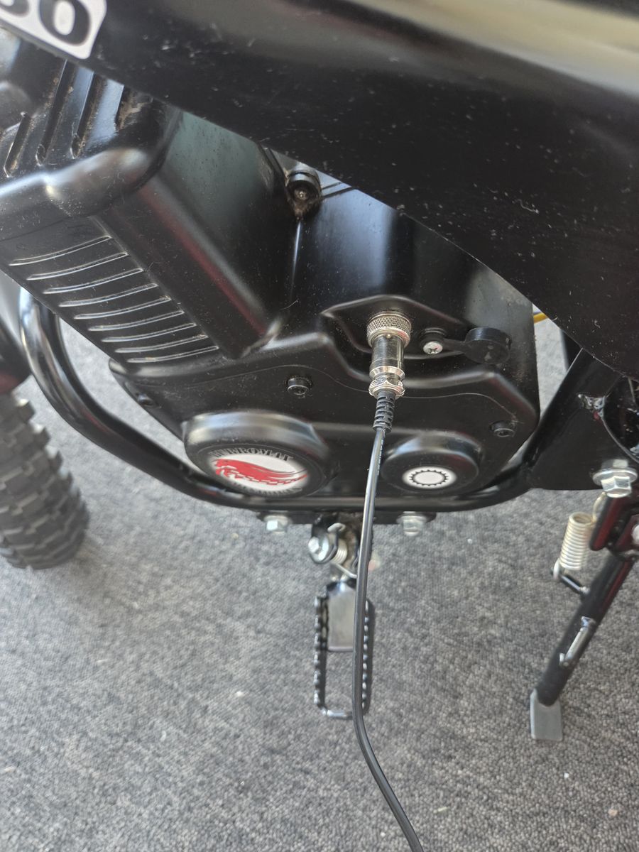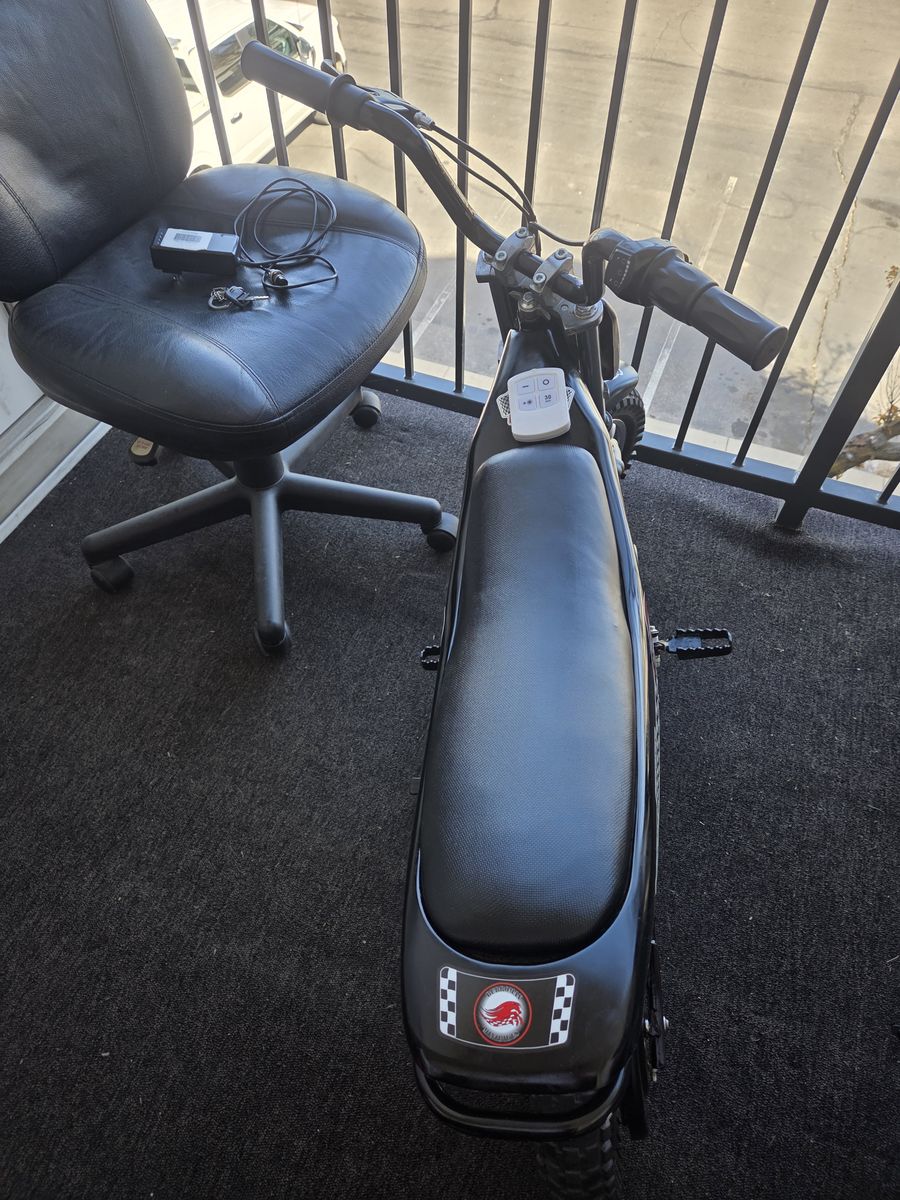 Black Burromax TT250 electric mini bike has a 250W motor and 24V battery system. It comes with a keyed ignition, battery level indicator on the throttle, and a charging port. The bike features a long padded seat, folding footpegs, and off-road tires. It is a compact size for younger riders or pit bike use.Everything works in perfect condition.