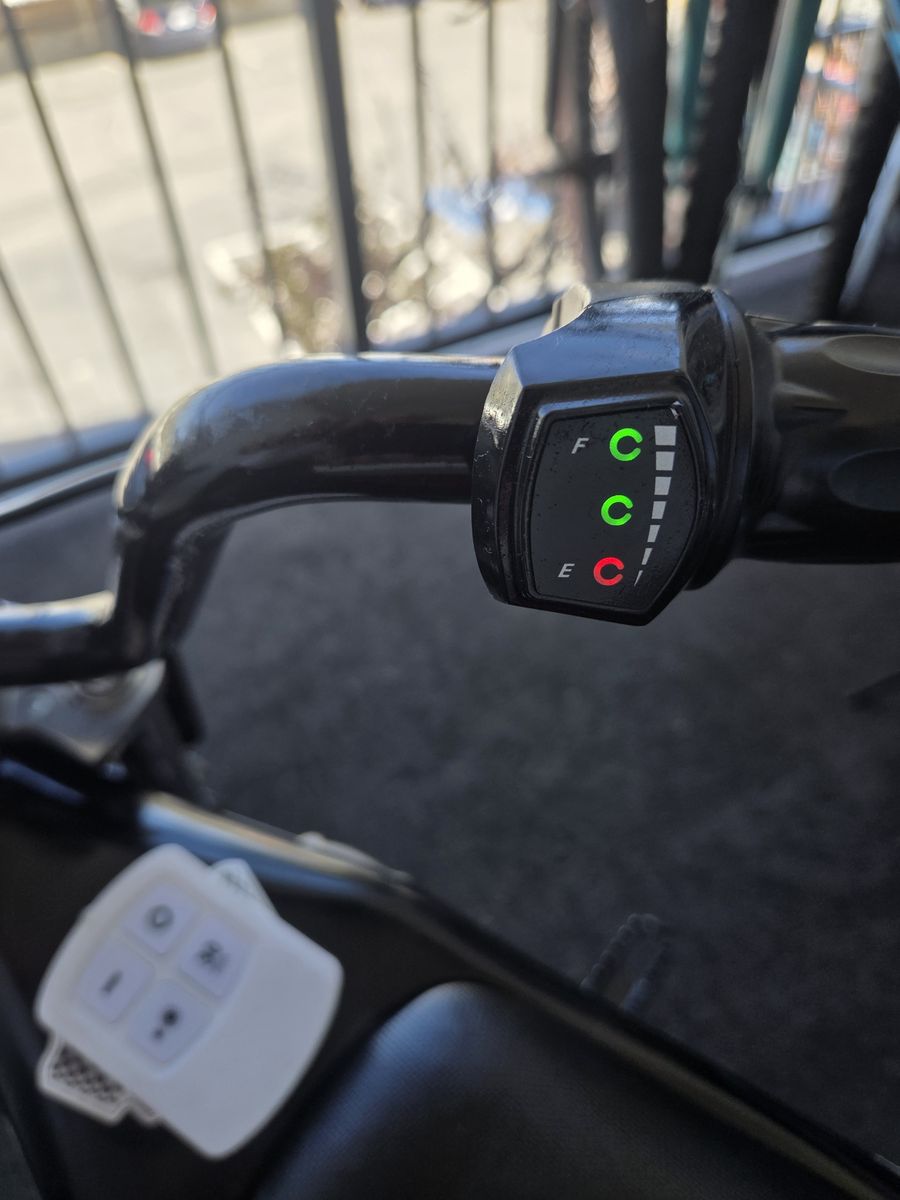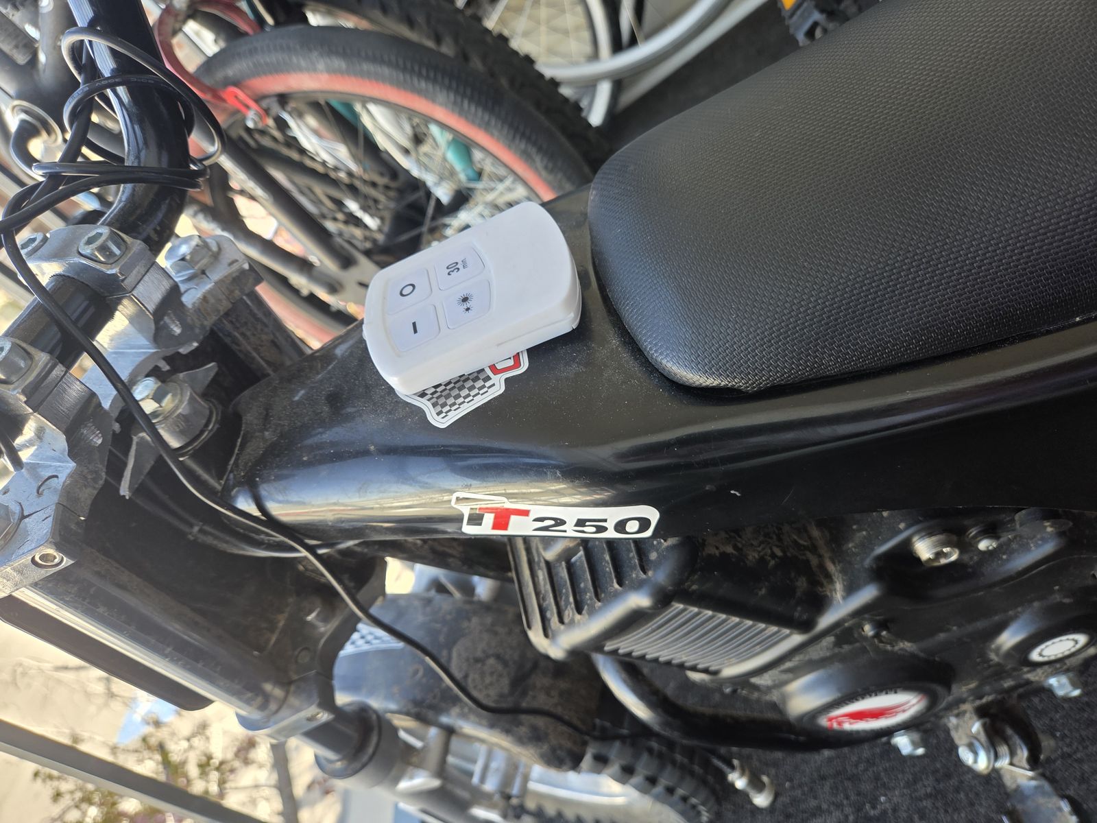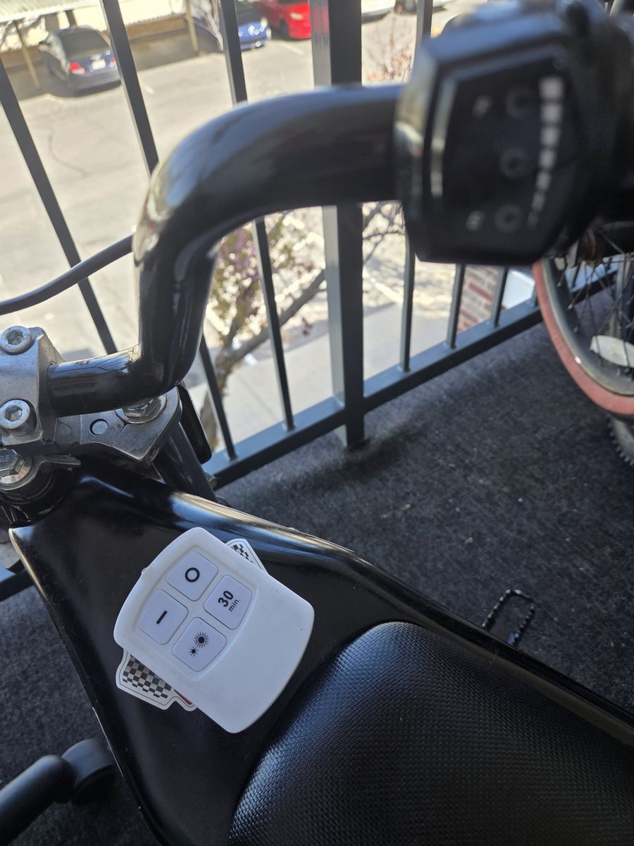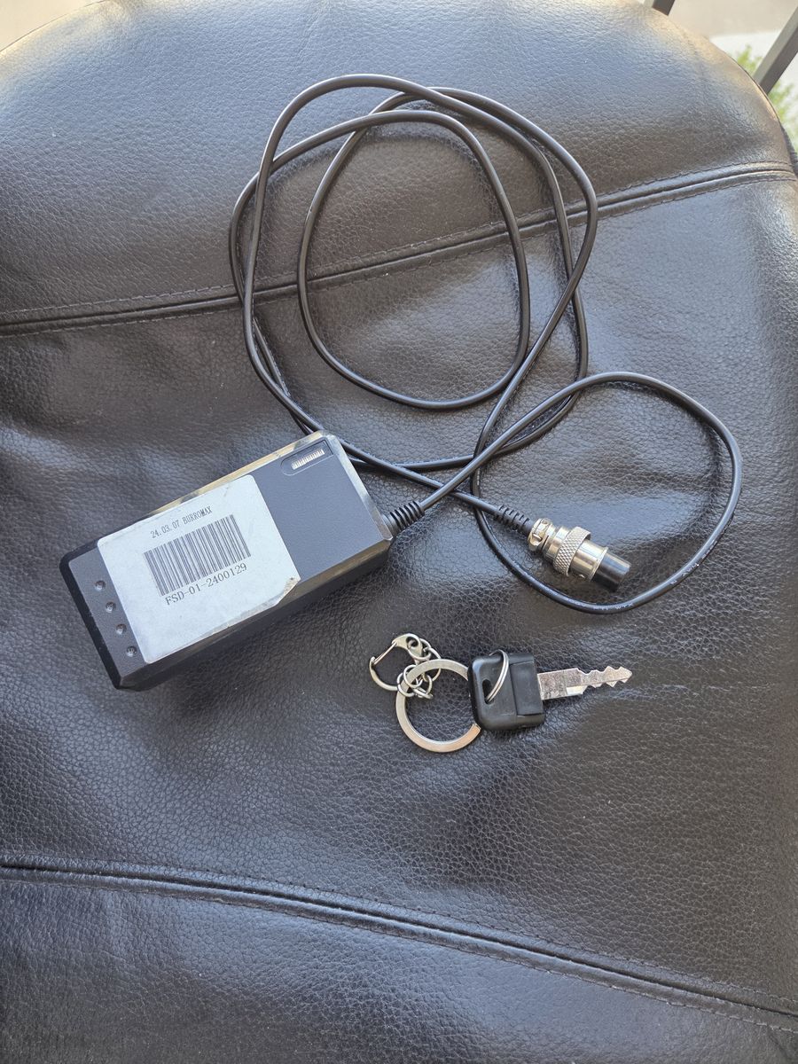 Black Burromax TT250 electric mini bike has a 250W motor and 24V battery system. It comes with a keyed ignition, battery level indicator on the throttle, and a charging port. The bike features a long padded seat, folding footpegs, and off-road tires. It is a compact size for younger riders or pit bike use.Everything works in perfect condition.