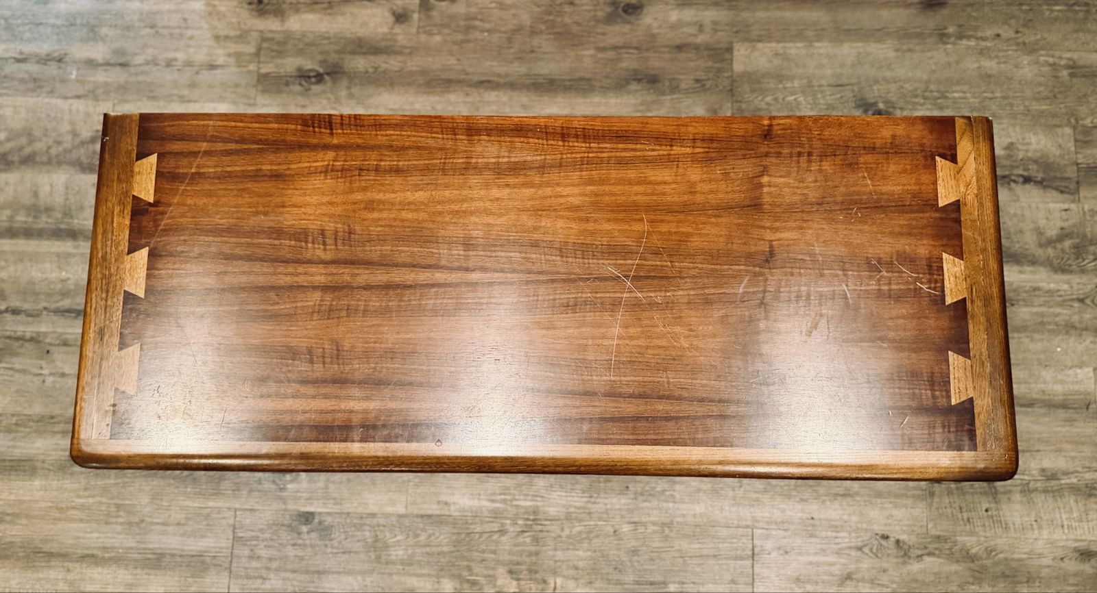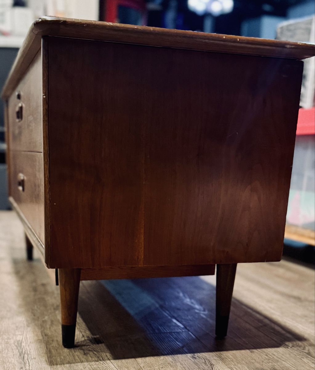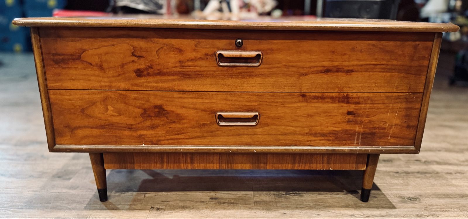 Features mid-century modern design with tapered legs, inset drawer pulls, and dovetail corner detailing on the top. Clean interior with strong cedar aroma. Exterior finish shows light, age-appropriate wear but presents very nicely overall.