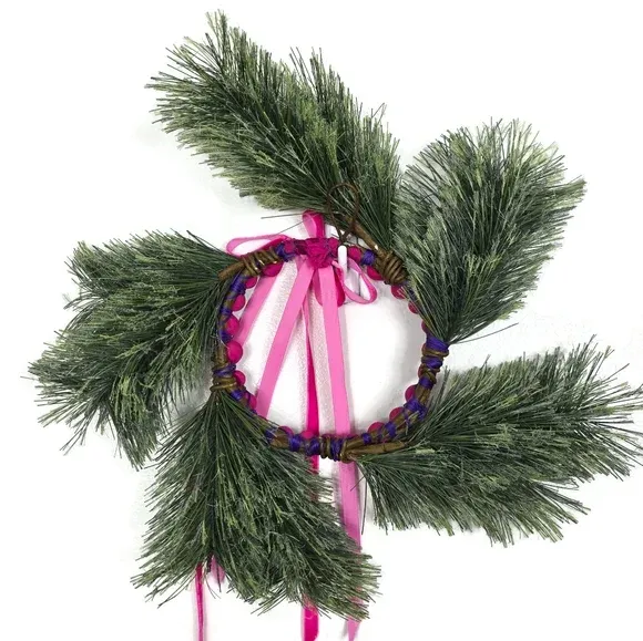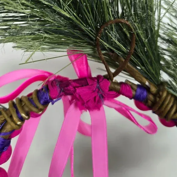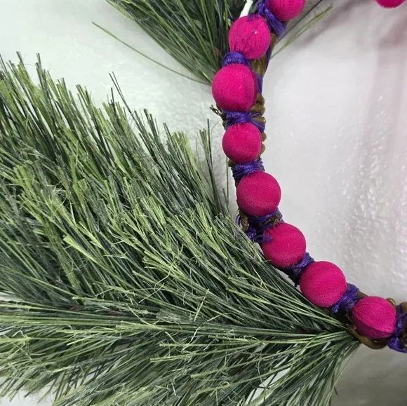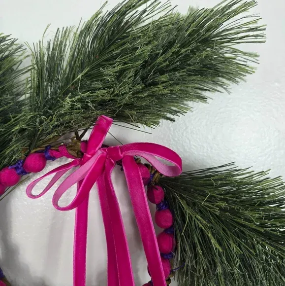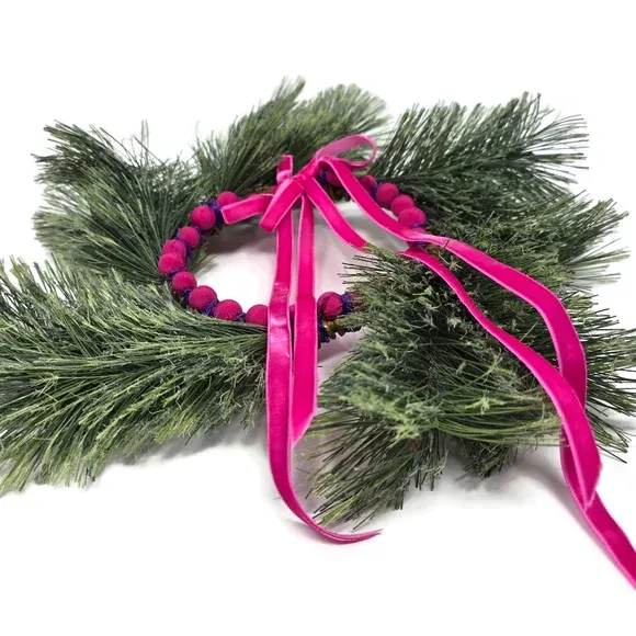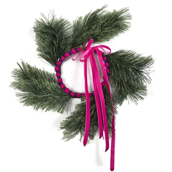 VenmoHandmade Modern Holiday Wreath Pink Velvet Ribbon Silk Wrapped Beads Pine Decor