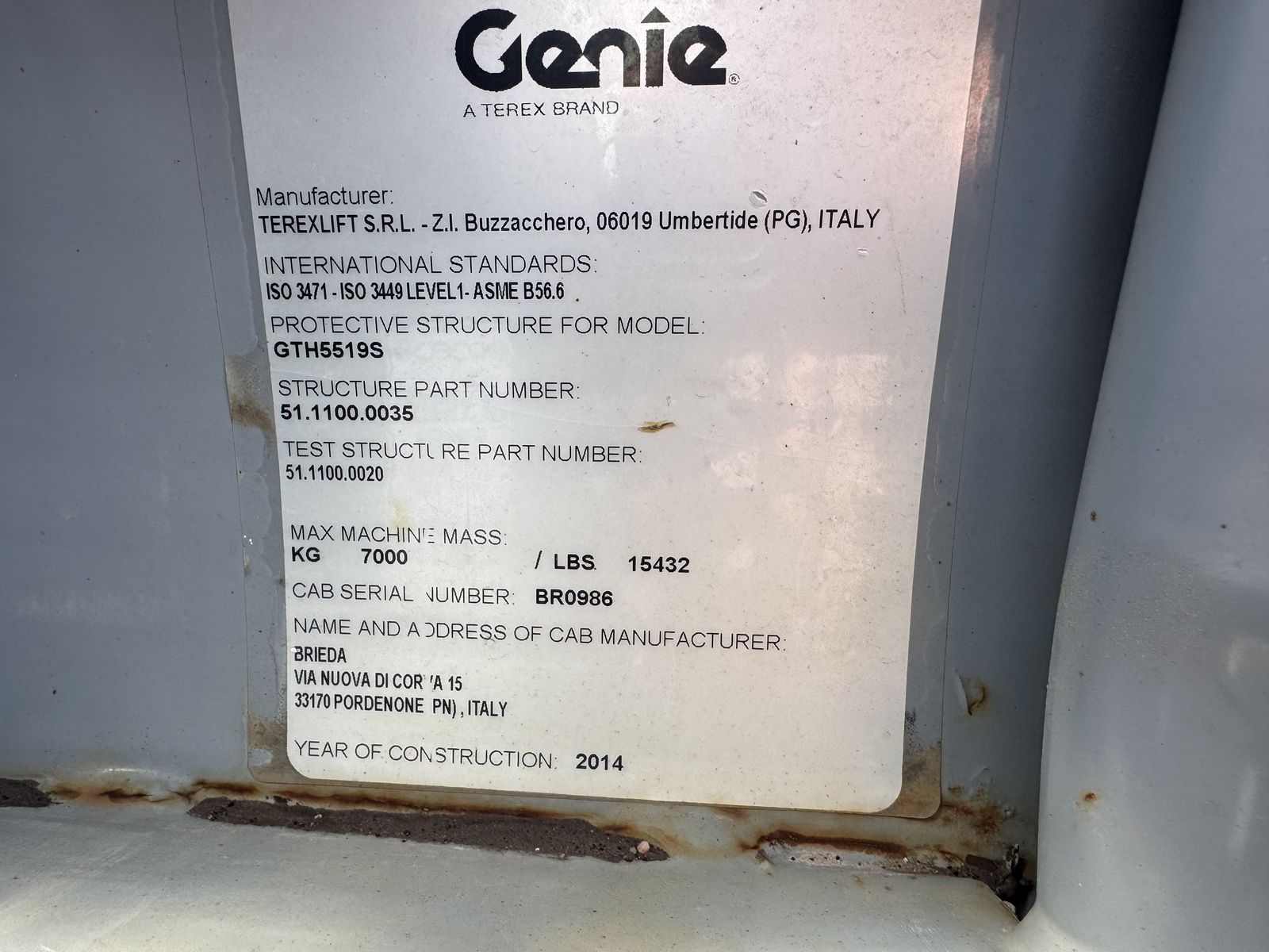 YEAR: 2014 MAKE: GENIE MODEL: GTH-5519 S/N: GTH5514B-1052 HOURS: 1983 MAX LIFT: 5500 LBS MAX LIFT HEIGHT: 18.84 ENGINE: DEUTZ TD 2.9