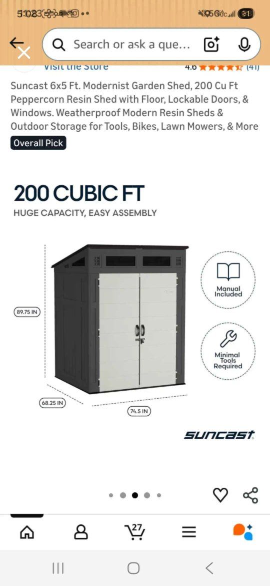 VenmoNew never assembled New Suncast modernist Garden Shed with floor. Lockable doors and windows. Weatherproof outdoor storage for tools, bikes lawnmower and more. It is to large for the area we had for it. We purchased it at Costco for $800.00. It has a Manuel and also video instructions on the Costco website. Easy to asemble.