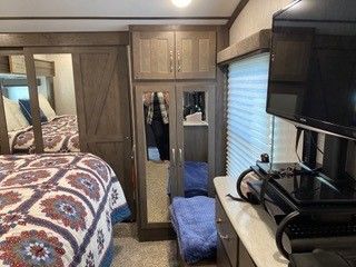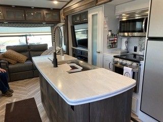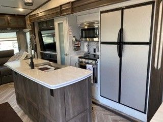At 36 feet, this stunning 5th wheel offers the ideal balance of maneuverability and comfort—with three slide-outs that create a bright, open living space.