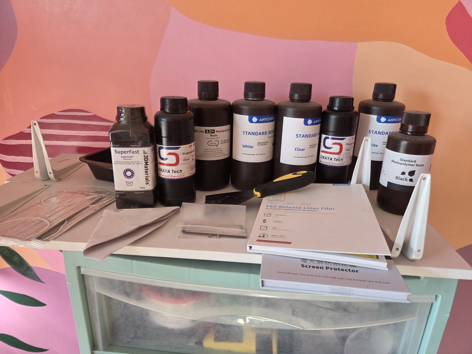 3D printer and LOTS of resin. Printer is about 2 years old, works perfectly other than its had the screen protector over the light replaced. Comes with replacement protector and a few FEP sheet replacements and tools for replacement. Great deal, Printer itself is worth ~$240, resin is easily another $200, most bottles are at least half full if not unused. Black, clear, grey, white, and wax resins. Also comes with a few masks, a scraper, and a couple cleaning funnels. I'm selling since I no longer have access to a computer for making files nor do I have the time to babysit prints anymore
