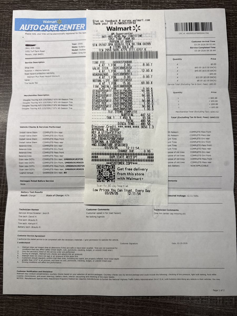 VenmoBought these tires from Walmart and had them installed Sunday morning. Drove to Salt Lake Sunday afternoon and the engine blew on my Subaru. Towed back home, took the tires off and scrapped the car. Tires have about 50 miles on them. I paid $480.56 Asking $360 for all four. Color text if you have questions.