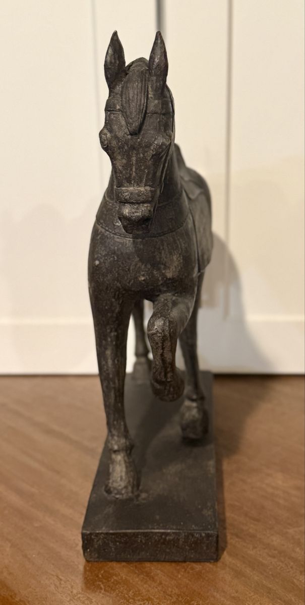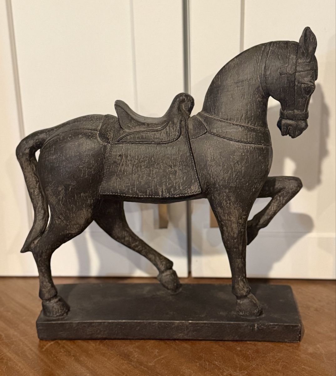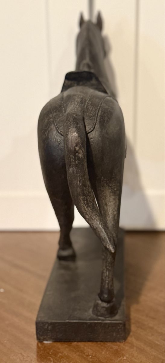 Large decorative horse sculpture with a beautiful rustic, aged finish. This is a solid piece with great detail throughout — from the saddle to the stance — making it a great statement piece for home decor.