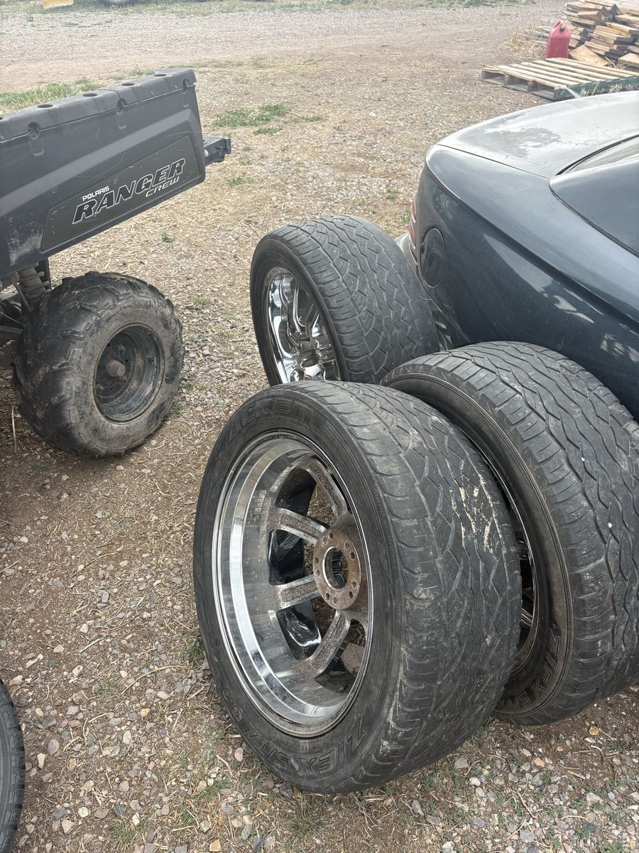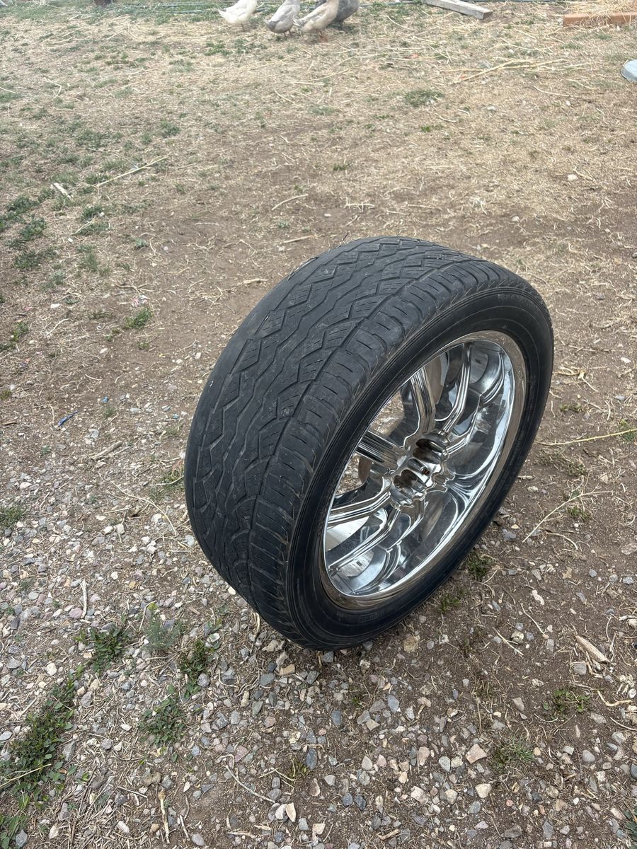ApplePaySet of four 22” chrome wheels with 33” tires. Dual bolt pattern: 5x5.5 and 5x135. Chrome is in good shape. Tires included. Located in Monroe, UT. Venmo and Apple Pay accepted. Message with questions.
