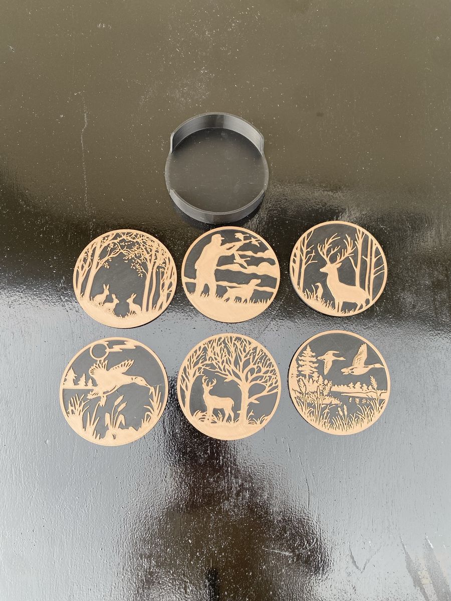 3d printed shed mount that looks like a deer skull so it lasts forever, and I also have hunting coasters for 20 dollars a set.