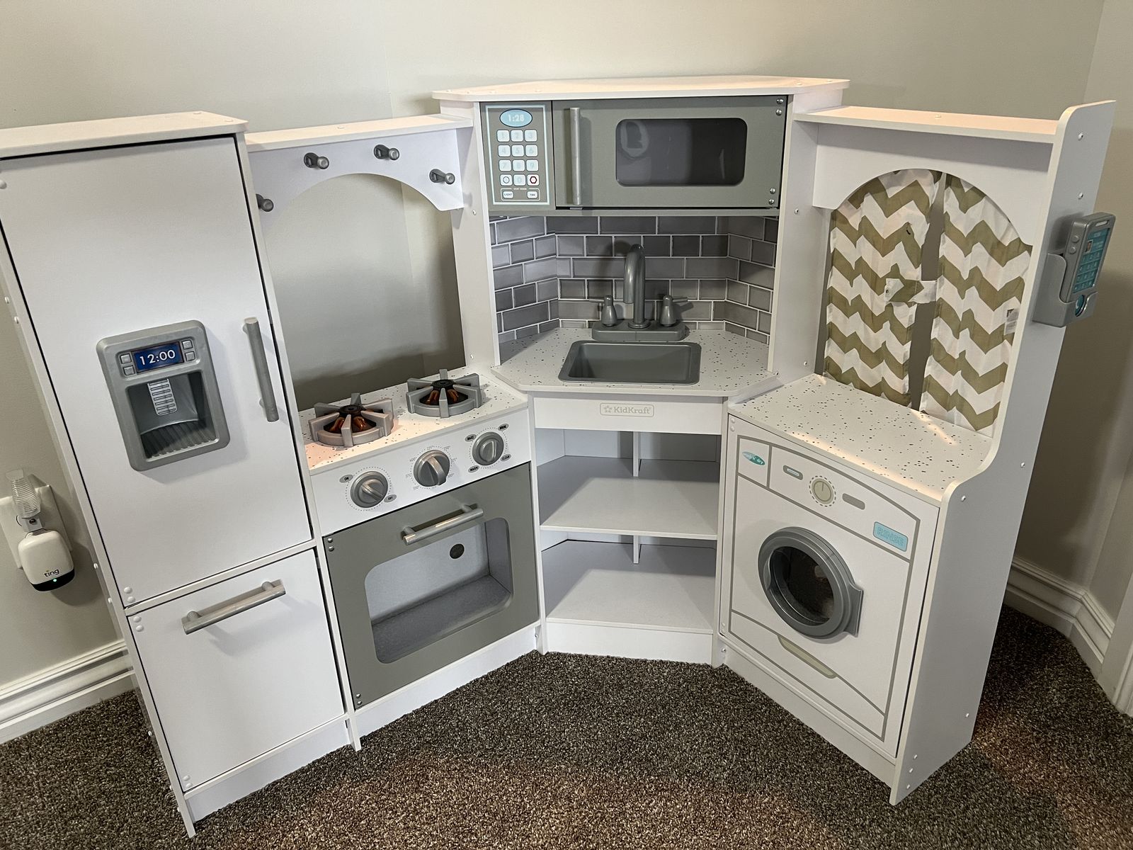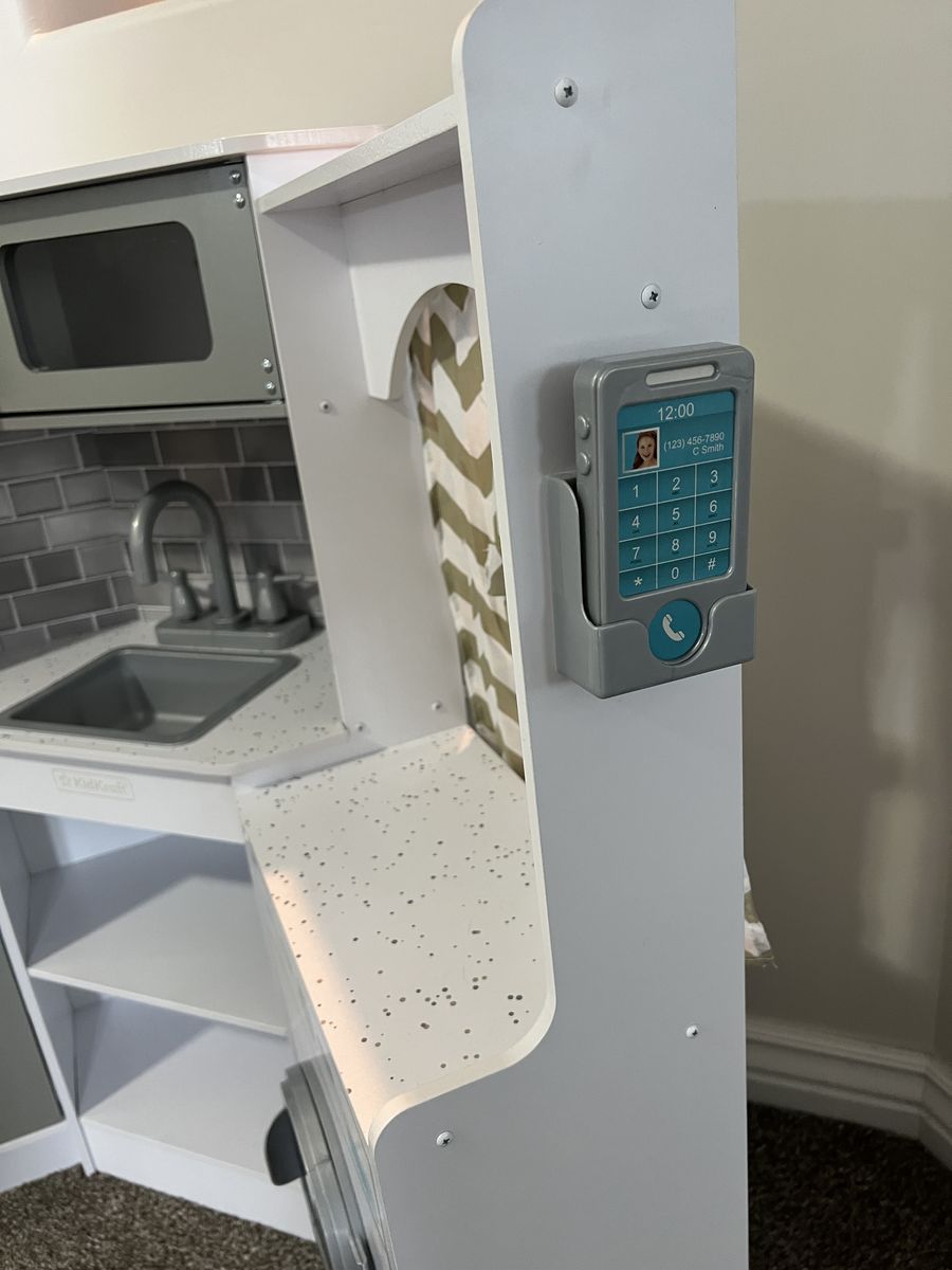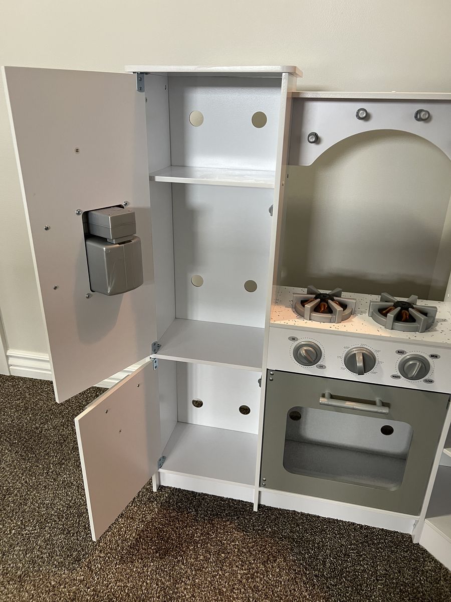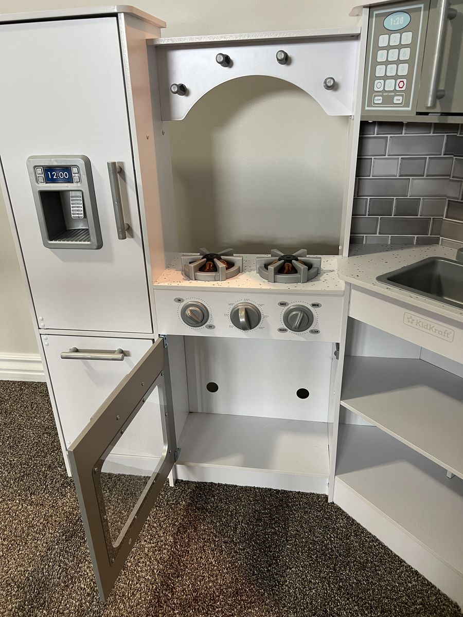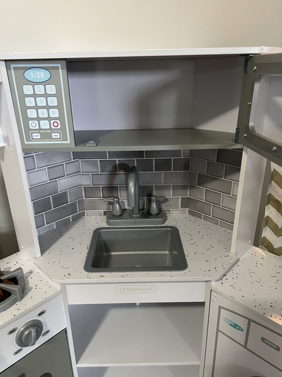 Kidkraft white kitchen with light up and sound burners. Doors open, curtains, and pretend phone. Brand new, put together, never used. My daughter decided not to play with it after begging for it so now I'm selling it. Kitchen alone is $200.