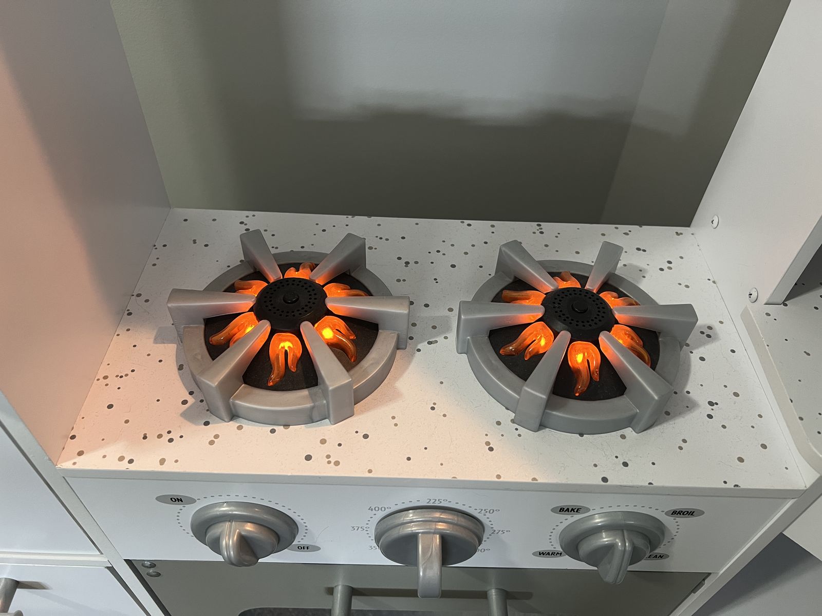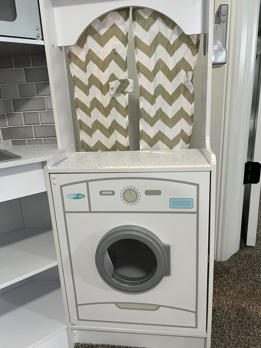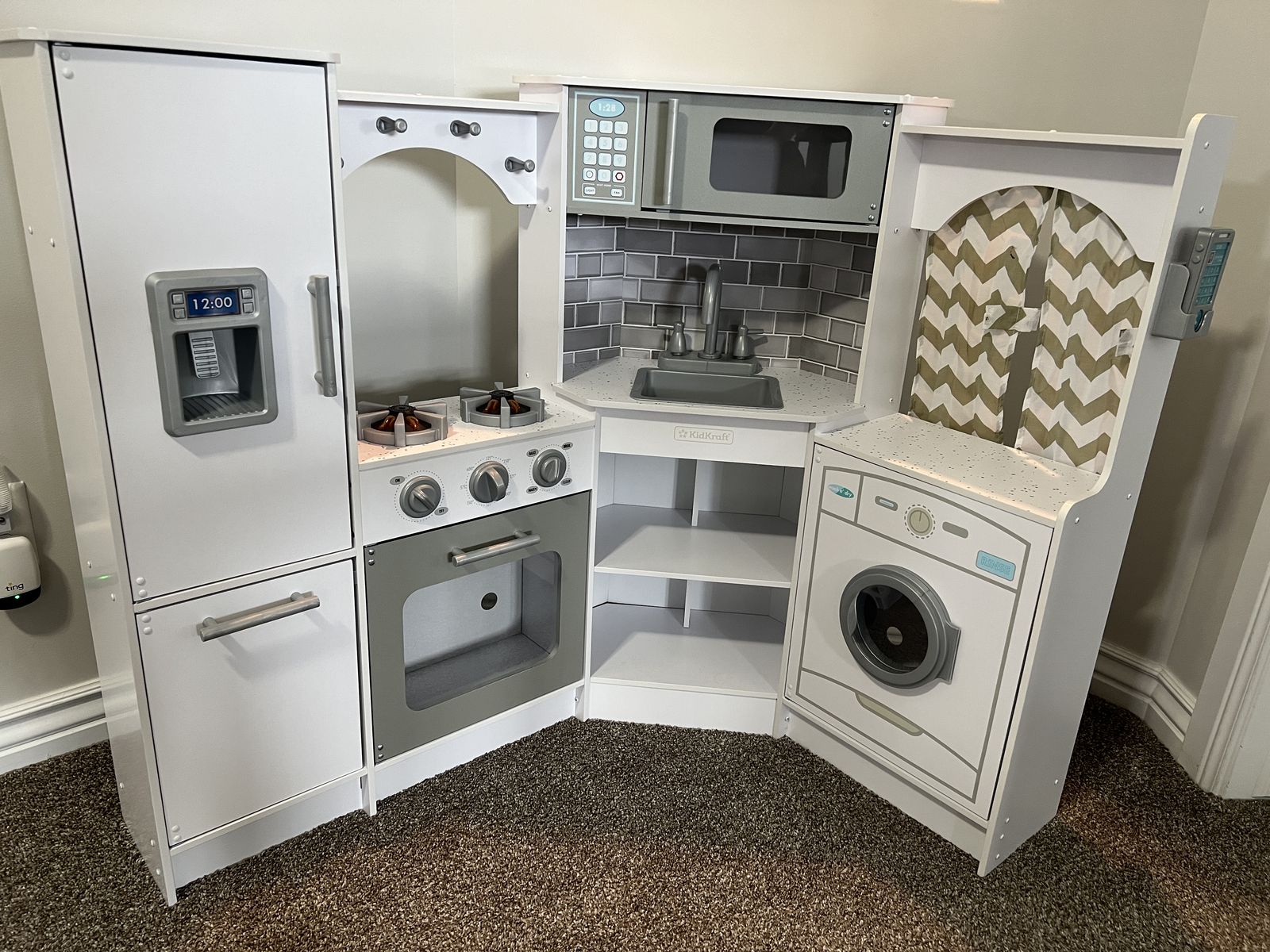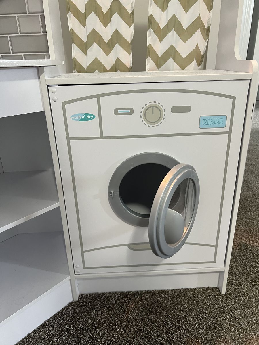 Kidkraft white kitchen with light up and sound burners. Doors open, curtains, and pretend phone. Brand new, put together, never used. My daughter decided not to play with it after begging for it so now I'm selling it. Kitchen alone is $200.