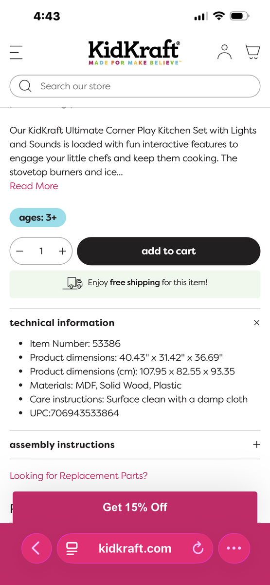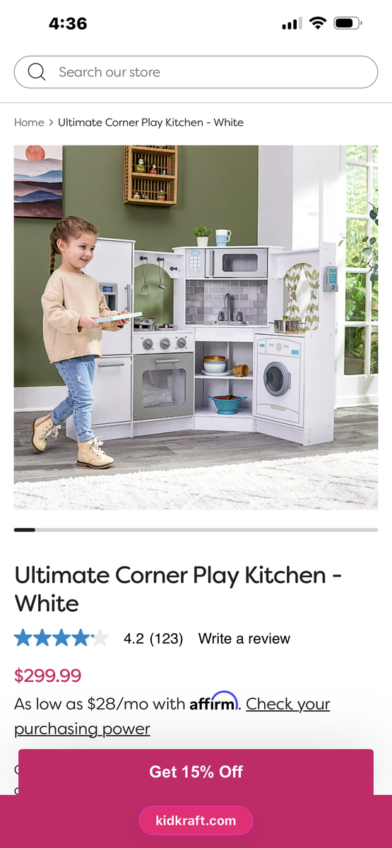 Online price for the kitchen is $299.99. I've attached dimensions of kitchen from the Kidkraft website for reference in the photos.