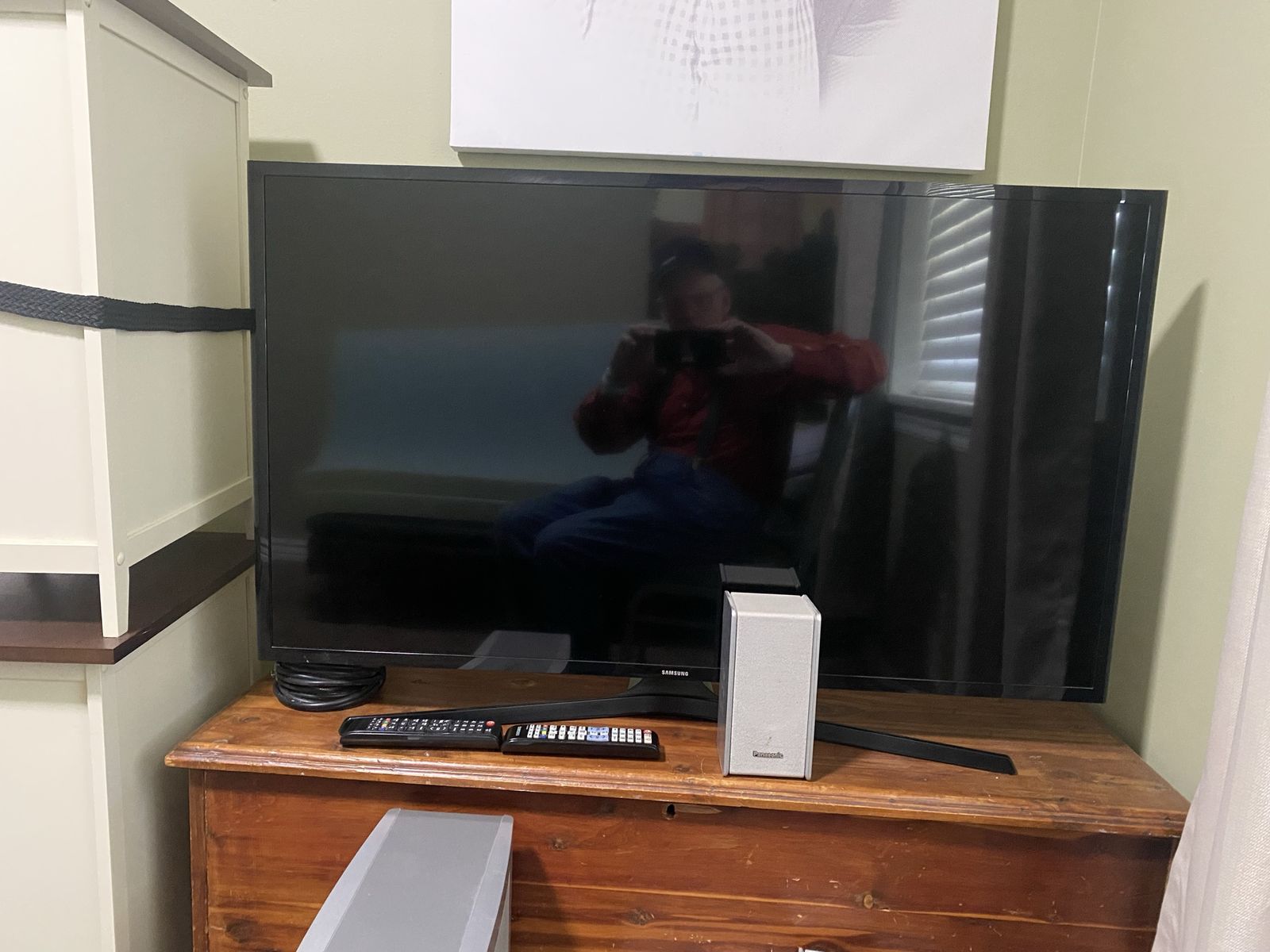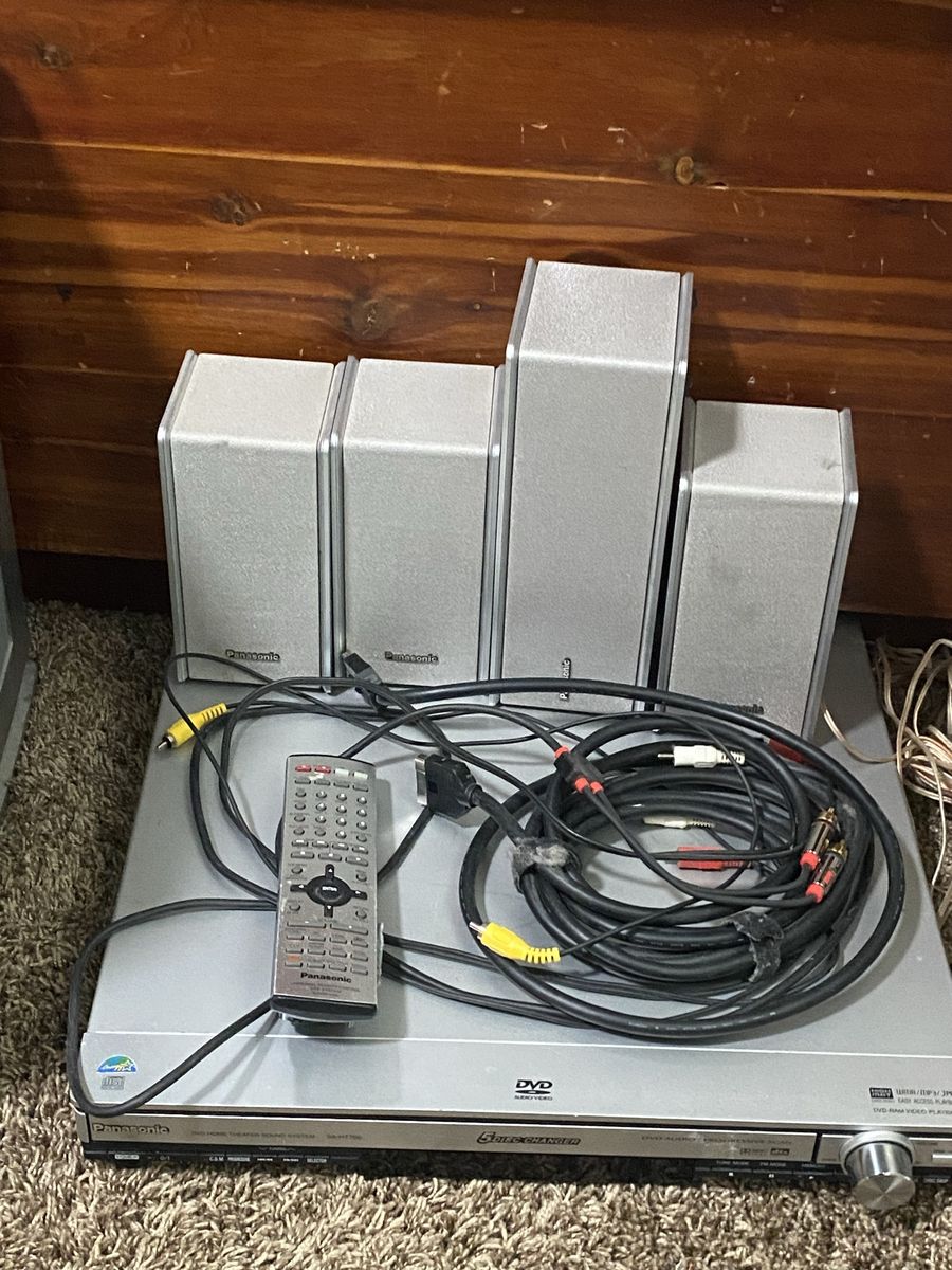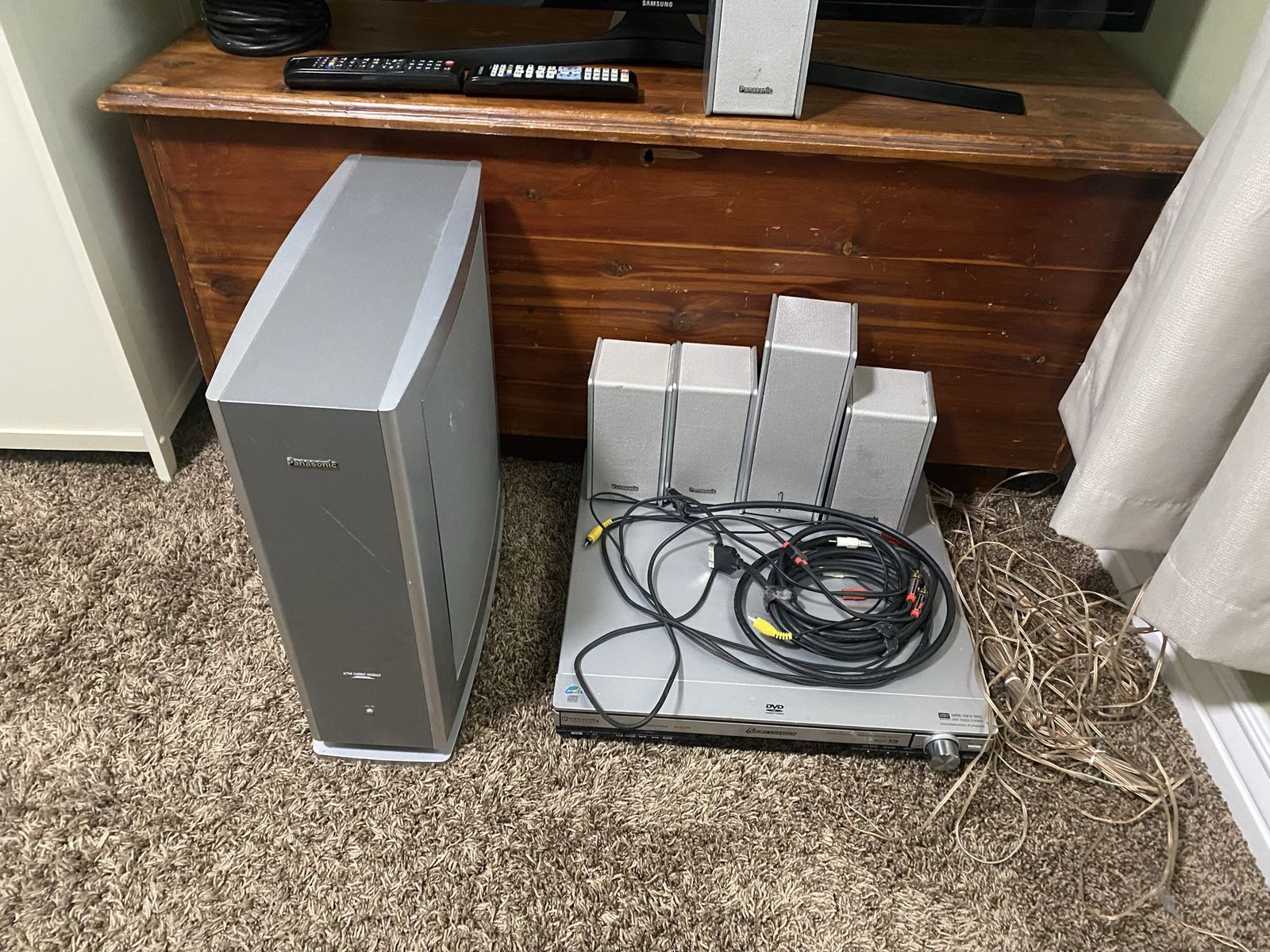 Home theater System: 45” Samsung TV with 2 remotes Panasonic sound system with remote and Woofer and 5 small speakers Includes various cables to connect speakers to receiver Apple TV 4K with remote