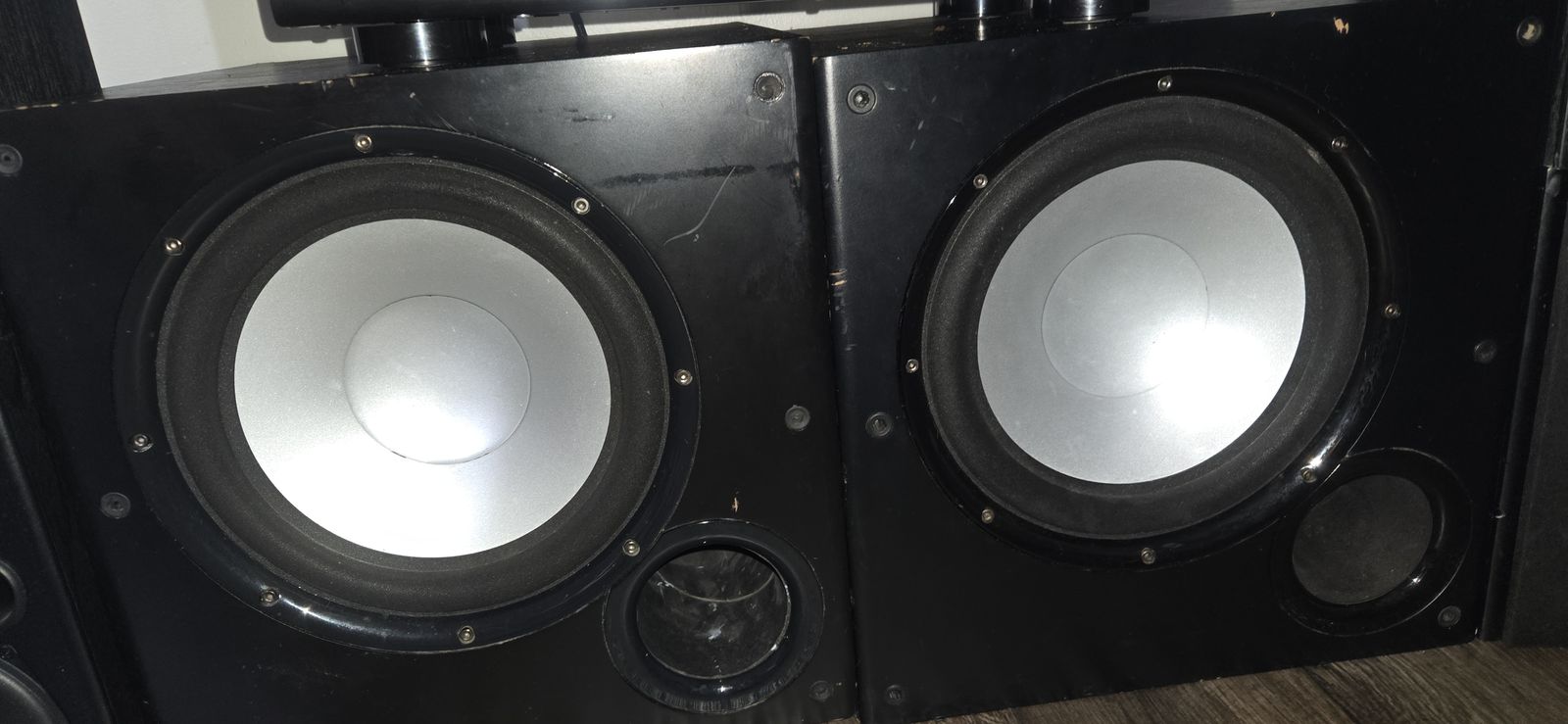 Speaker enclosures have scuffs on the edges and subwoofer face covers are missing