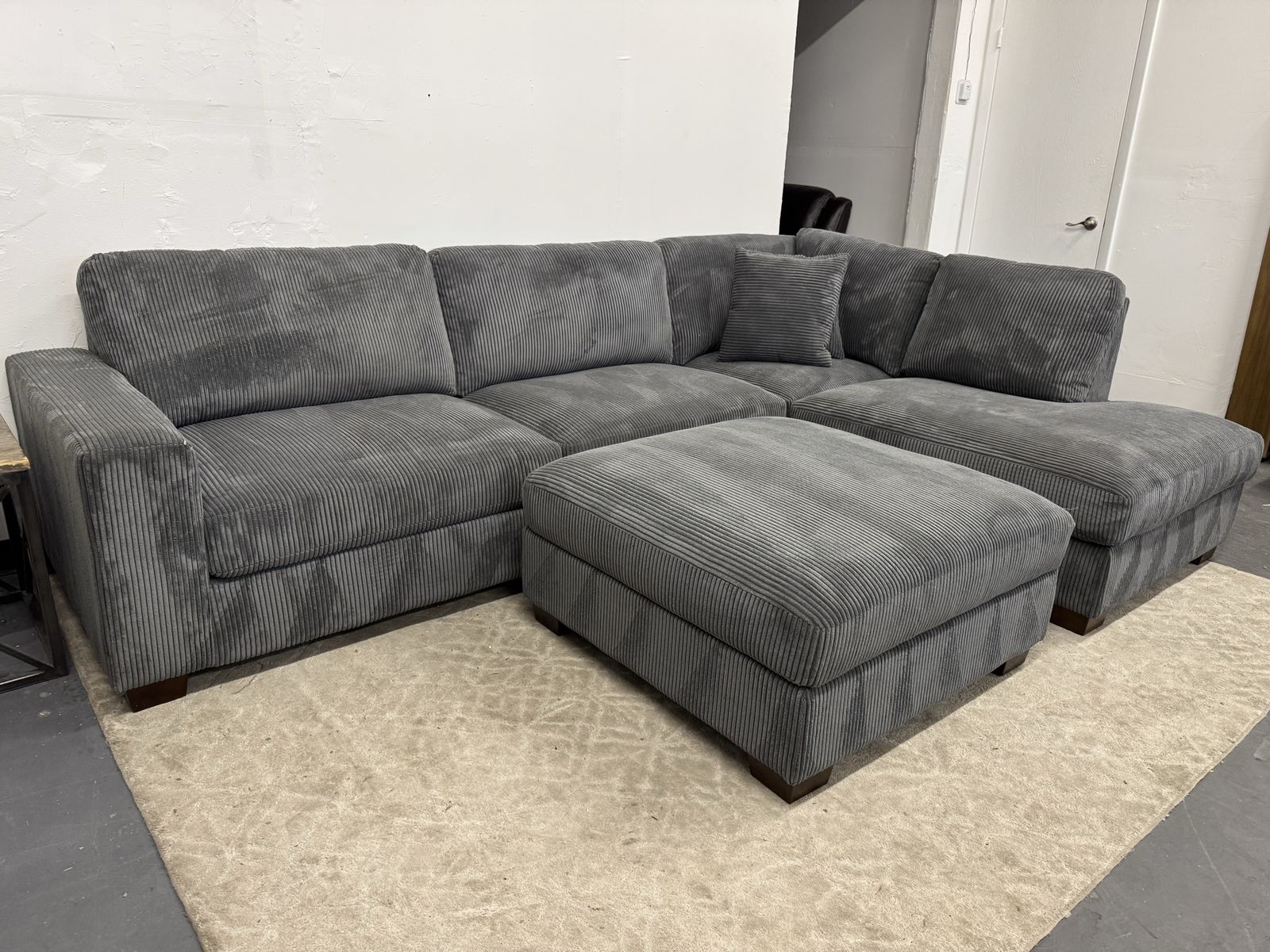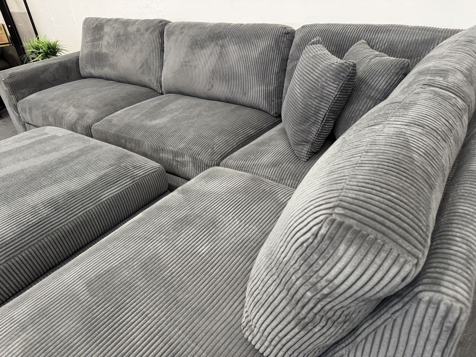ApplePayI am selling a Gray Costco Thomasville Artesia Corduroy Fabric Sectional Sofa Couch with Ottoman in good condition!