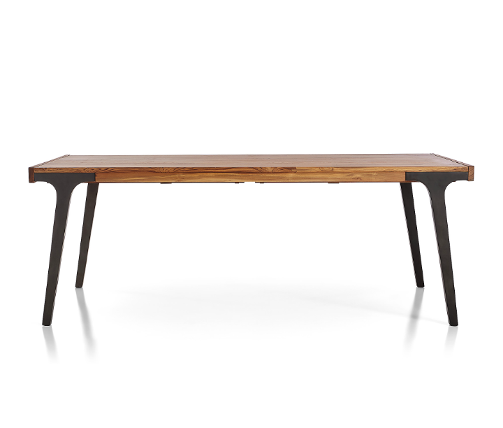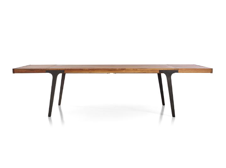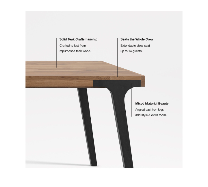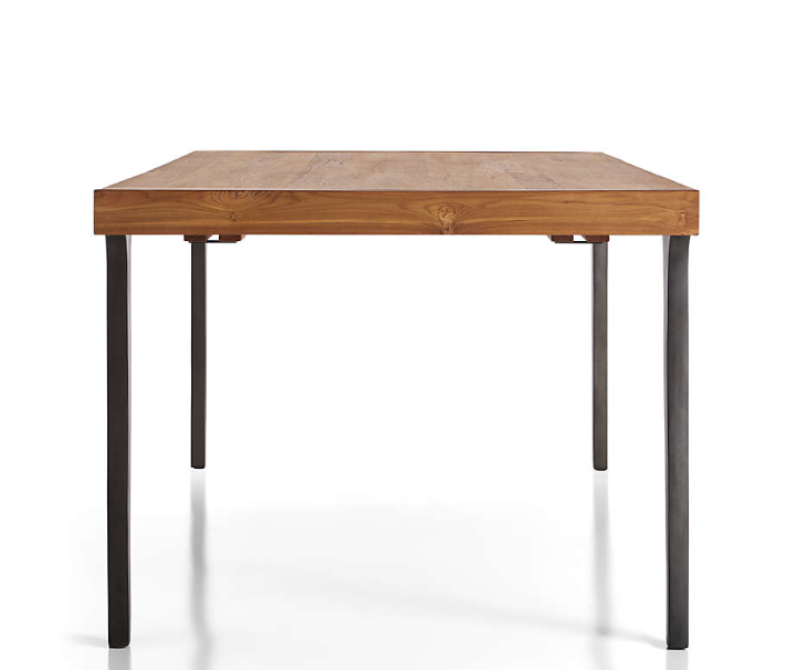 Antiqued to get the look of cast iron, Lakin's metal legs seamlessly integrate with the table's wood apron, angling out for maximum style and legroom. Expandable table features two leaves that expand the table to seat extra guests. The Lakin Extendable Dining Table is a Crate and Barrel exclusive.