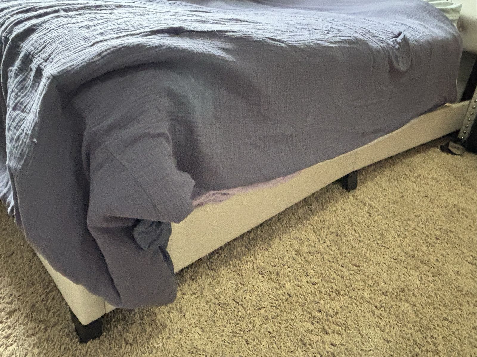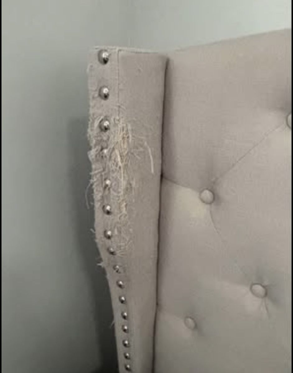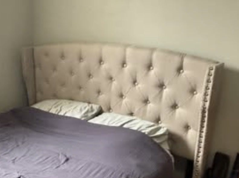 VenmoQueen size gray tufted bed frame. Cat scratched the sides of headboard. One of the support legs broke but a block can be used. Pick up only. Located in Kaysville