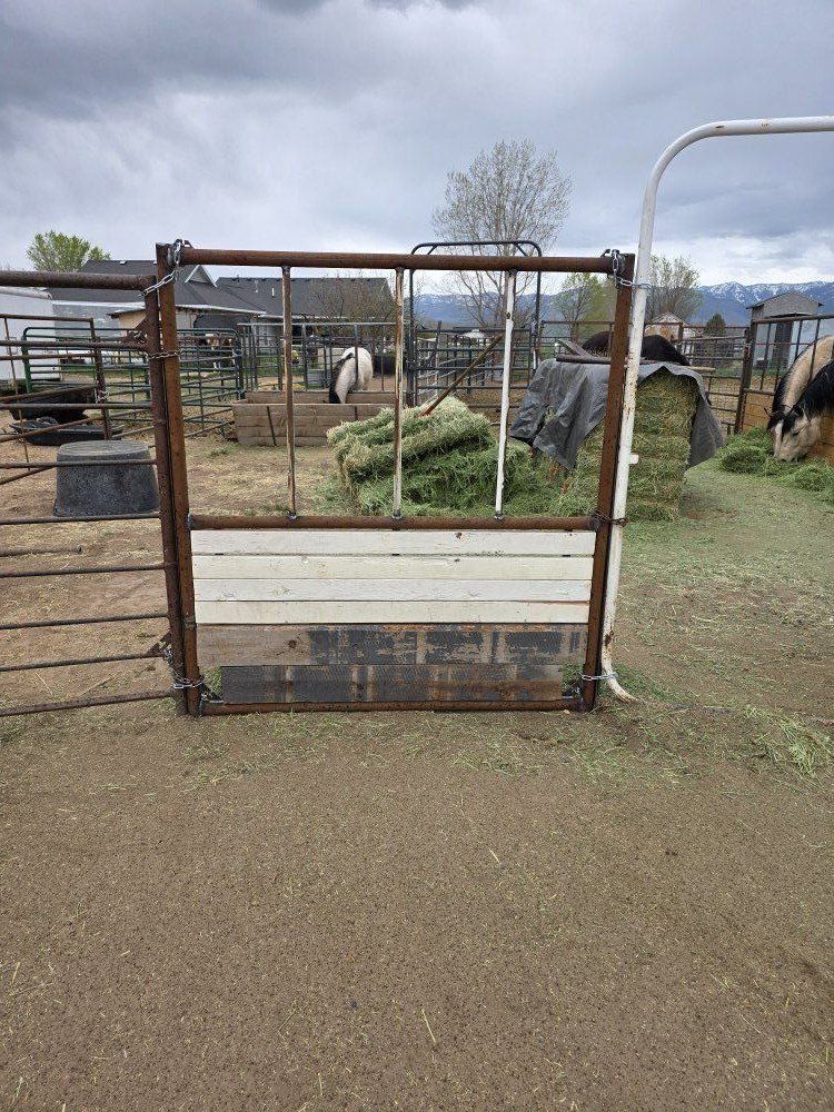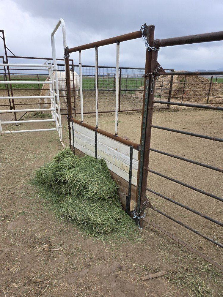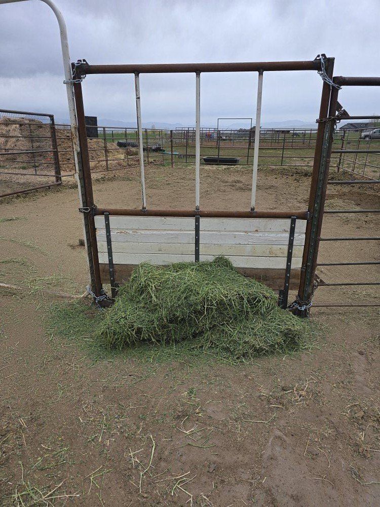 easy to use no wasted hay feeder is 5 ft long 5ft 8in tall 32 tall middle rail 2x6 lumber on bottom can add legs to make self standing if desired 4 slots $500 ( one pictured is not for sale built as ordered)