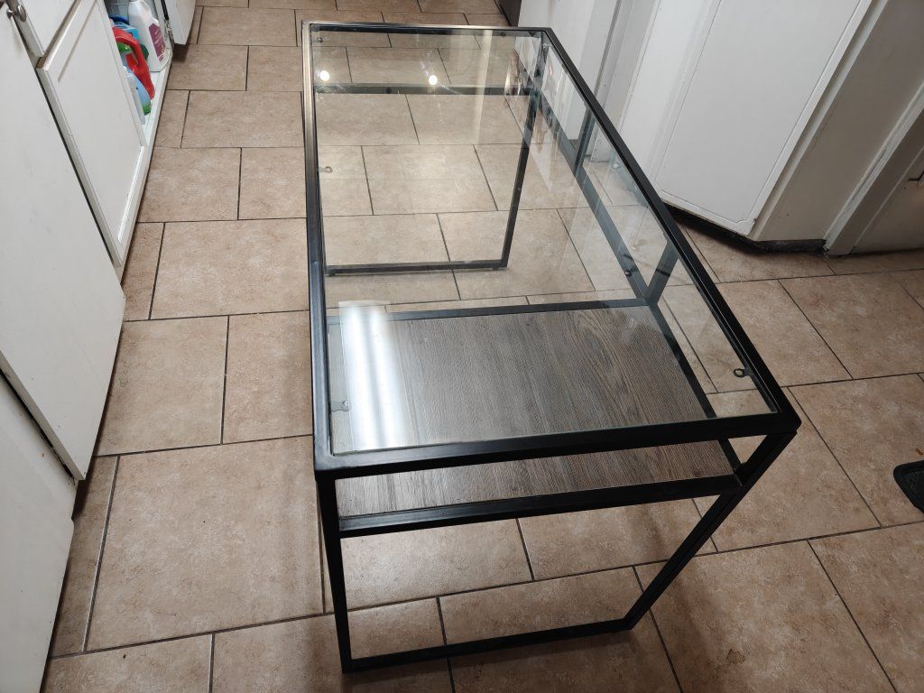we have a small black glass table with a wooden print shelf - gently used - measures 48 inches by 24 inches and a height of 30 inches - can deliver if needed