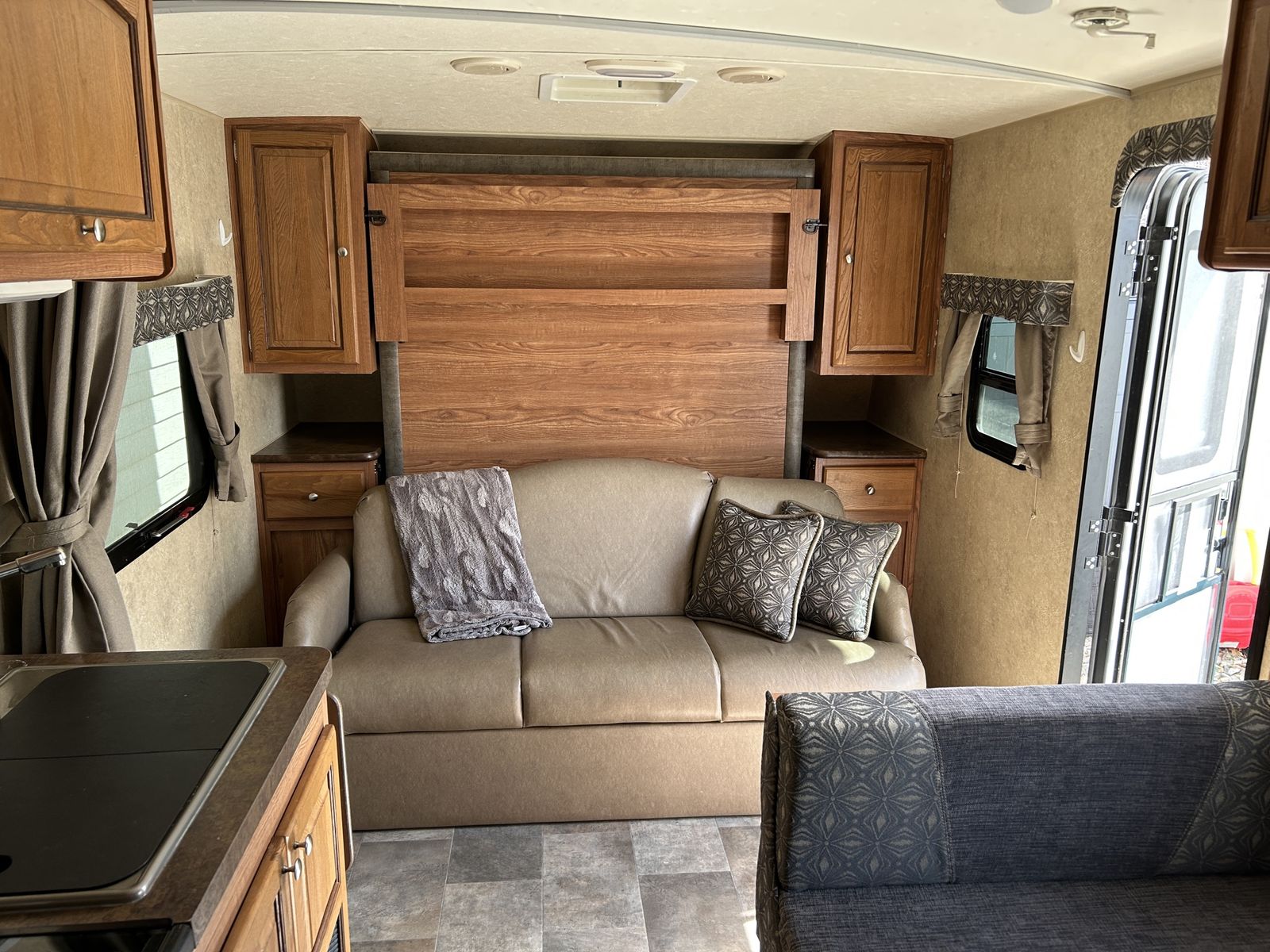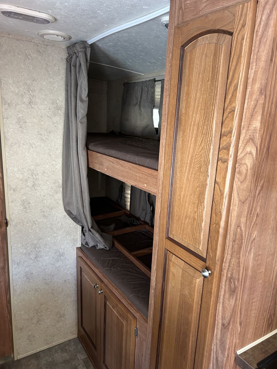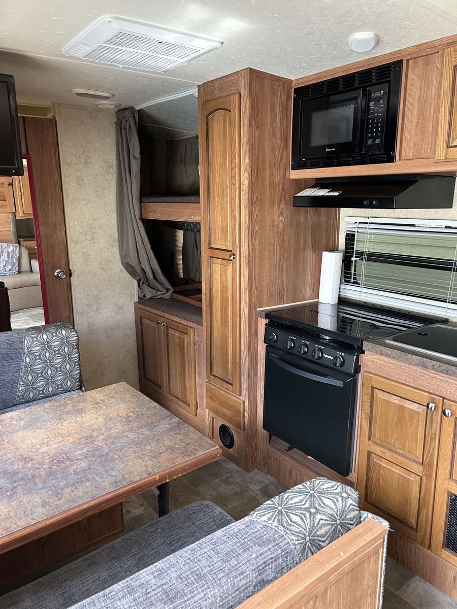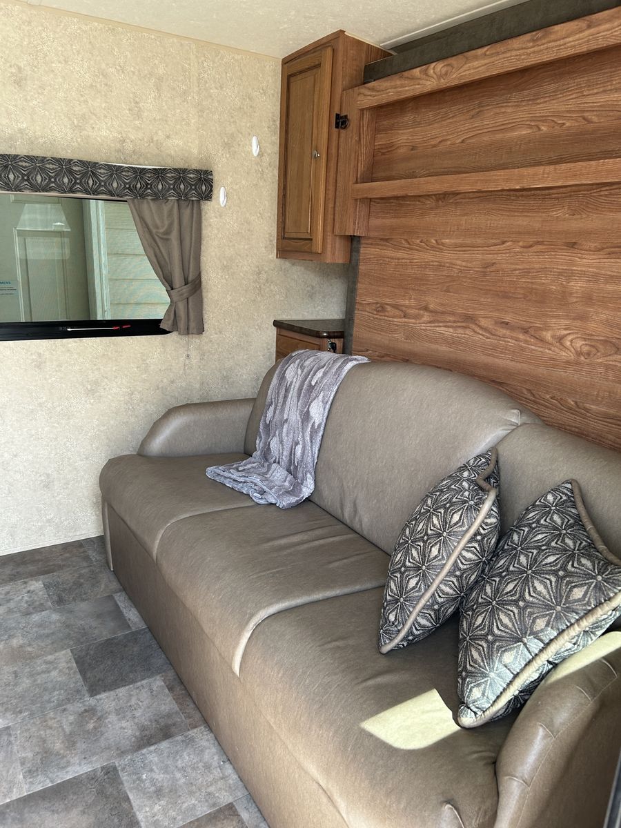We are the second owners of this trailer. The only reason we’re selling is to get something a little bigger for our growing family. We just took it on a trip and everything works great! The camper has the Murphy bed that folds out over the sofa.