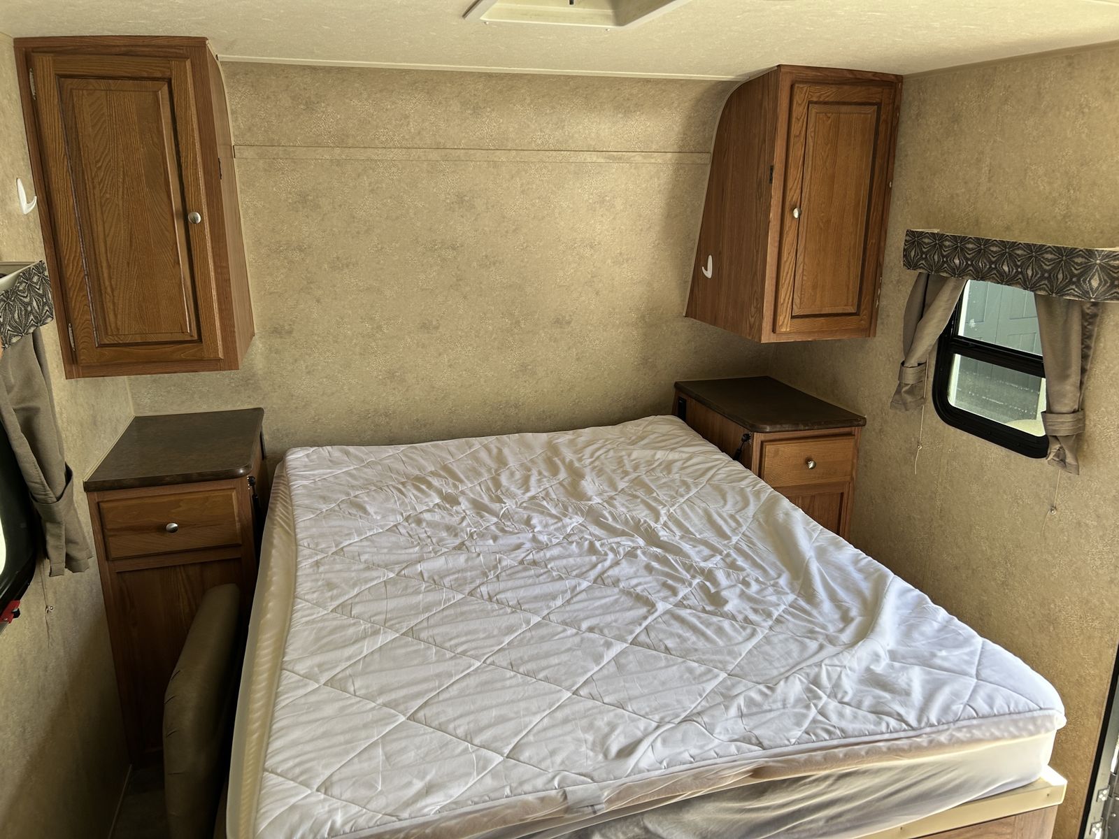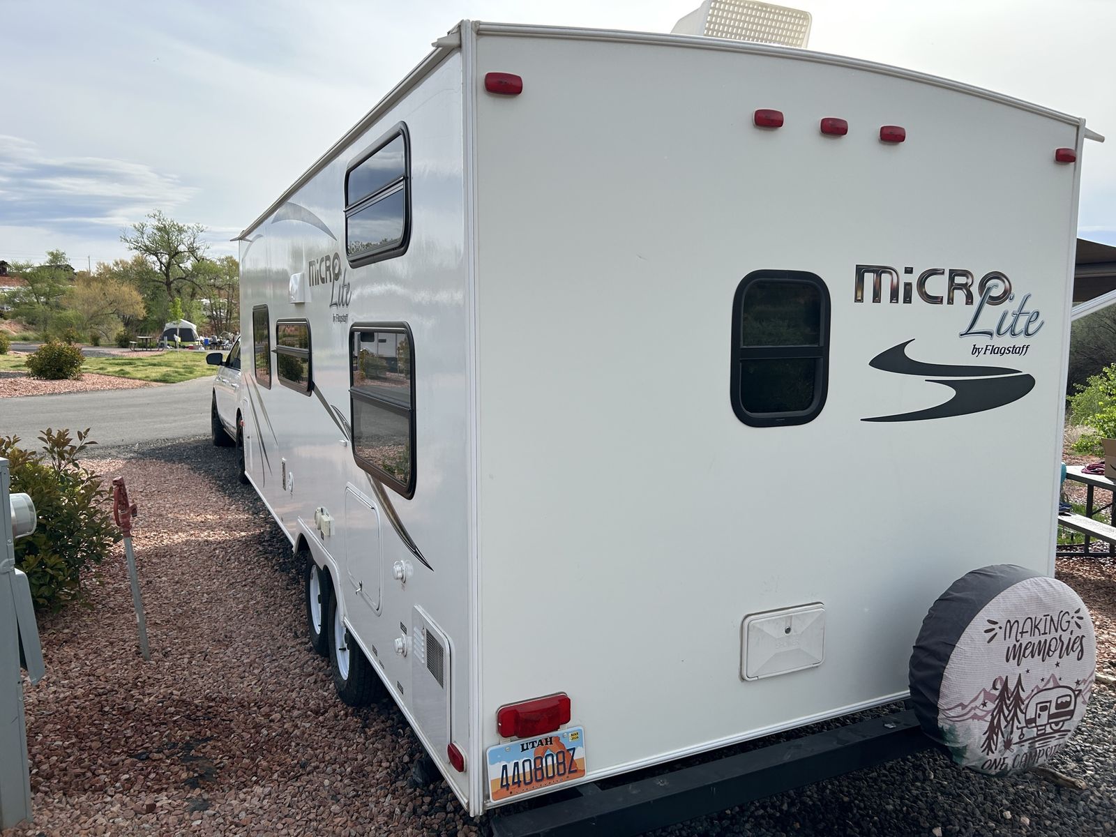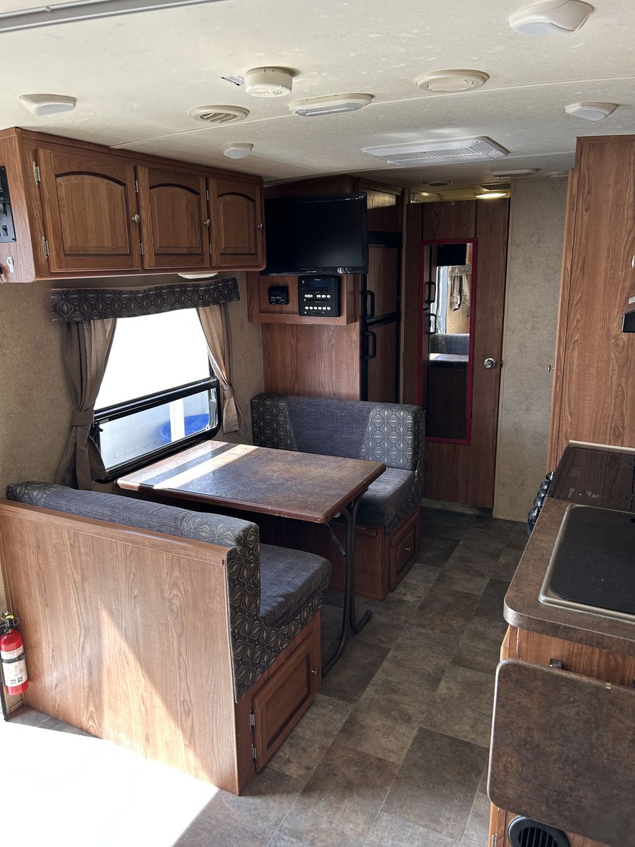 We are the second owners of this trailer. The only reason we’re selling is to get something a little bigger for our growing family. We just took it on a trip and everything works great! The camper has the Murphy bed that folds out over the sofa.