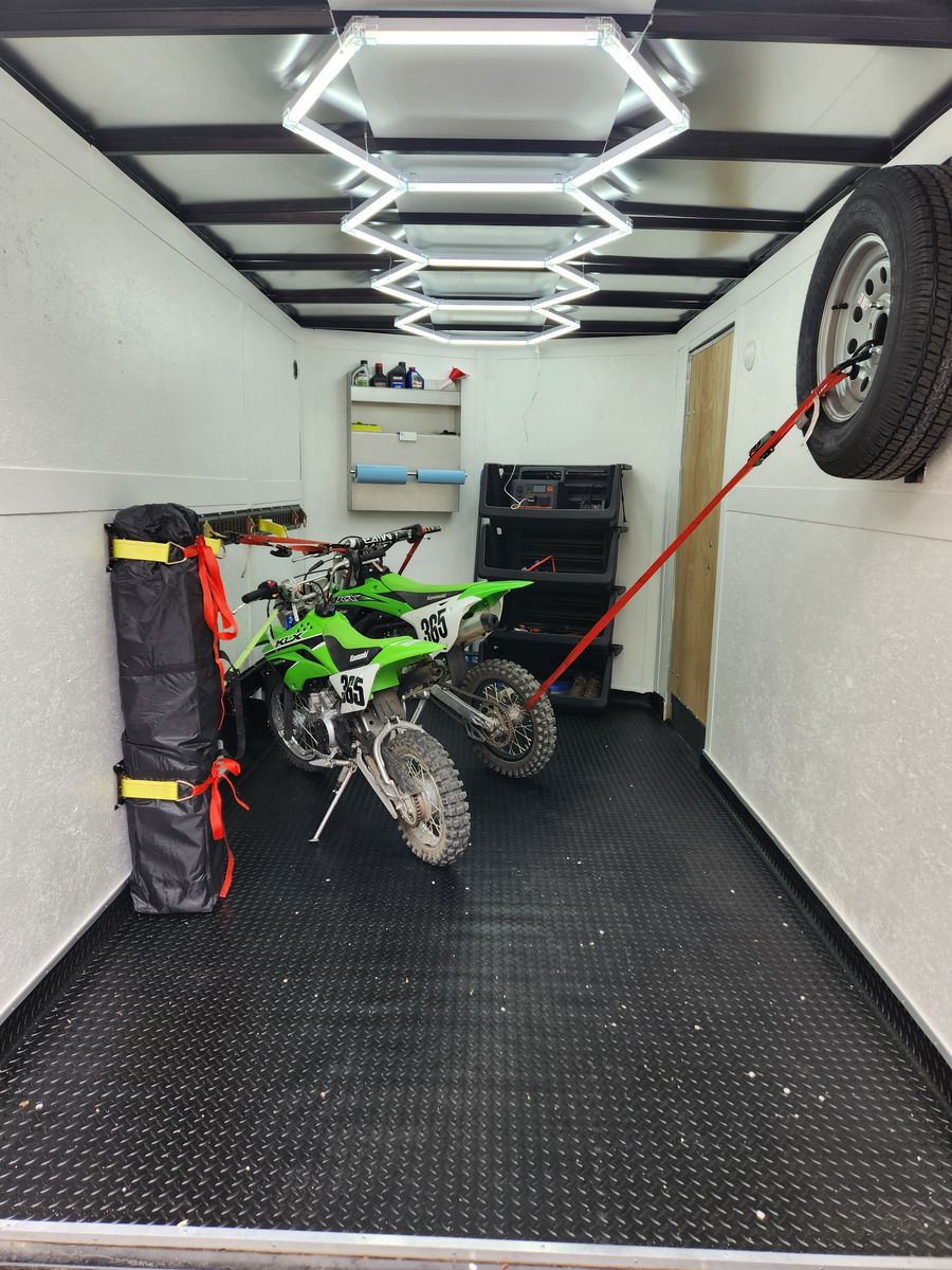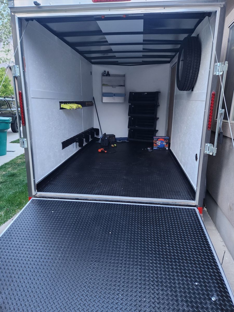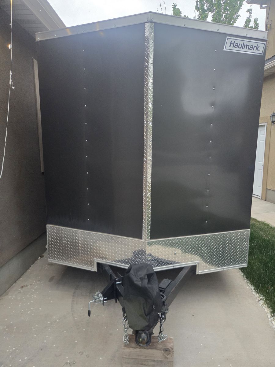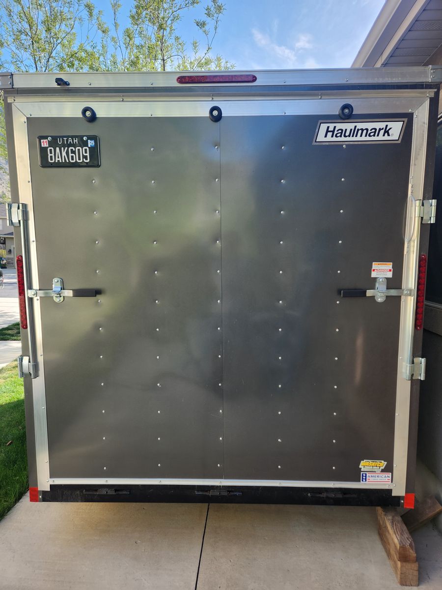 2024 Haulmark 7x12 Passport Trailer with less than 300 miles on the tires. Dual axel passenger side door with ramp for sale. No, the bikes and gear are not included, but if you are nice, you can keep the hex lights. Spare tire included.