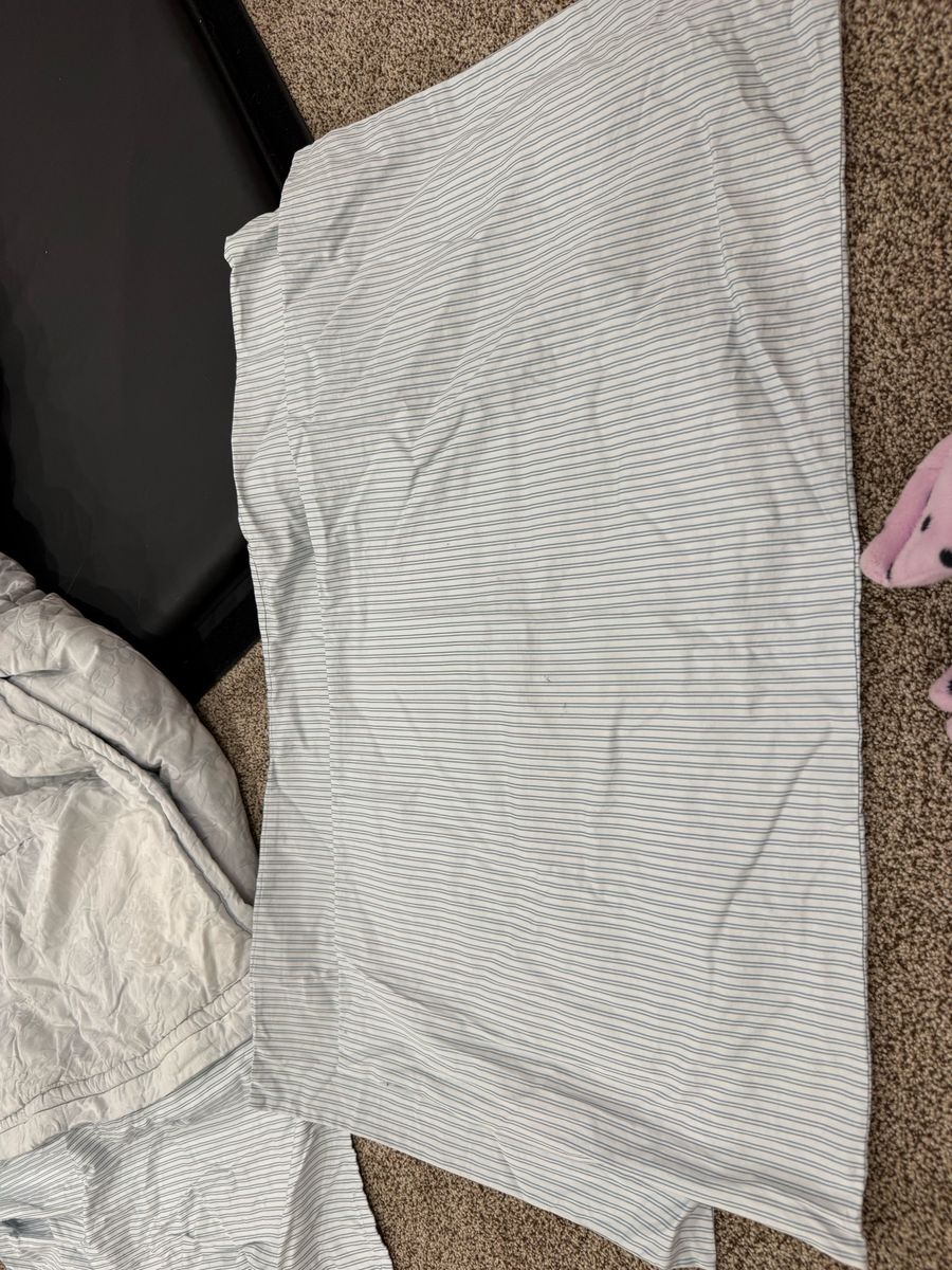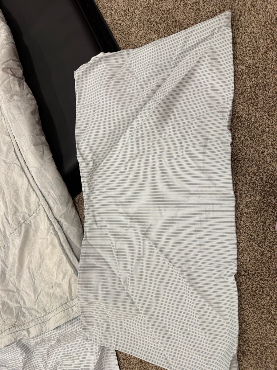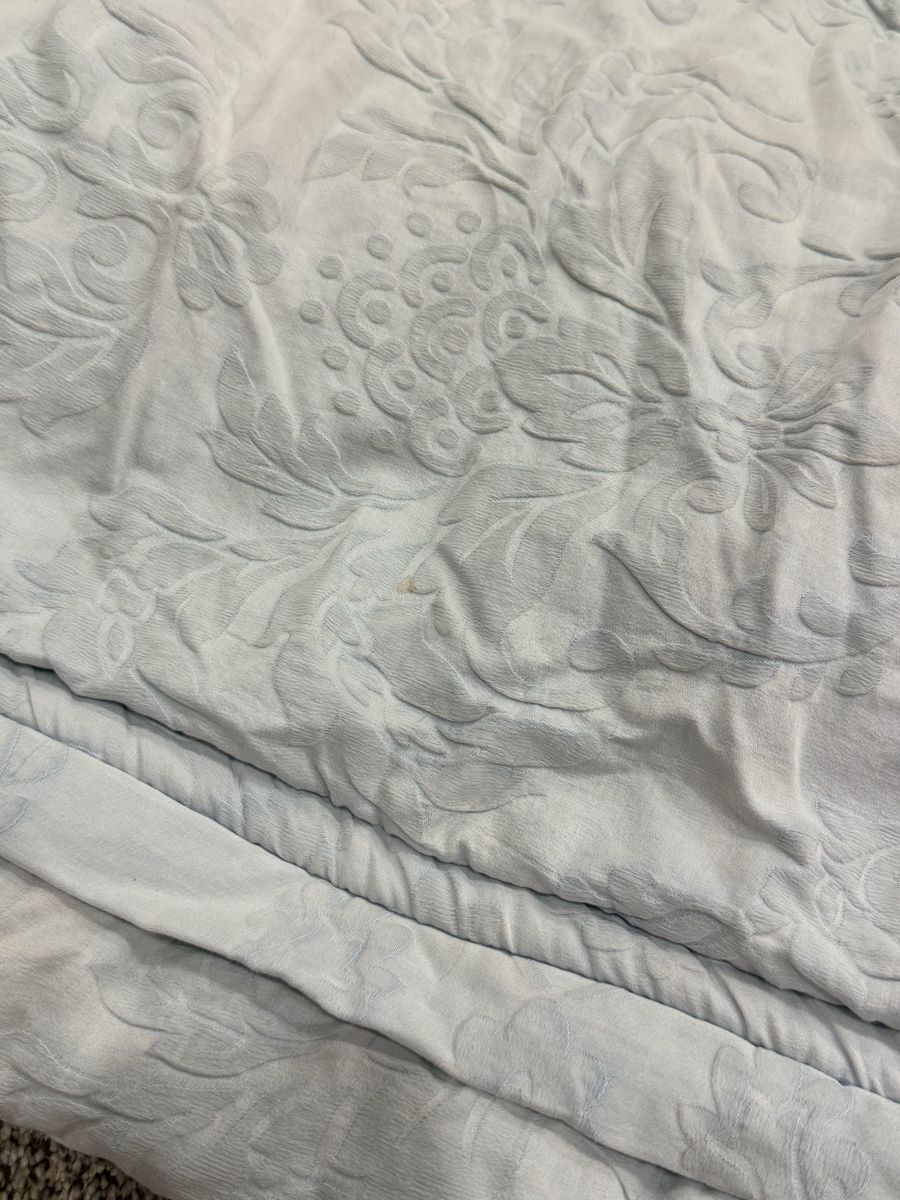 King Jane cotton. Has 2 shams and 2 cases, few faint stains on top and sham and some cooor fading on top. MAR49