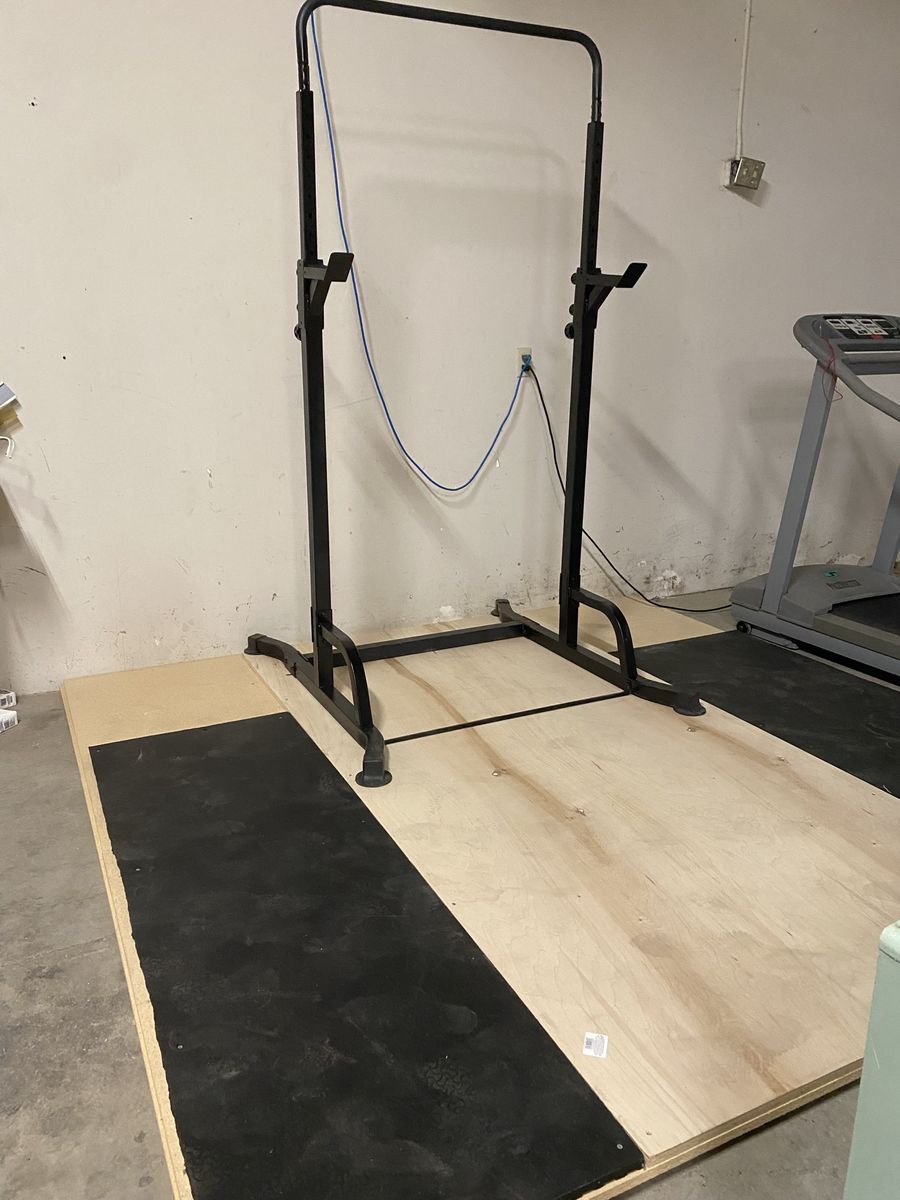 VenmoHeavy duty, weightlifting platform to drop heavy barbells, as well as squat rack and pull up bar and bike. Everything for 350$