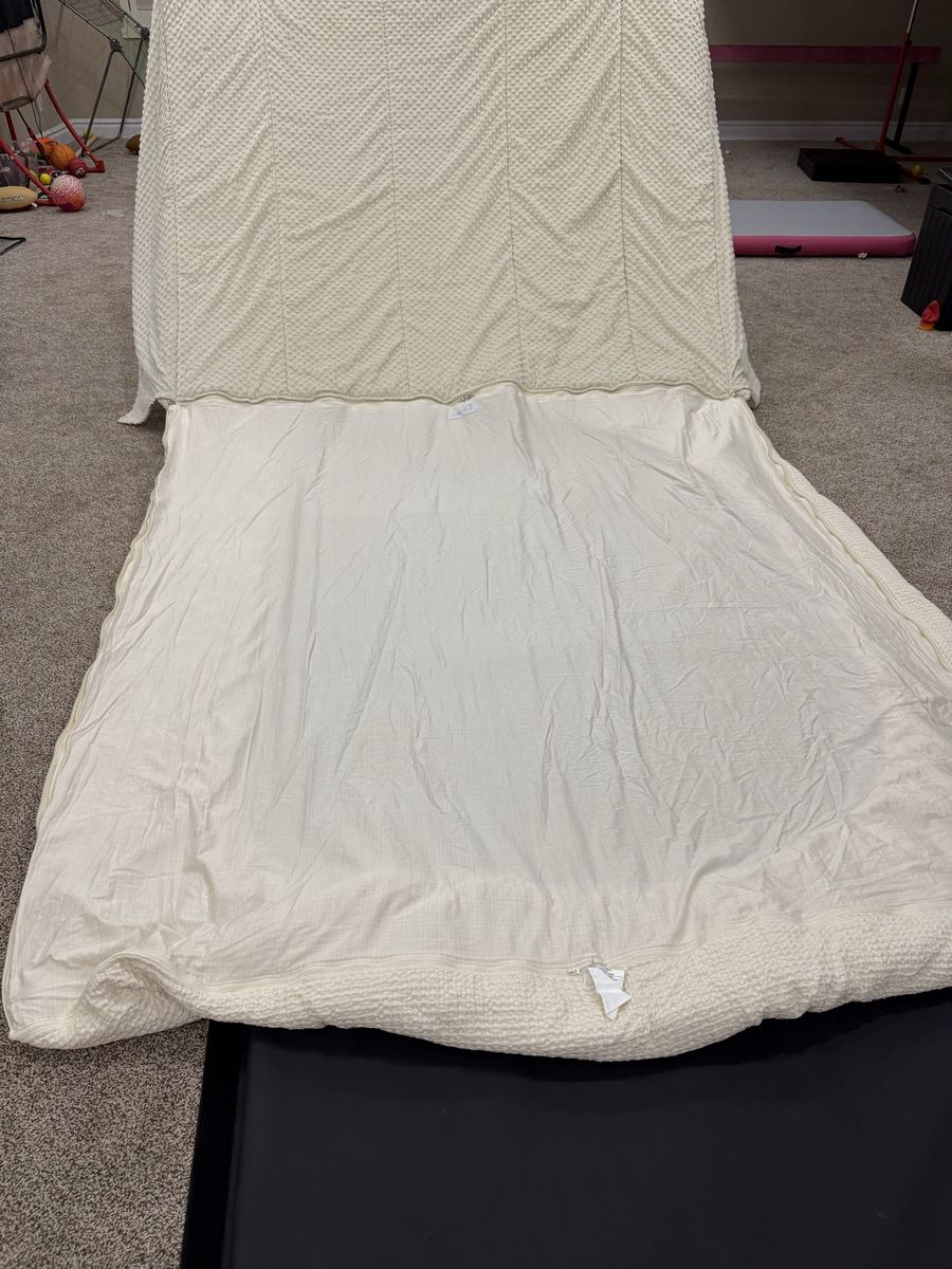King mollie Minky Zipbase. Has 2 shams and 2 cases and 2 sheets. Small hole on top. MAR51