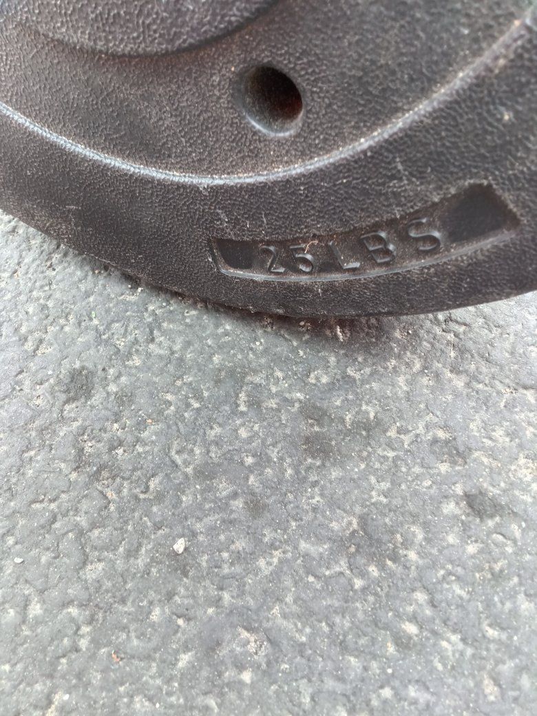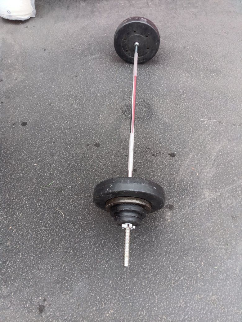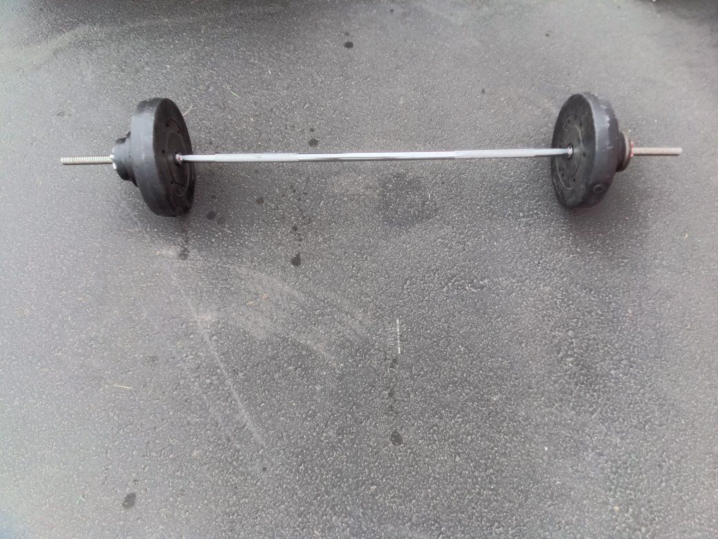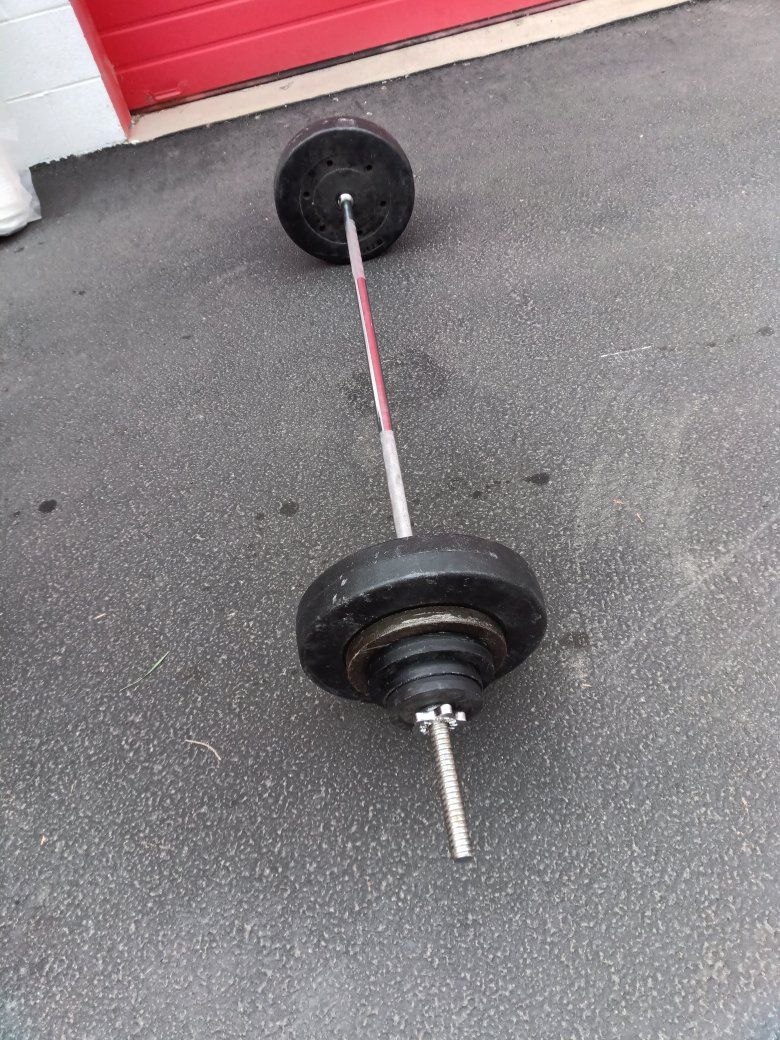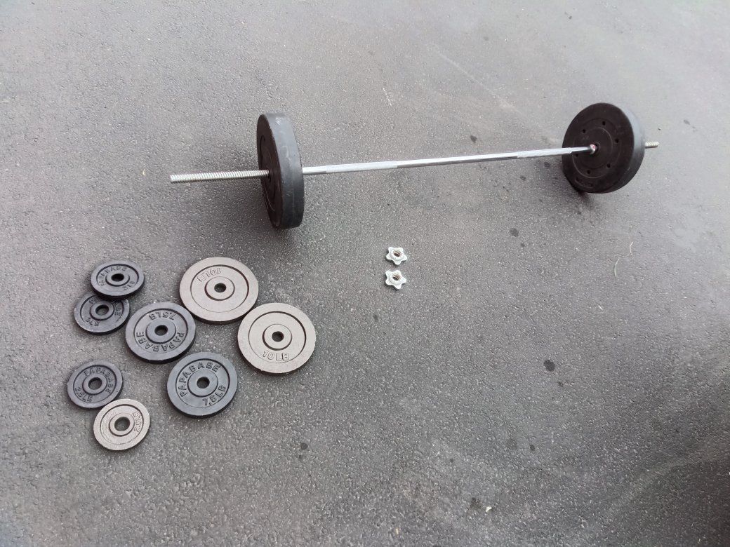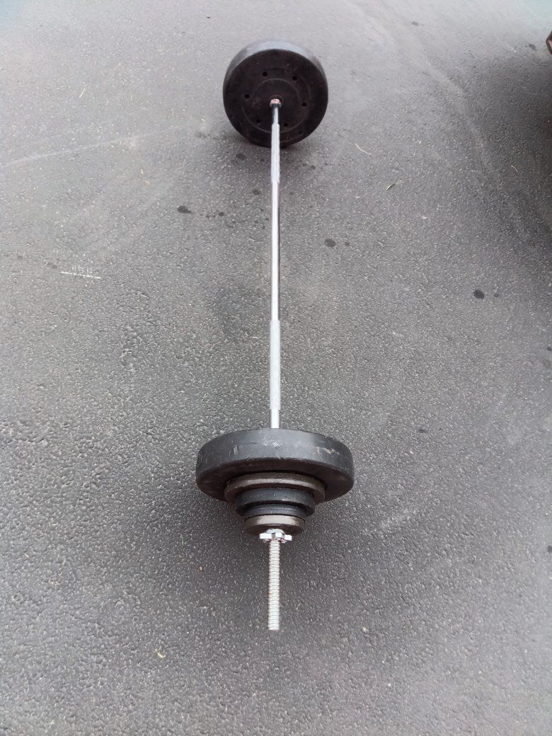 Barbell weight set total weight is just a little over a hundred and ten pounds including the bar! Plates goes as follows! 2= 25 lbs plastic covered Plates 2=10 lbs Steel Plates 2=7.5 lbs Steel Plates 2=3 lbs Steel Plates 2=2.5 lbs Steel Plates One 10lbs Barbell with 2 =Nut Cap ends!