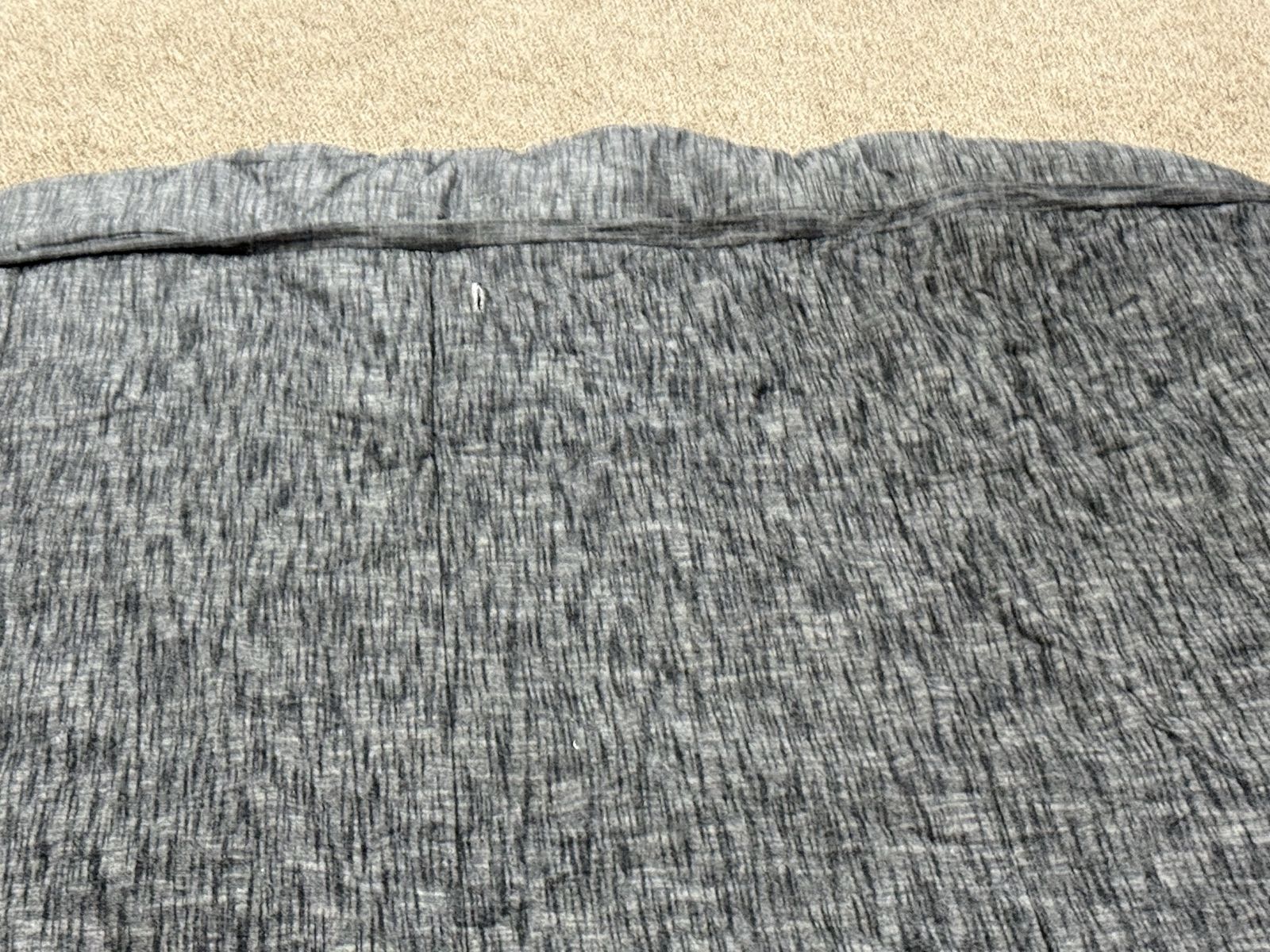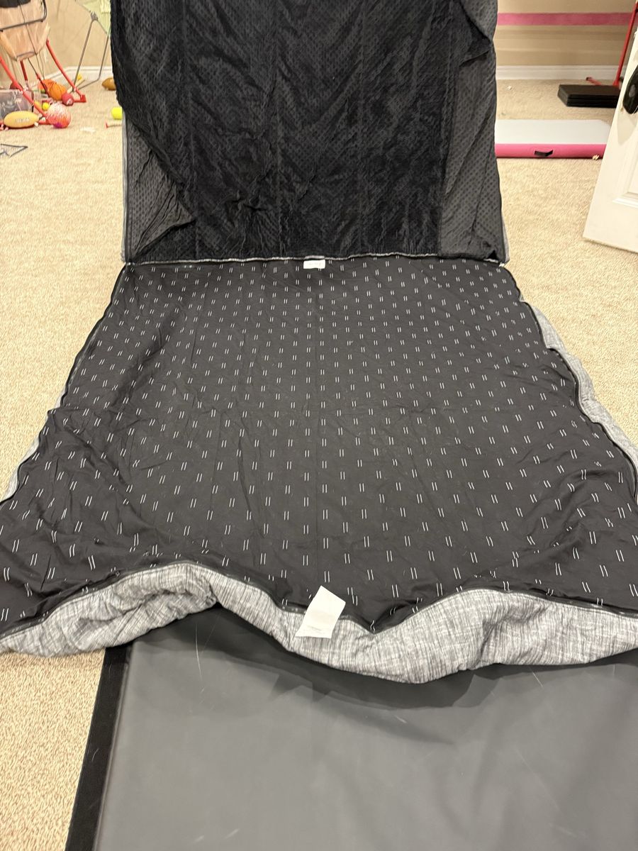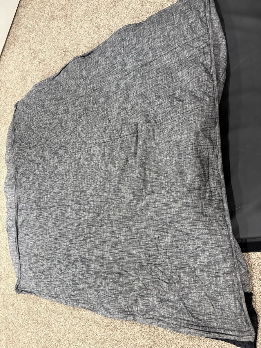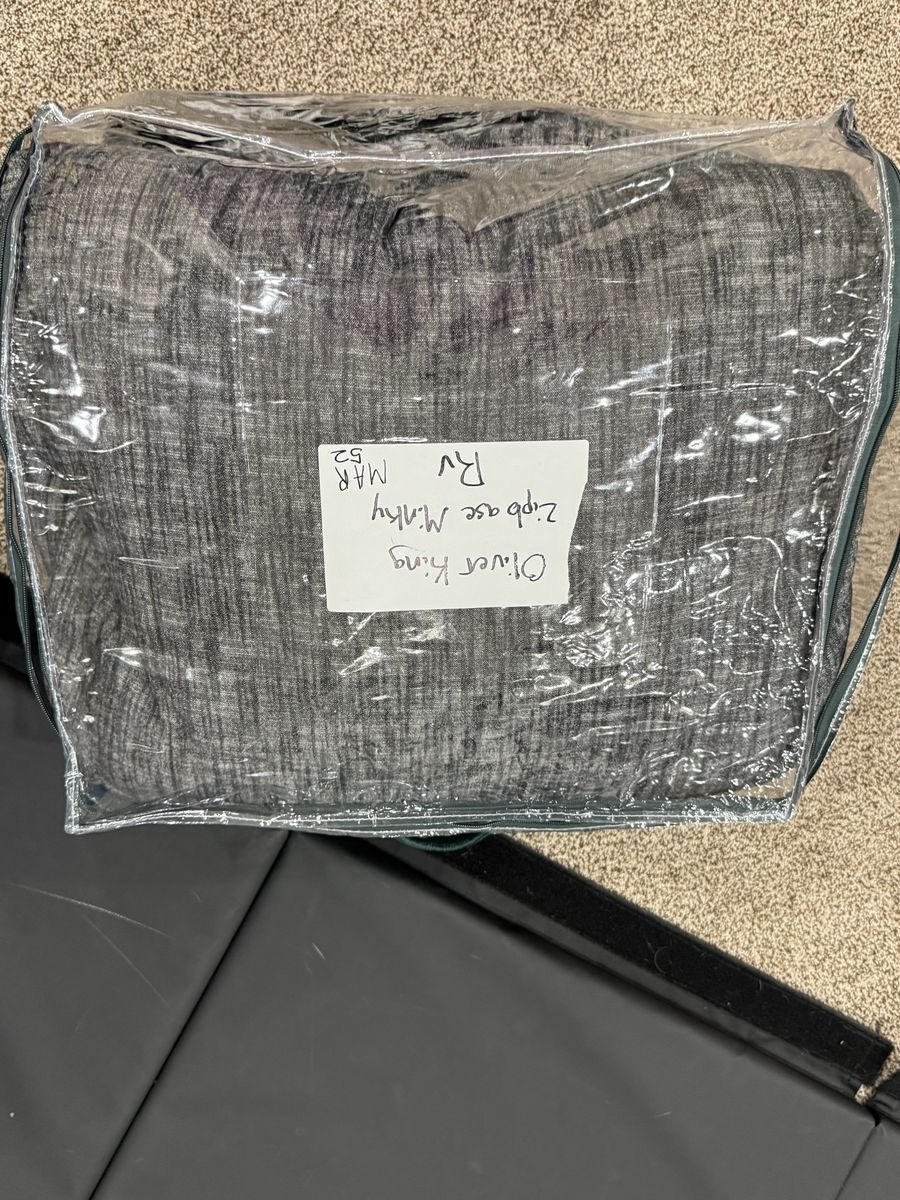 Has 2 shams and 2 cases and 2 sheets. Needs to be lint rolled/washed, has a hole on top towards bottom and some possible off color on top. MAR52