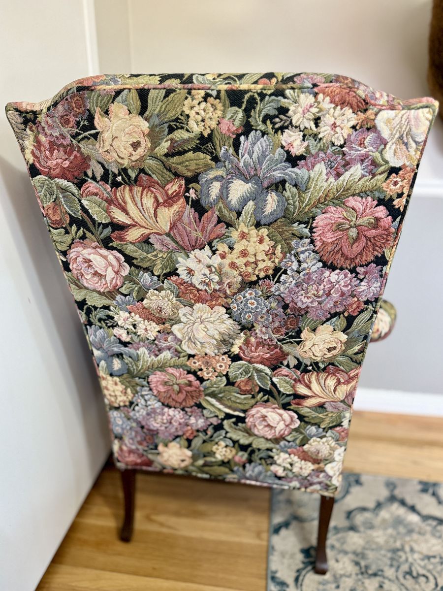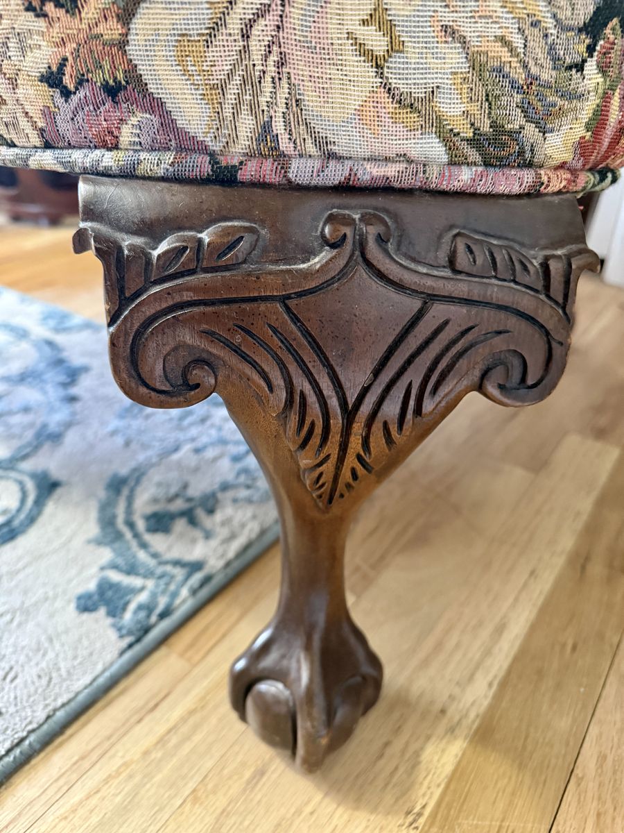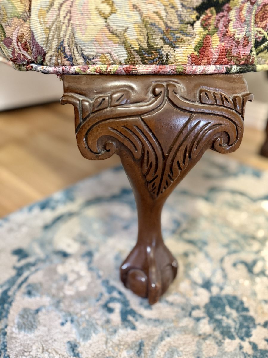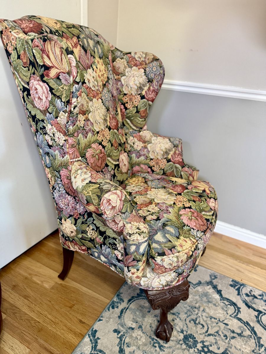 ZelleStunning traditional Queen Anne wingback chair featuring a vibrant multicolored floral tapestry upholstery on a dark background. Elegant carved dark wood frame with classic cabriole legs ending in detailed claw-and-ball feet. Comfortable rolled arms, high winged back, and supportive seat.