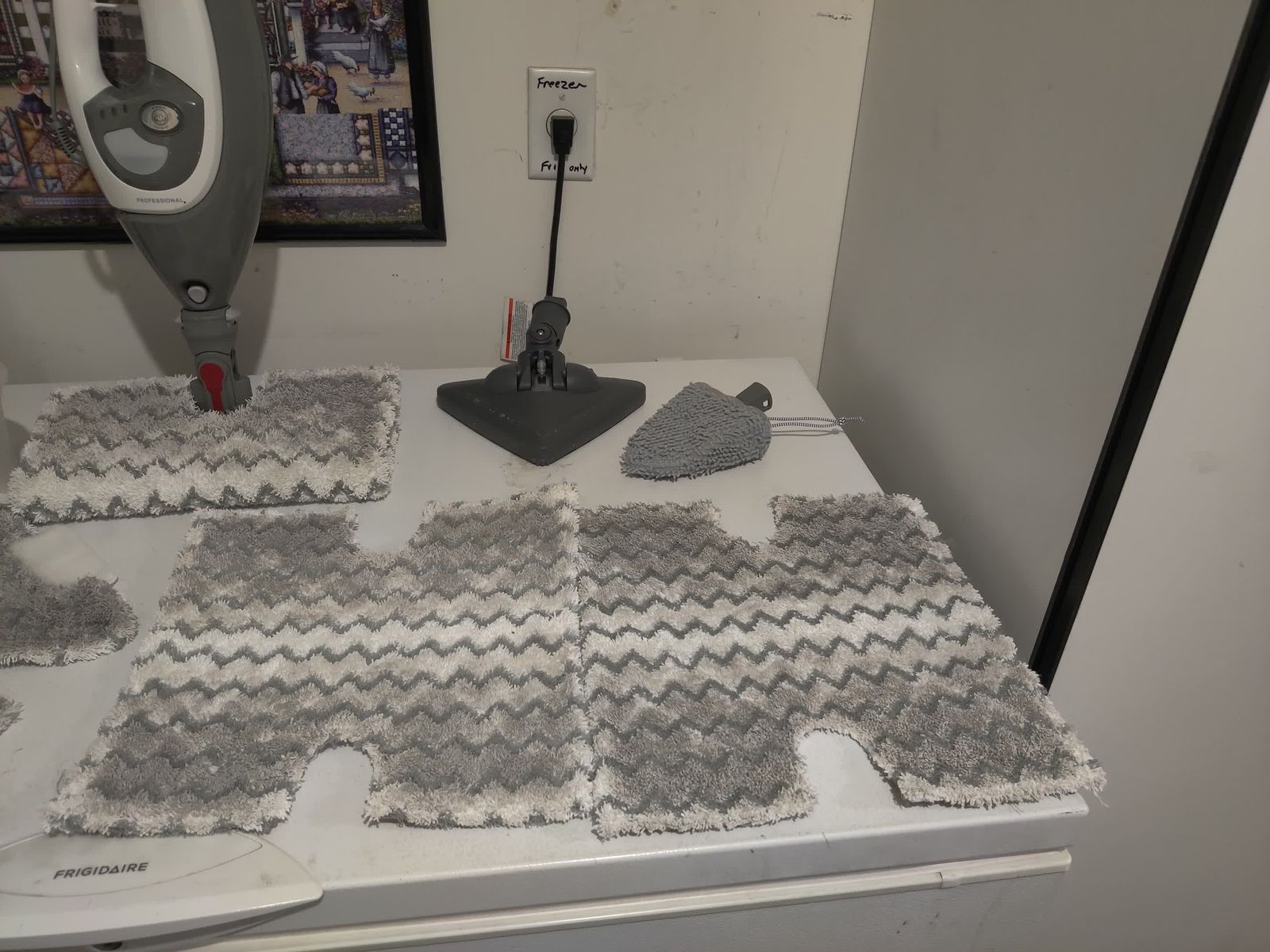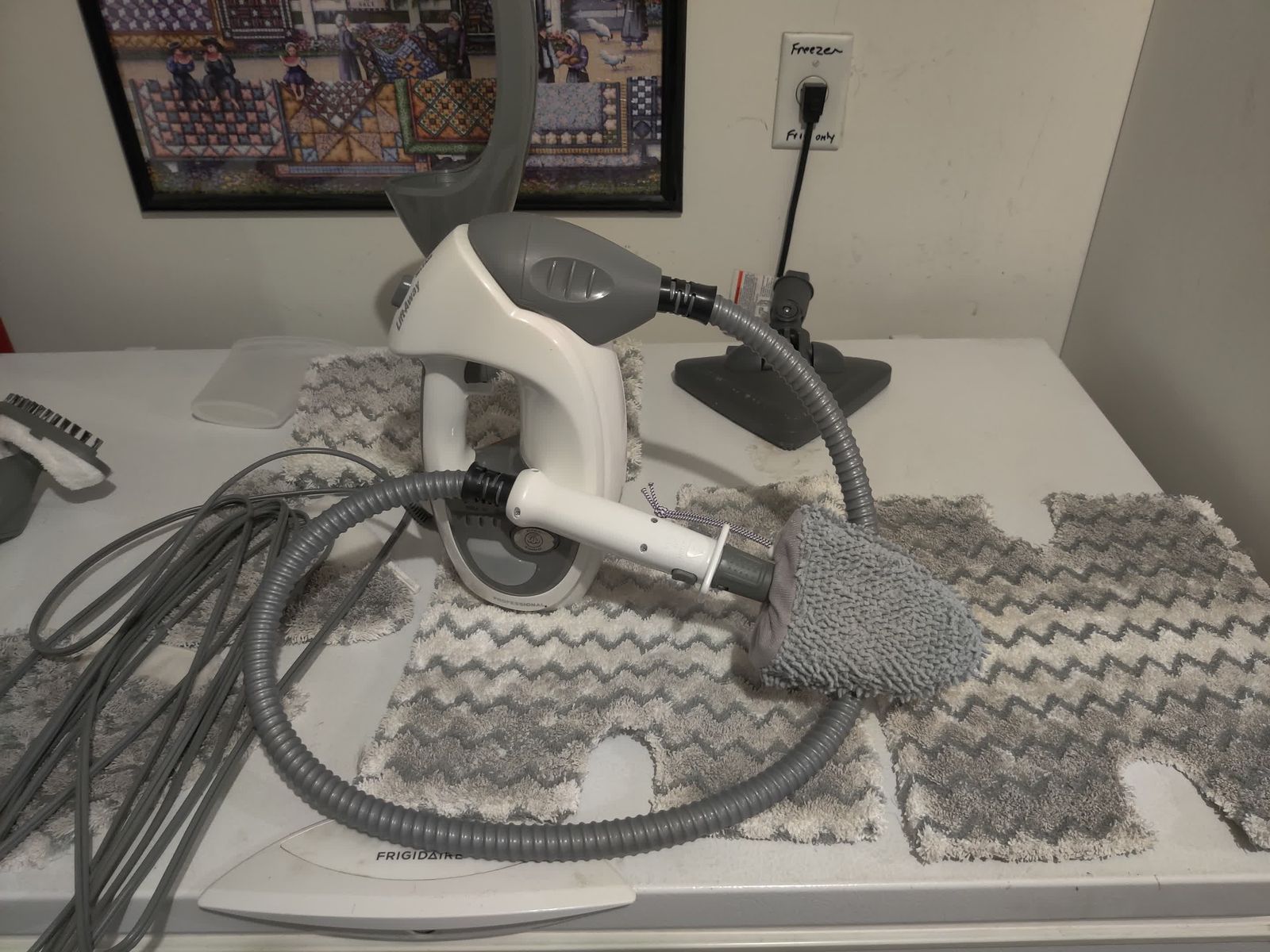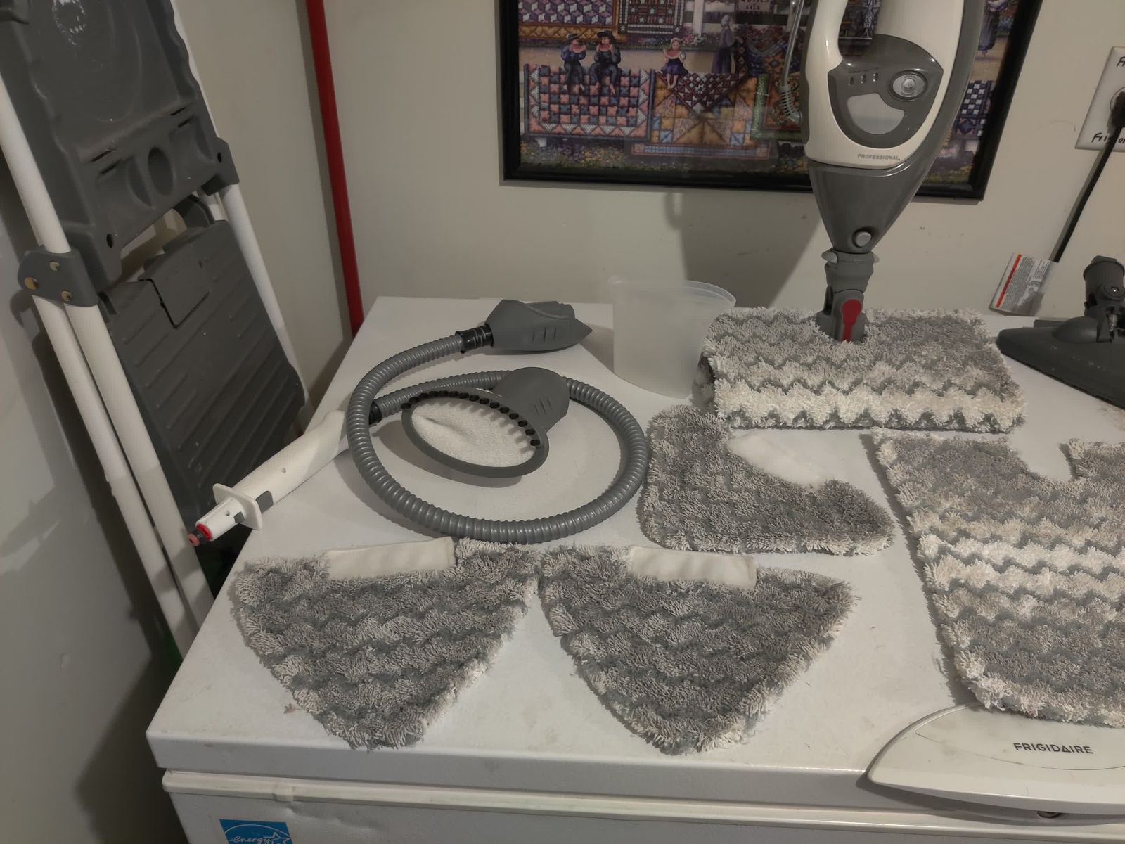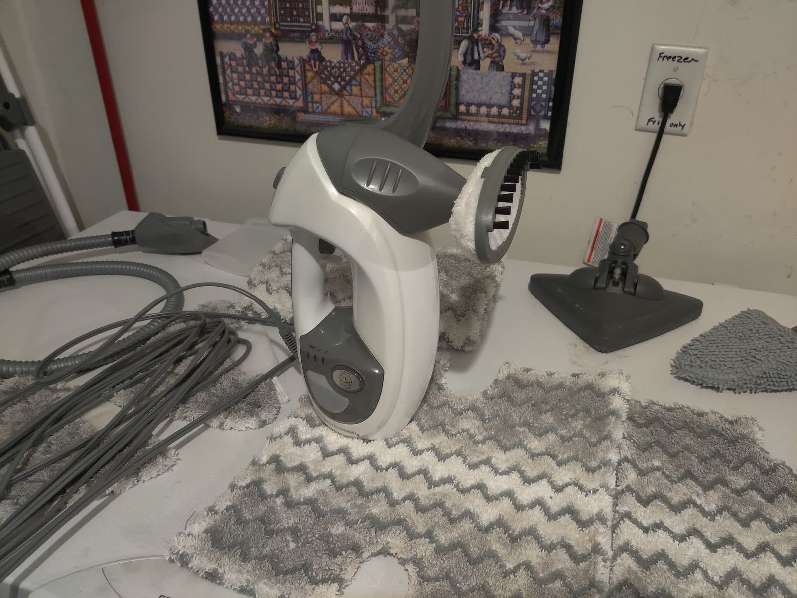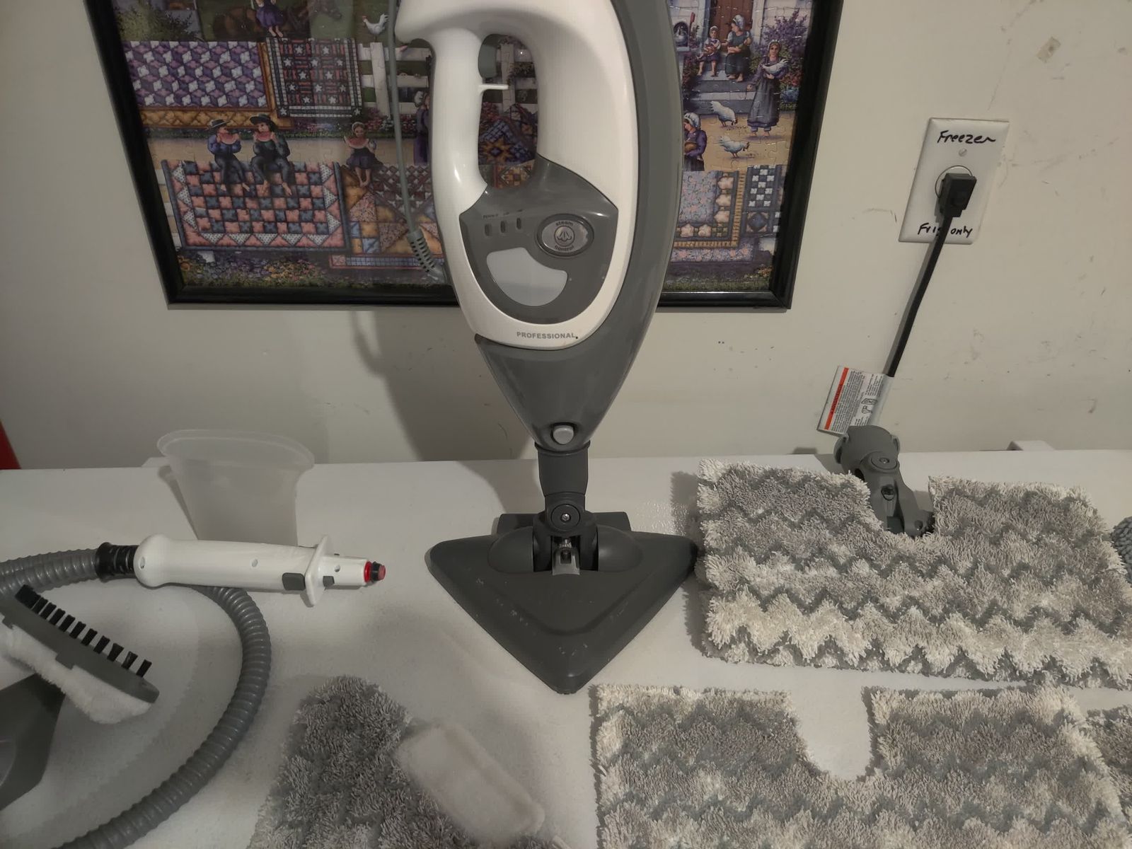 Comes with: double sided rectangular mop head, triangular mop head, 3 rectangular mop pads, 3 triangular mop pads, garment steamer (unused), hose, double sided scrub pad (unused), and a cup for filling the water tank.